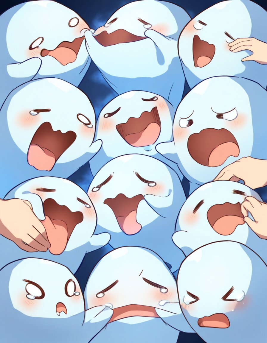 ghost, no humans, cheek pull, pov hands, face focus, face only, portrait, open mouth, wavy mouth, tear
