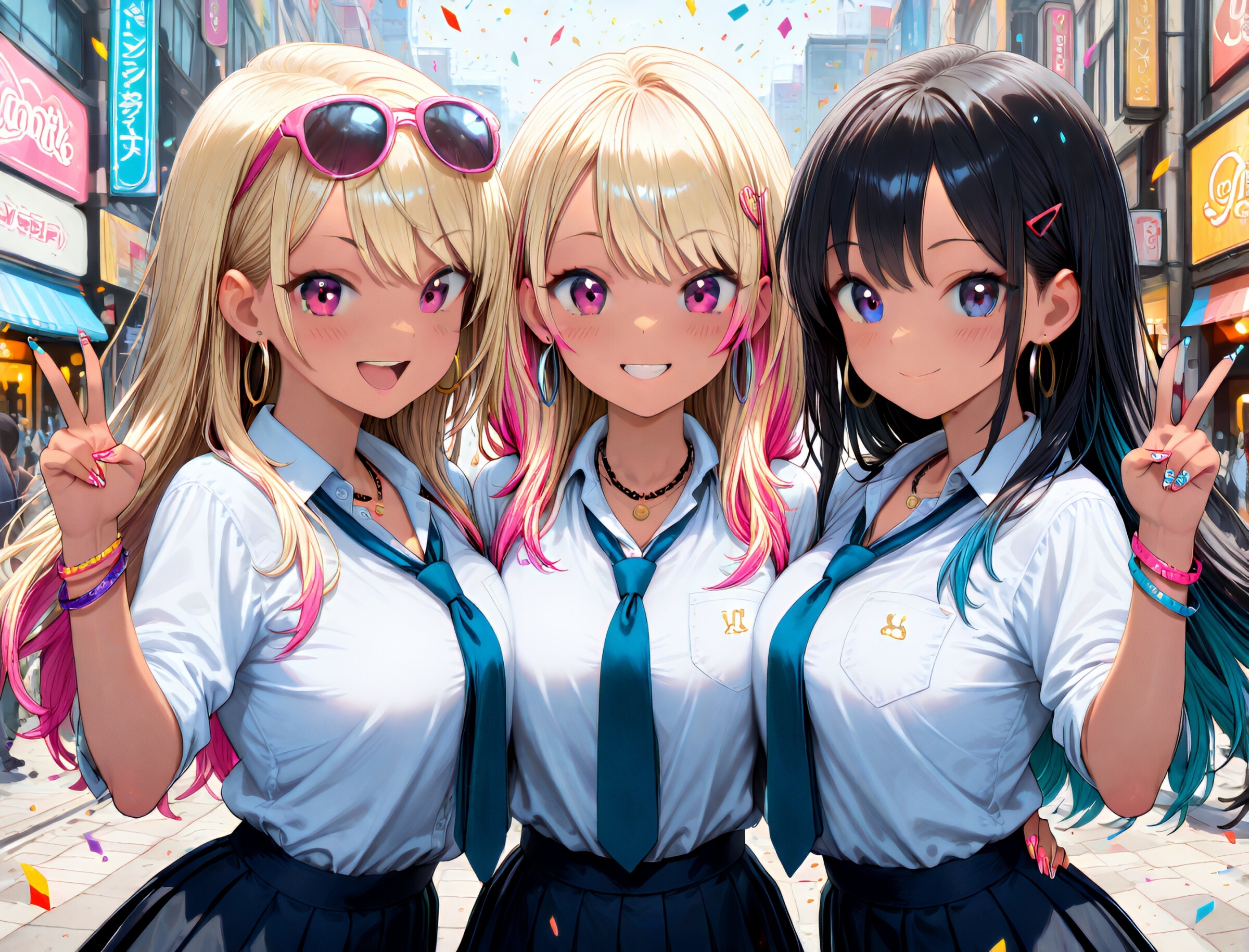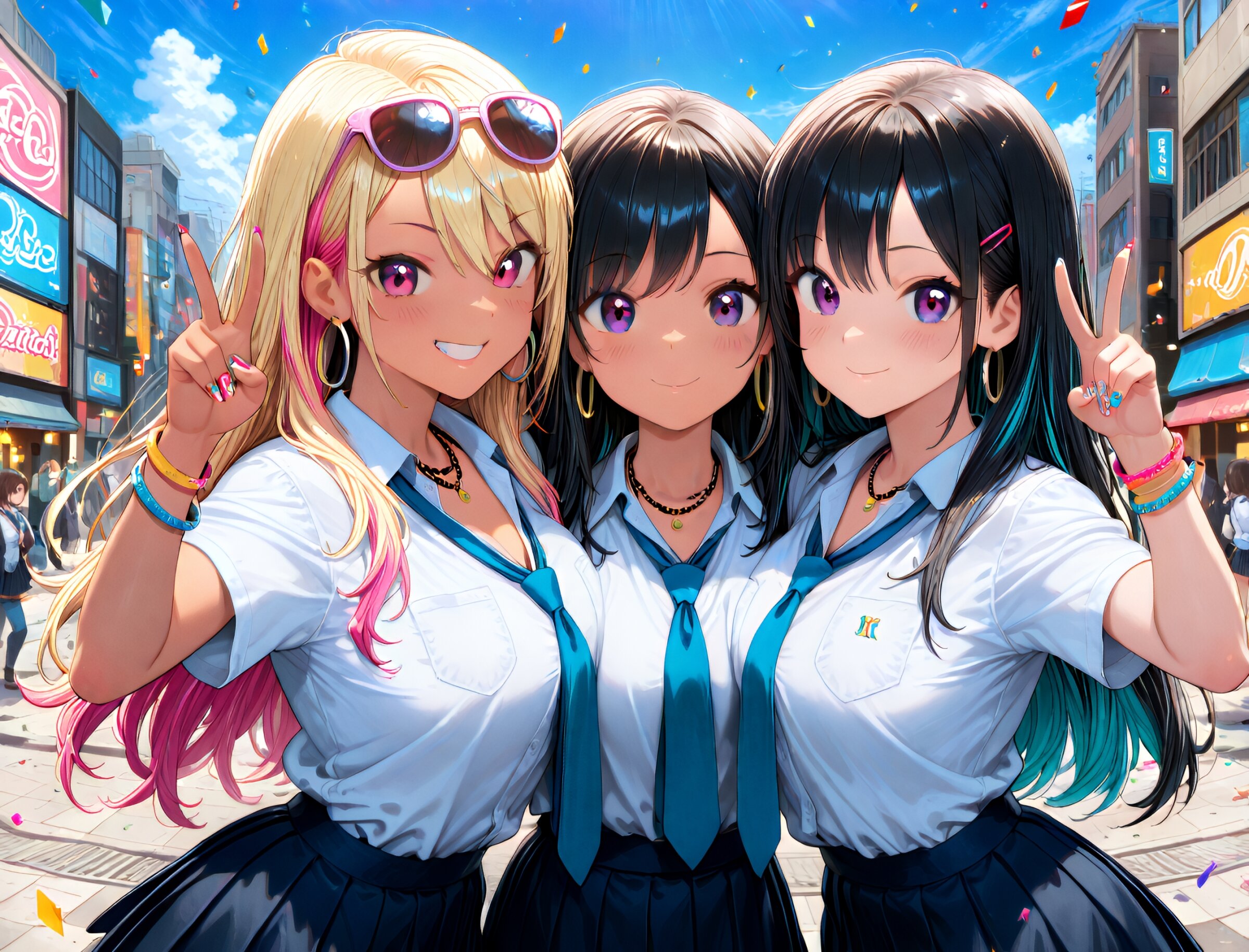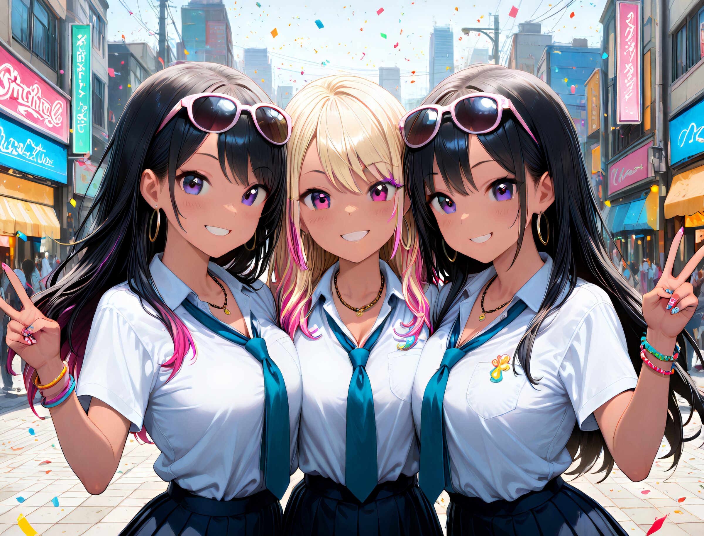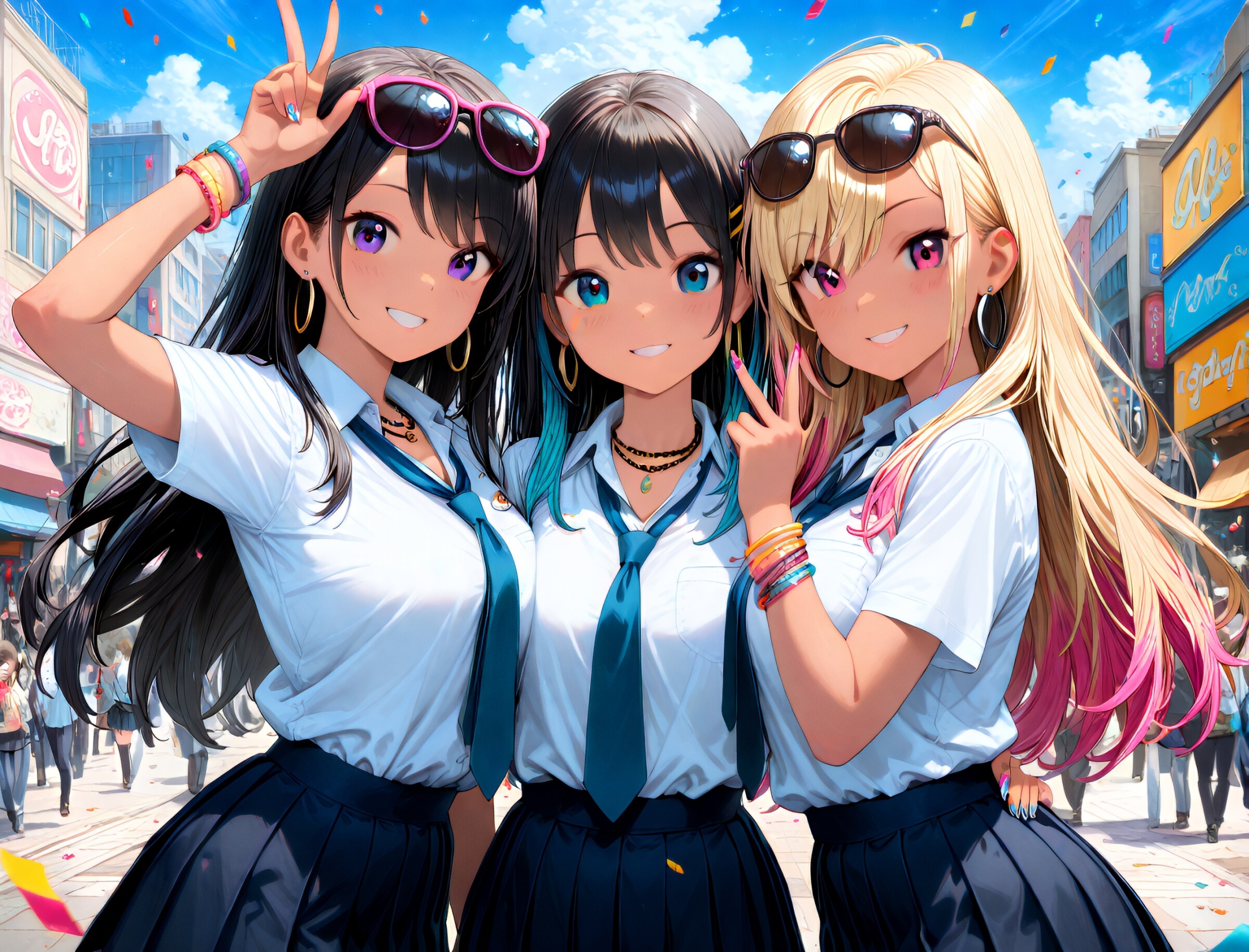 (upper body:1.8), (two gyaru girls:1.6), (standing side by side), (posing together:1.4), coordinated outfits, colorful accessories, black hair and colorful highlights, playful city scene, trendy school uniform-inspired fashion, loose tie, short pleated skirt with flashy patterns, sunglasses on head, hoop earrings, layered necklaces, bright bracelets, vibrant nail art, smiling confidently, peace sign pose, dynamic composition, confetti-filled urban street background, energetic and cheerful expressions, camera angle slightly tilted for dramatic effect masterpiece, best quality, ultra-detailed, cinematic lighting, 8k resolution, very aesthetic, intricate details from side, looking at viewer, dynamic pose, dynamic angle, masterpiece, best quality, very aesthetic, <lora:noobai_ep11_stabilizer_v0.11_fp16:0.7> <lora:StS-Illustrious-Detail-Slider-v1.0:2.> <lora:sdxl-hairdetailer_02:2> <lora:xl_more_art-full_v1:1.4> <lora:spo_sdxl_10ep_4k-data_lora_webui:0.7>