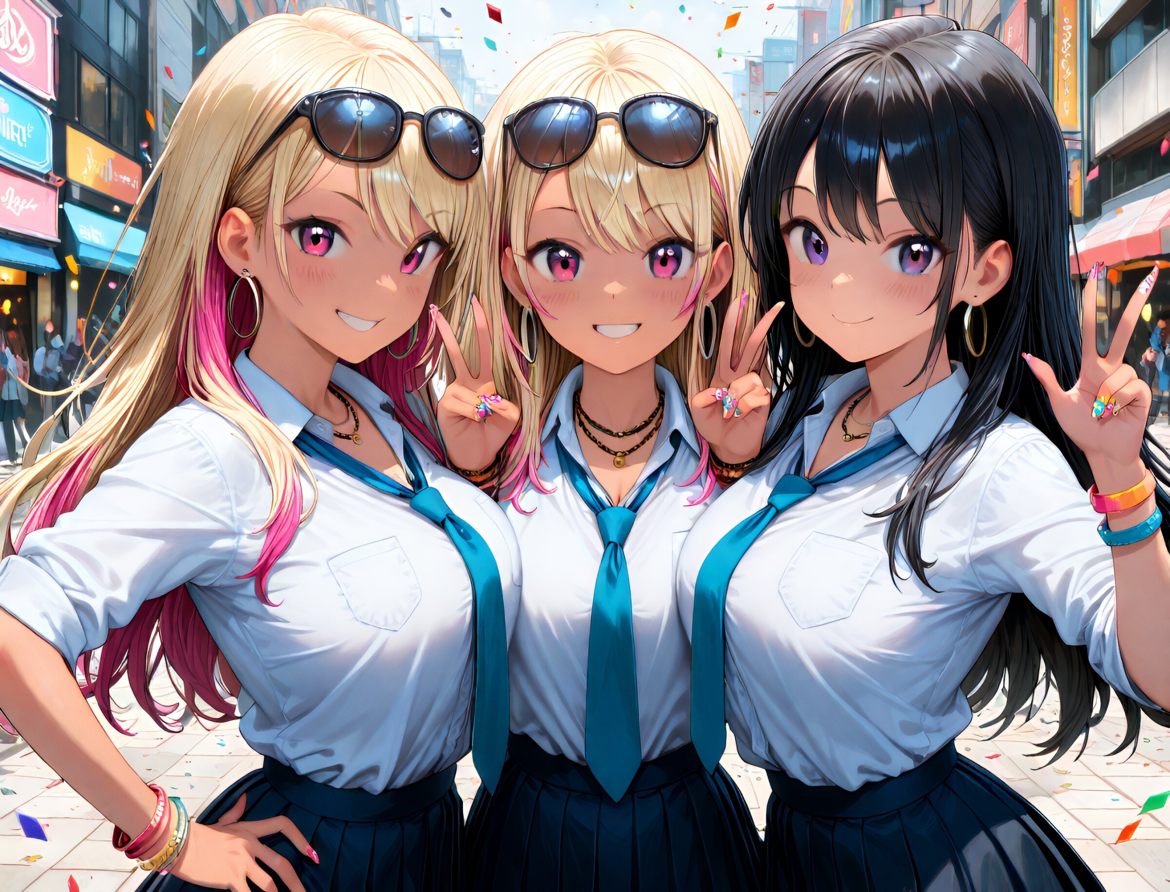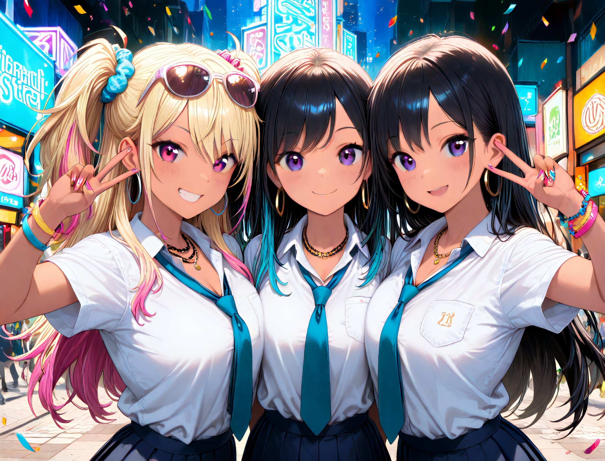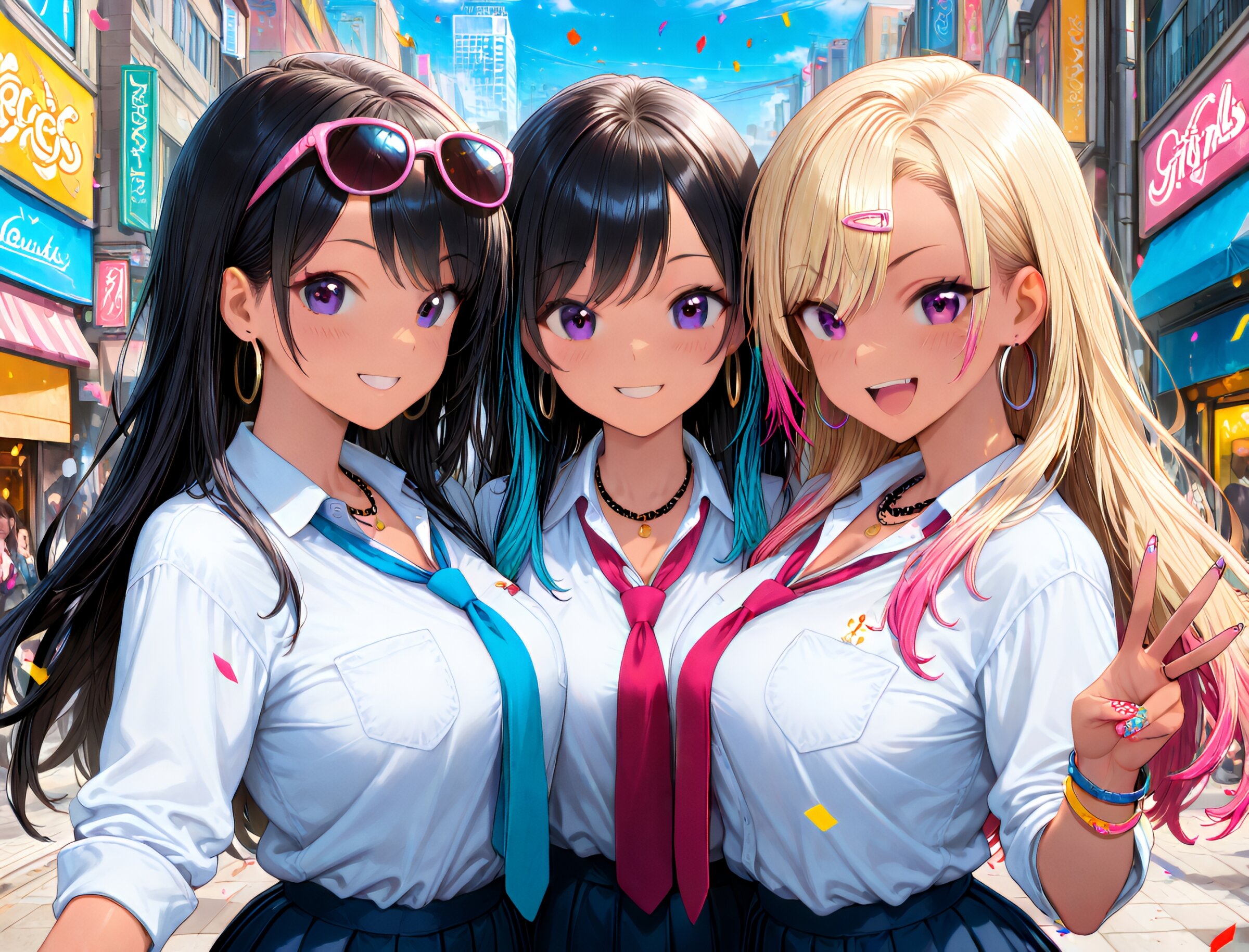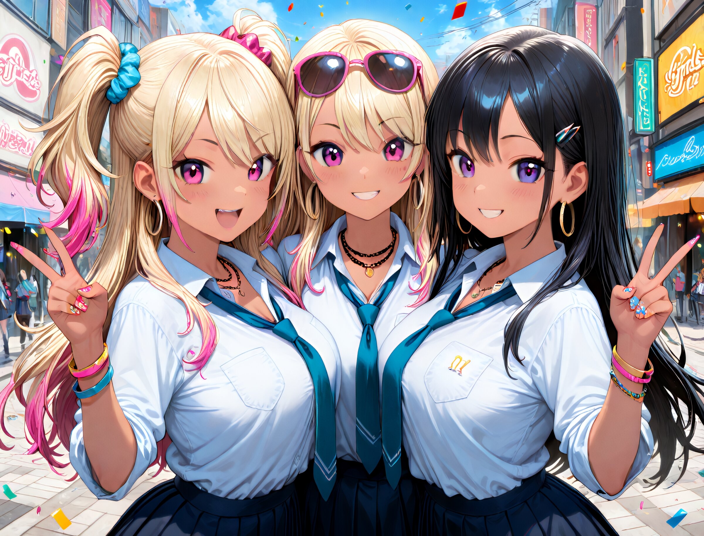 (upper body:1.8), (two gyaru girls:1.6), (standing side by side), (posing together:1.4), coordinated outfits, colorful accessories, black hair and colorful highlights, playful city scene, trendy school uniform-inspired fashion, loose tie, short pleated skirt with flashy patterns, sunglasses on head, hoop earrings, layered necklaces, bright bracelets, vibrant nail art, smiling confidently, peace sign pose, dynamic composition, confetti-filled urban street background, energetic and cheerful expressions, camera angle slightly tilted for dramatic effect masterpiece, best quality, ultra-detailed, cinematic lighting, 8k resolution, very aesthetic, intricate details from side, looking at viewer, dynamic pose, dynamic angle, masterpiece, best quality, very aesthetic, <lora:noobai_ep11_stabilizer_v0.11_fp16:0.7> <lora:StS-Illustrious-Detail-Slider-v1.0:2.> <lora:sdxl-hairdetailer_02:2> <lora:xl_more_art-full_v1:1.4> <lora:spo_sdxl_10ep_4k-data_lora_webui:0.7>