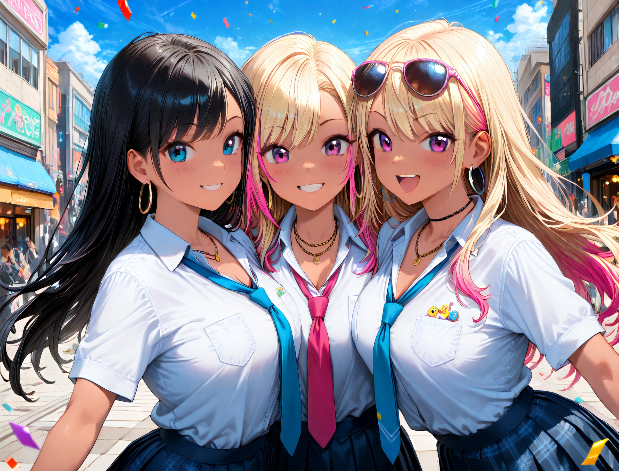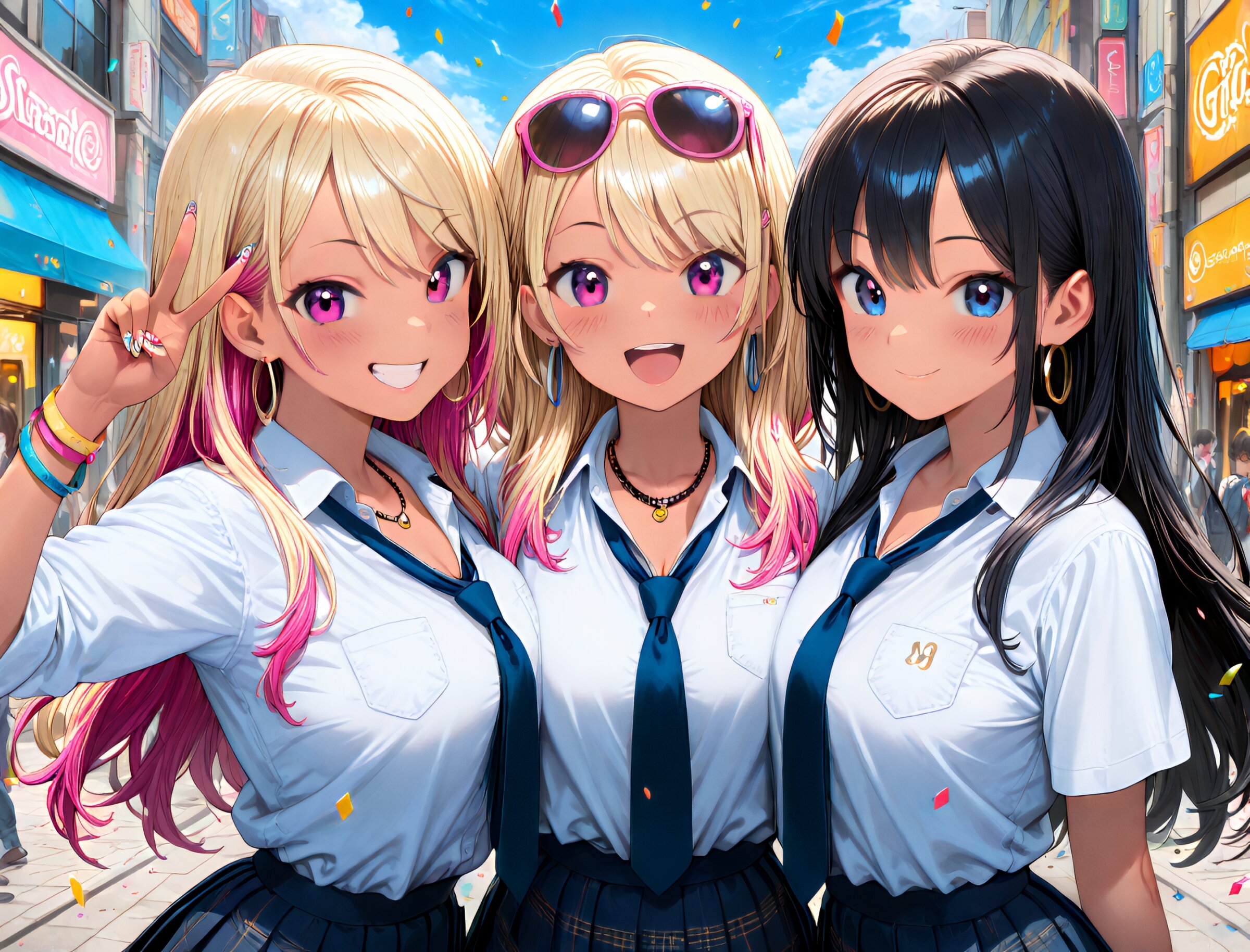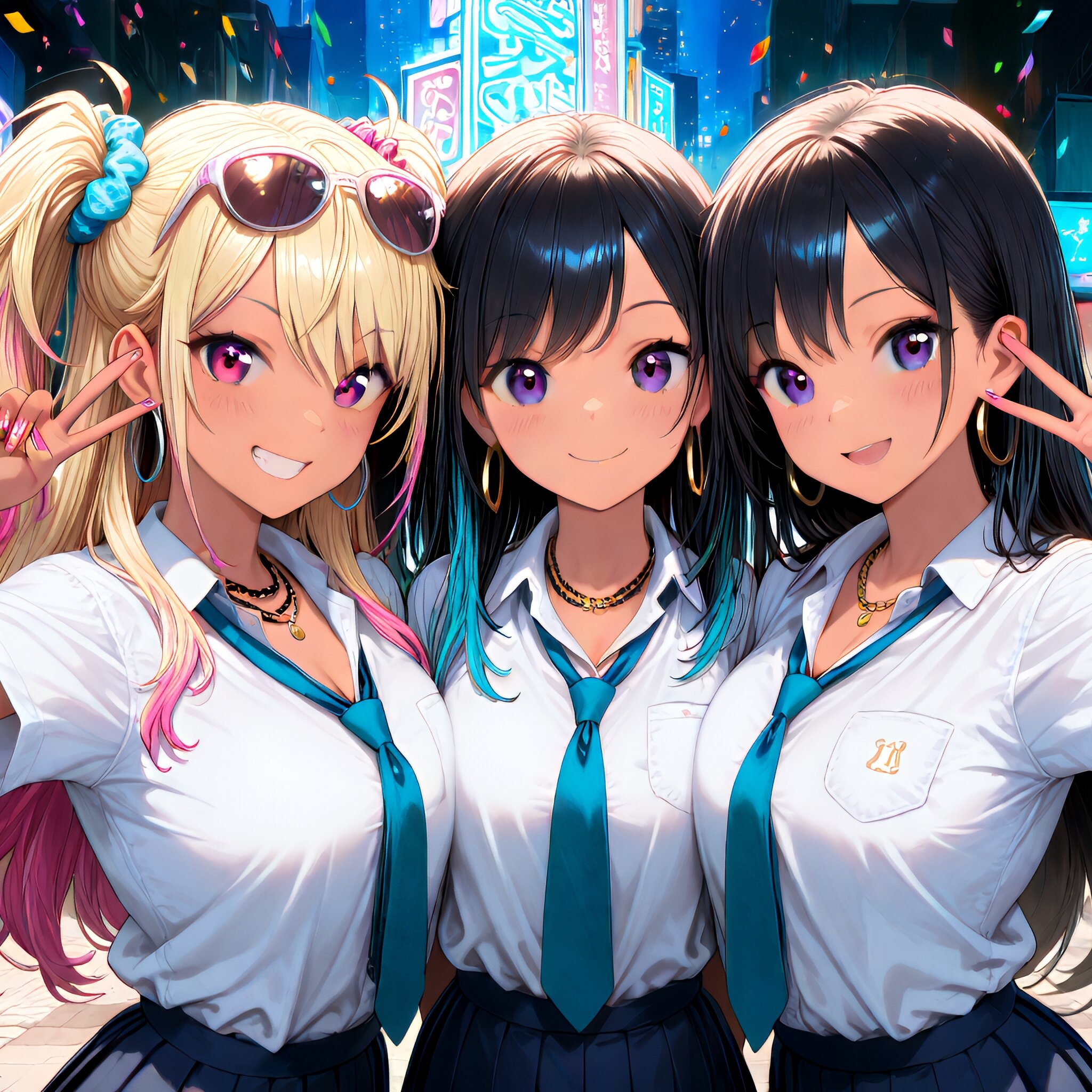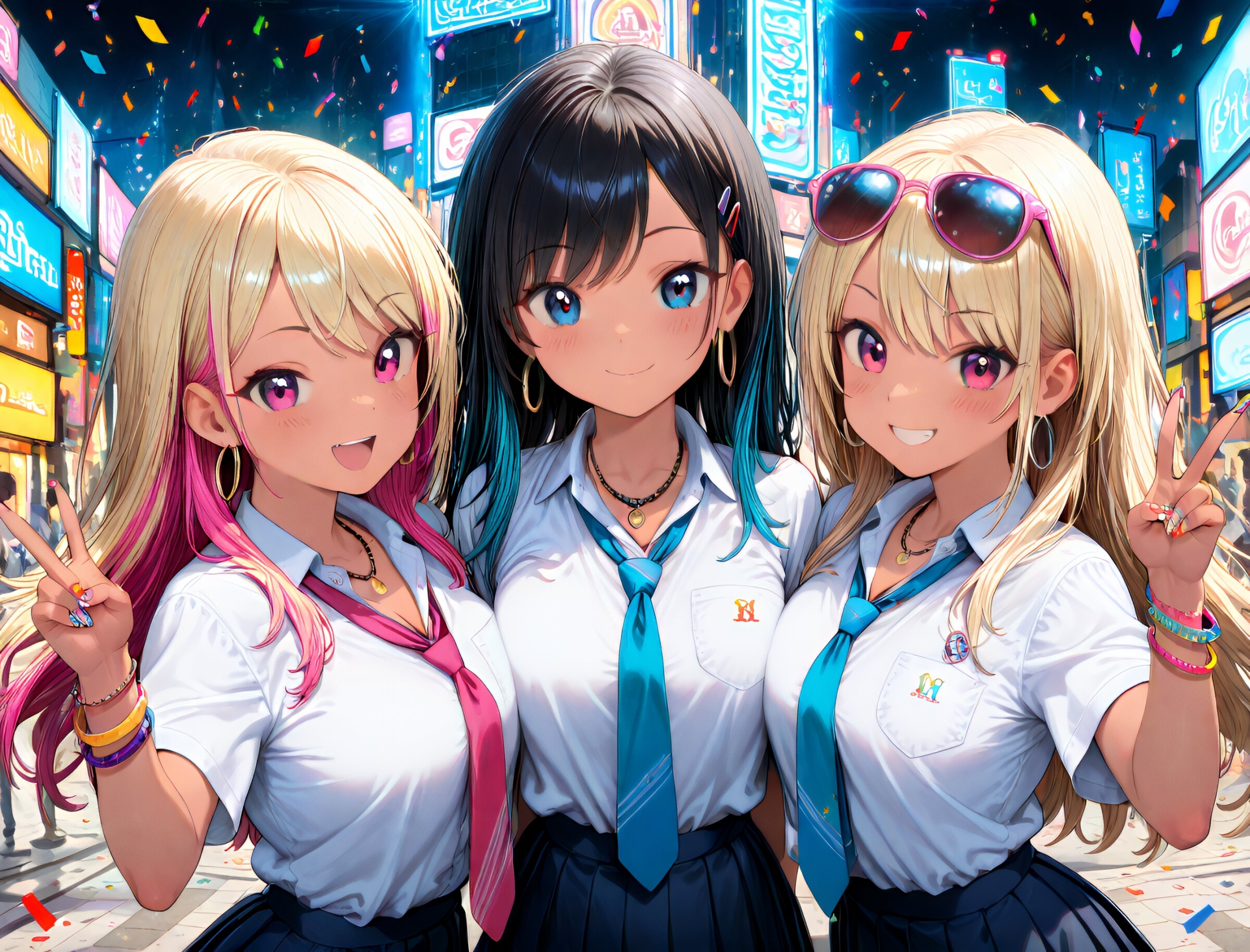 (upper body:1.8), (two gyaru girls:1.6), (standing side by side), (posing together:1.4), coordinated outfits, colorful accessories, black hair and colorful highlights, playful city scene, trendy school uniform-inspired fashion, loose tie, short pleated skirt with flashy patterns, sunglasses on head, hoop earrings, layered necklaces, bright bracelets, vibrant nail art, smiling confidently, peace sign pose, dynamic composition, confetti-filled urban street background, energetic and cheerful expressions, camera angle slightly tilted for dramatic effect masterpiece, best quality, ultra-detailed, cinematic lighting, 8k resolution, very aesthetic, intricate details from side, looking at viewer, dynamic pose, dynamic angle, masterpiece, best quality, very aesthetic, <lora:noobai_ep11_stabilizer_v0.11_fp16:0.7> <lora:StS-Illustrious-Detail-Slider-v1.0:2.> <lora:sdxl-hairdetailer_02:2> <lora:xl_more_art-full_v1:1.4> <lora:spo_sdxl_10ep_4k-data_lora_webui:0.7>
