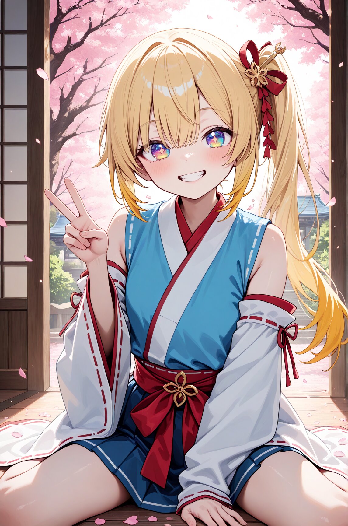 More creative,more creative,vivid,anime illustration,expressionless,masterpiece,highest quality,high resolution,more details,more accurate,HDR,UHR,8K,16K,32K,2D,blonde,big red ribbon,side ponytail,neon blue eyes,rainbow eyes,crescent eyes,round eyes,blue shrine maiden costume with long sleeves,smiling,blue clothes,mouth wide,teeth visible,cute eyes,cherry blossom petals,happy,smiling,peace display with left hand,little girl,mini skirt,morning,Japanese style,sleeves separate,white sleeves,big lines,very big lines,hair ornament,masterpiece,highest quality,very mysterious,latest,AI generation,CG synthesis realistic background,five fingers accurate,beautiful hands,beautiful skin,crescent eyes,beautiful eyes,rainbow eyes,round eyes,white skin,attractive,seductive,sexy,, masterpiece, best quality, newest, very awa