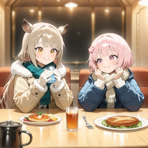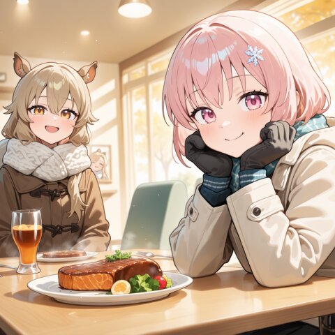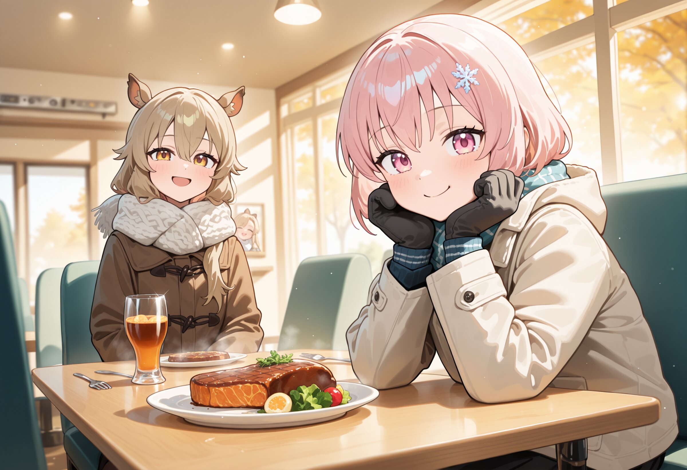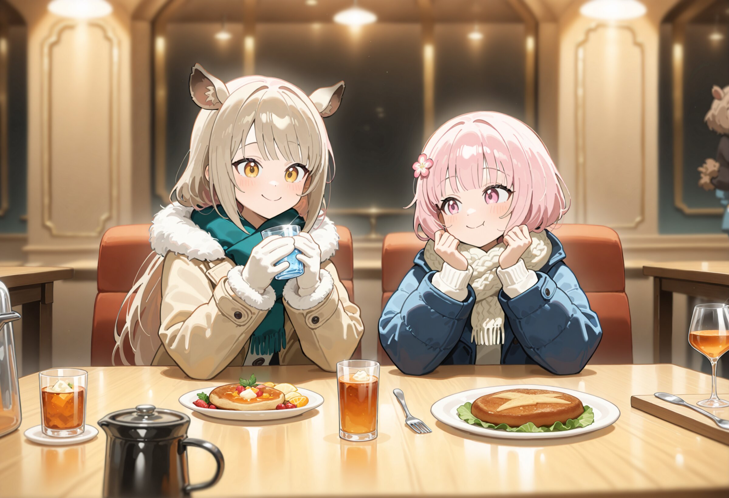 multiple girls, (cute girls:1.2), having a drinking party at a restaurant. (The restaurant’s interior features a chic style chic A black mantelpiece black holds a mirror resting on it and art leaning against the wall,The restaurant’s interior capitalizes on the natural warmth of wood (natural warmth:1.0) The counter seats are crafted for a relaxing experience (relaxing experience:1.0) A meticulous approach to the ambiance and lighting ensures that quality time flows within (meticulous approach:1.0) quality time flows:1.2).. They are seated around a square table, drinking, chatting, and enjoying their food. Please show their joyous expressions and the sense of camaraderie between them, (noon:1.3), soft natural sunlight, focus head, (close up:1.3), knees out of frame, looking at viewer, perfect anatomy, with fork ,spoon,,, , eating pot-au-feu, sliced bread brown stew, professional anime art lots of details, Delicate and vivid dishe, glint, glitter, glowing food,, overexposure, shiny-glistening, (watercolor style:0.7), (pastel color style:0.8) super fine concept art, hard surface, 8K, unreal engine, masterpiece, best quality, amazing quality, very aesthetic, absurdres, , <lora:noline (1):-0.5> <lora:sdxl2-flat2-512b:0.15> <lora:facelightup_xl_v10:0.5> //以下文字数制限