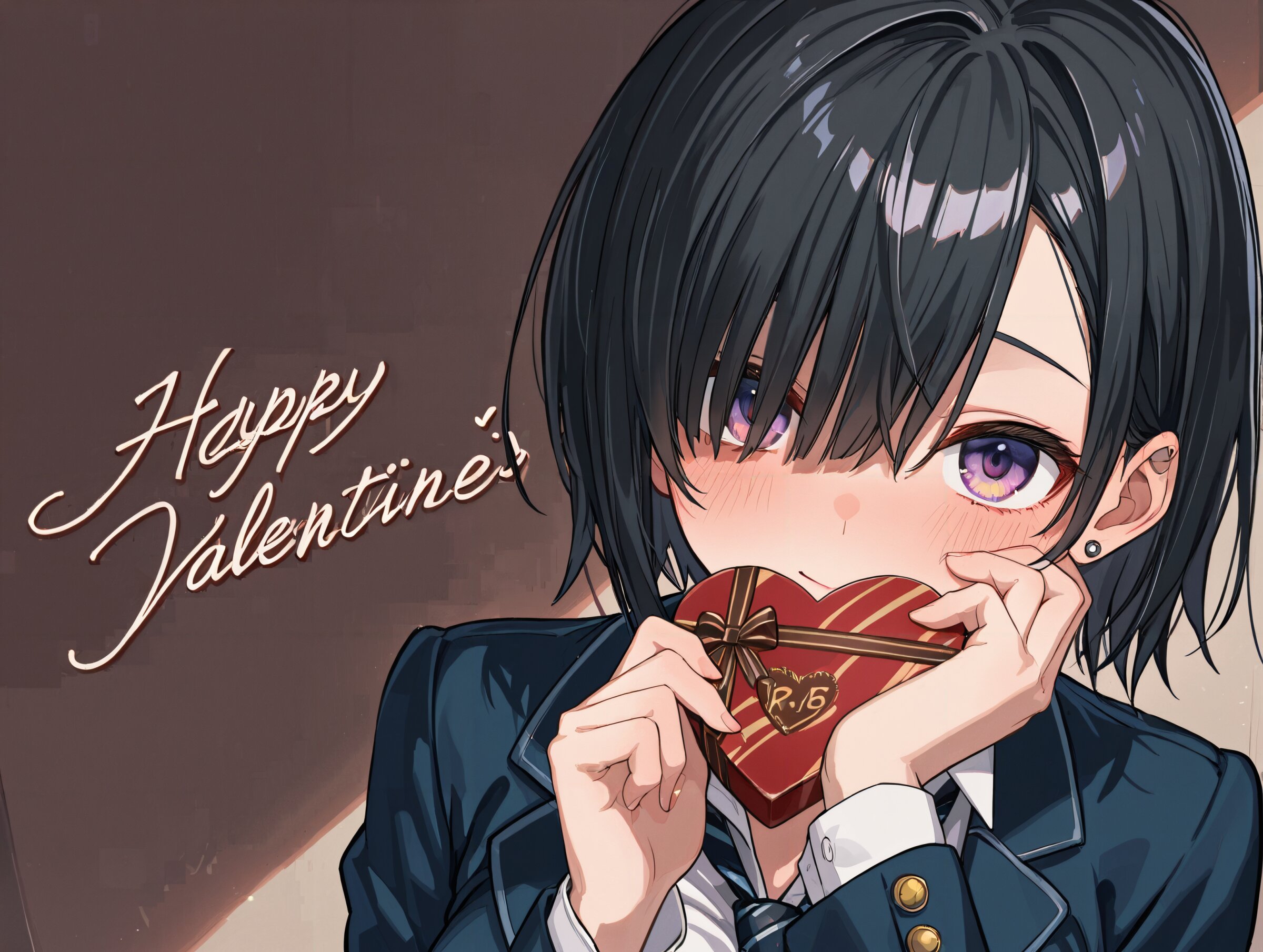 rating safe,rating explicit,masterpiece,best quality,amazing quality,very aesthetic,high detailed skin,alluring high resolution,intricate detail,8k,digital cel-shaded, BREAK face focus, valentine,happy valentine, school uniform,blazer,collared shirt,necktie,, large breasts,(black hair,),long bangs,asymmetrical bangs,(eye hidden by hair:1.2),,short hair,purple eyes,gradient eyes,ear piacing,