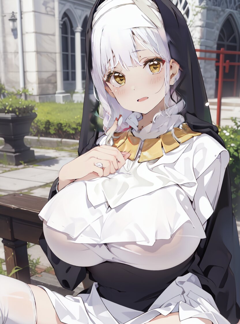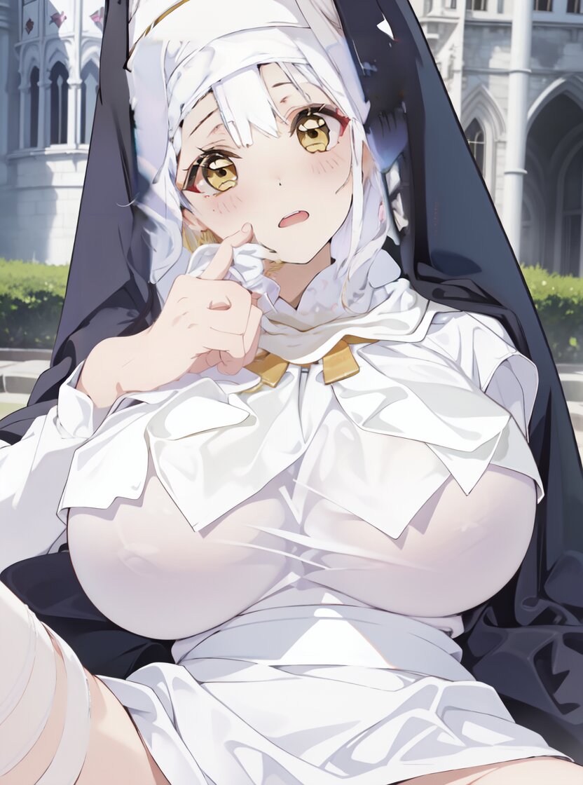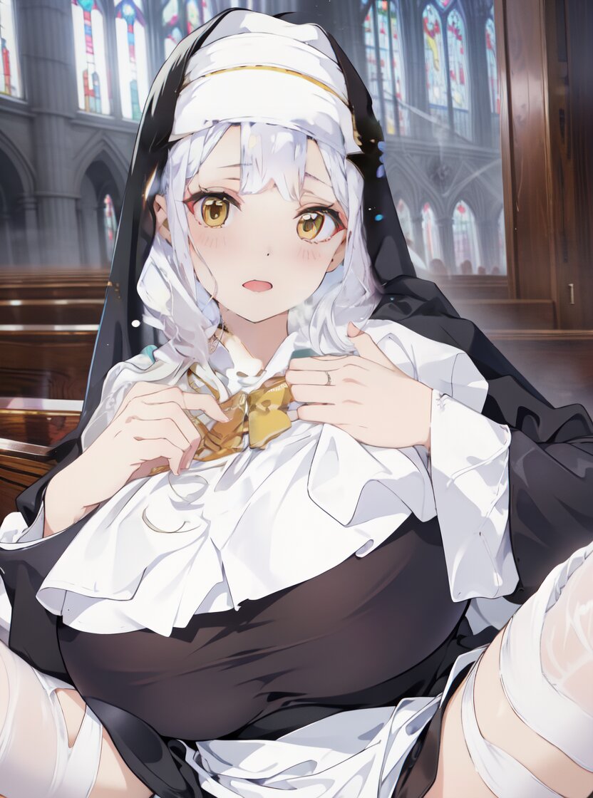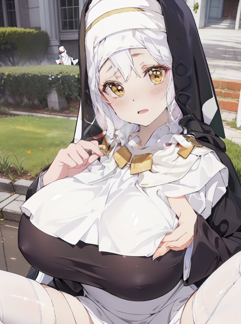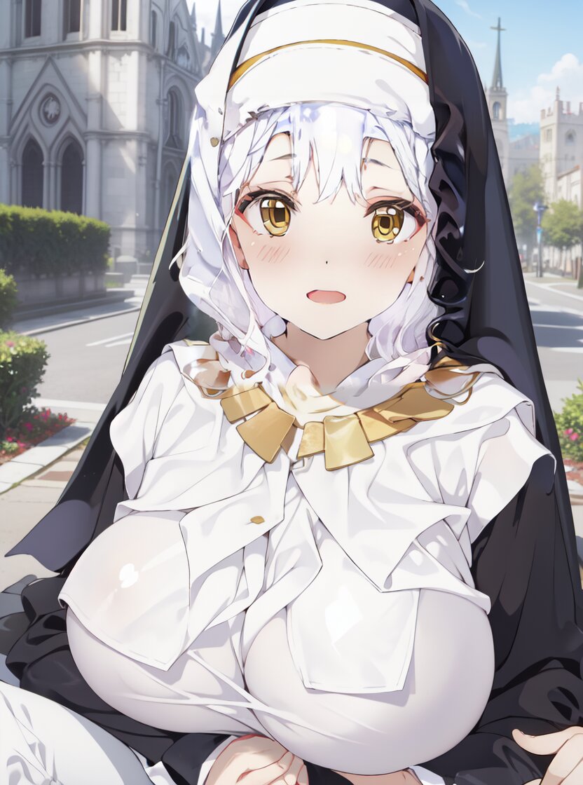 (((from front))), perfect anatomy, best quality, masterpiece, ultra high res, (photorealistic:1.6), random pose, random angle, 1girl, 22 years old, (nun: 1.6), (upper body, closeup face: 1.2), looking at viewer, (huge breasts: 1.6), white tights, leaning back, wide spreading legs, outside of church, <lora:nun_v01:0.6>