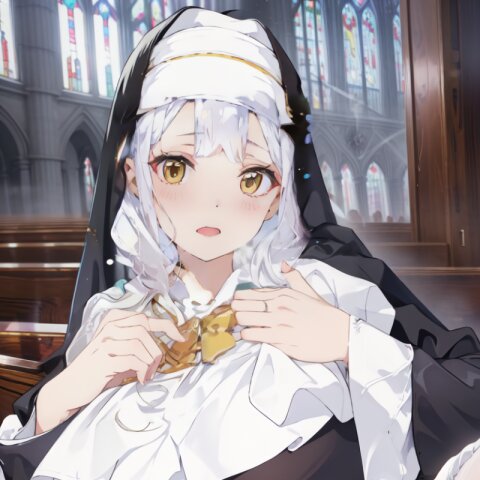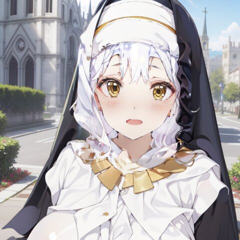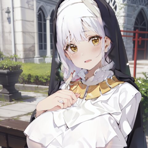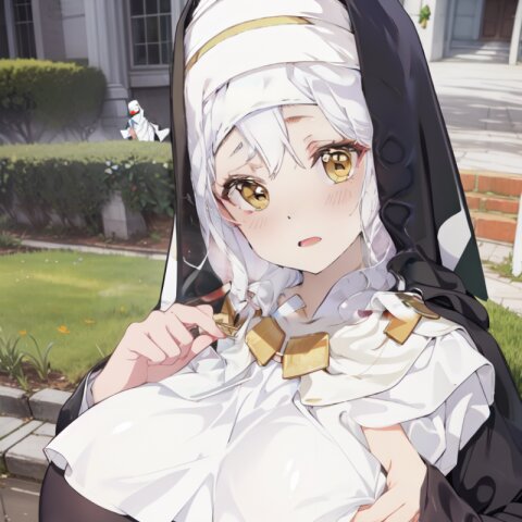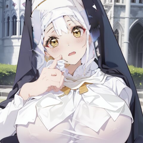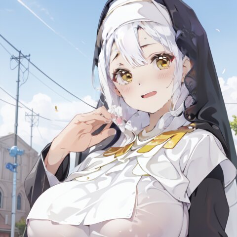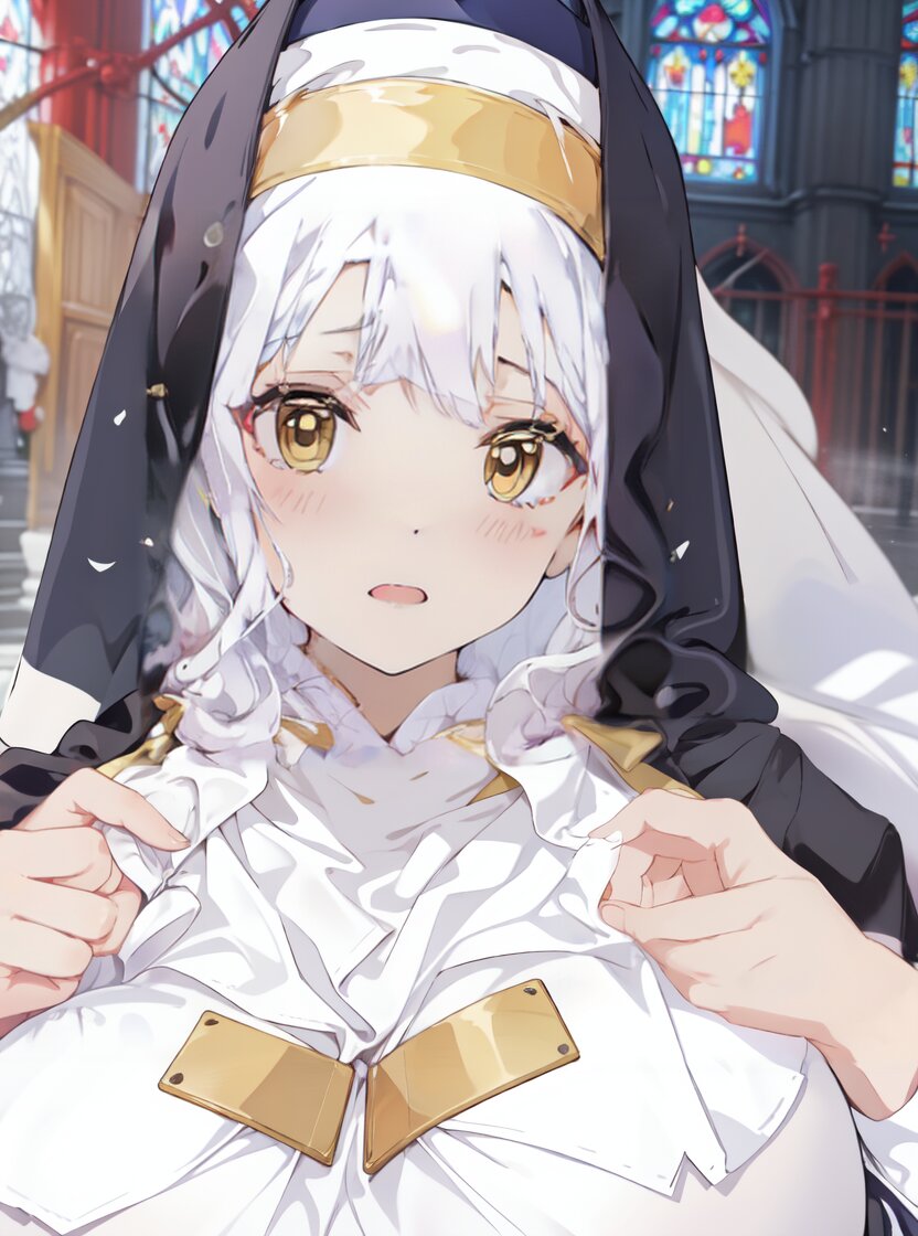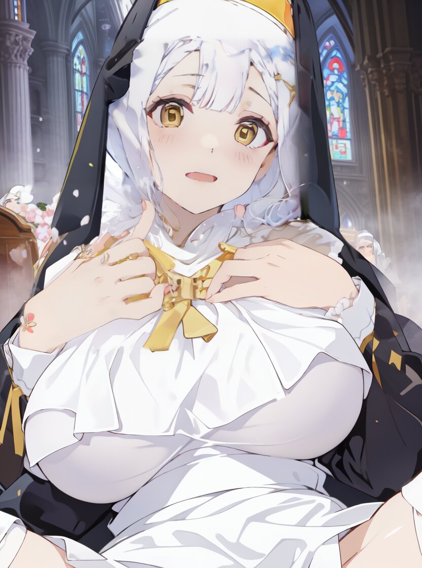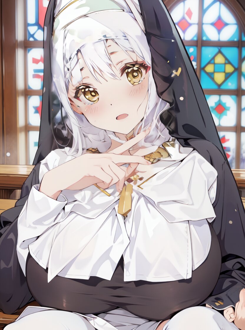 (((from front))), perfect anatomy, best quality, masterpiece, ultra high res, (photorealistic:1.6), random pose, random angle, 1girl, 22 years old, (nun: 1.6), (upper body, closeup face: 1.2), looking at viewer, (huge breasts: 1.6), white tights, leaning back, wide spreading legs, outside of church, <lora:nun_v01:0.6>