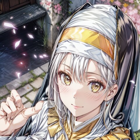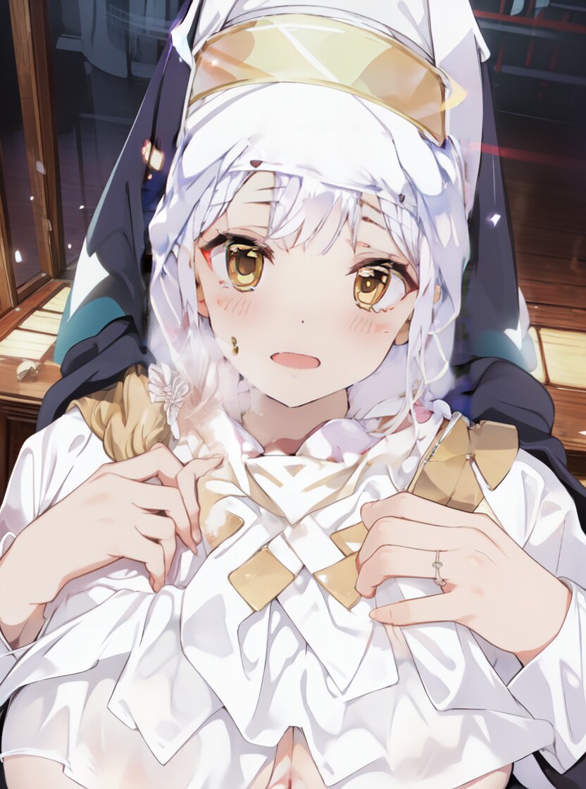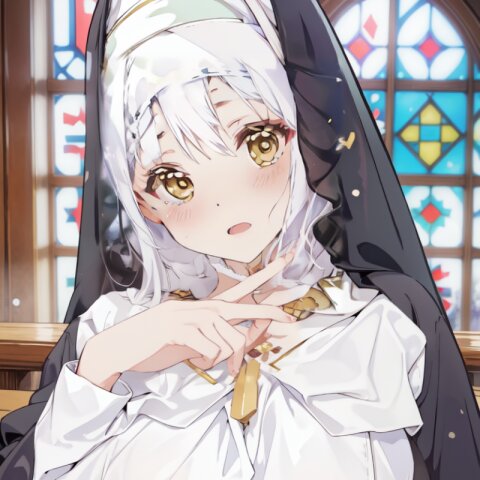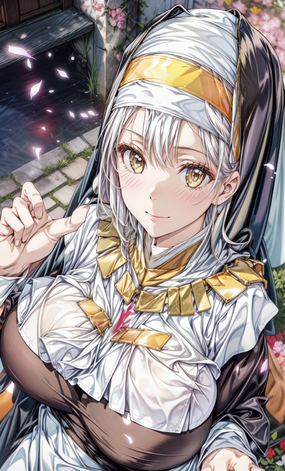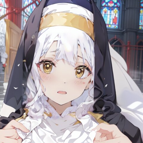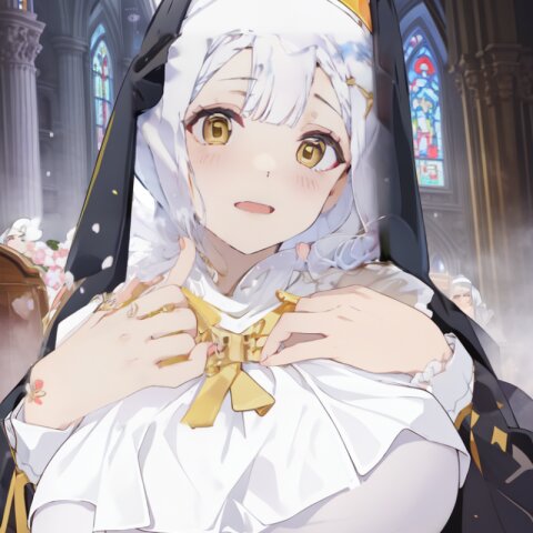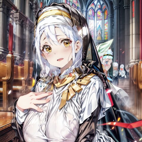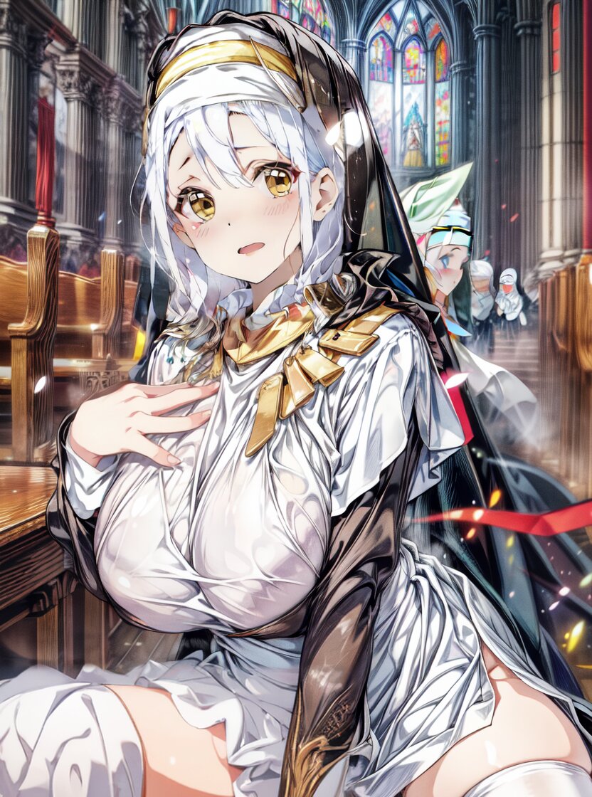 (((from front))), perfect anatomy, best quality, masterpiece, ultra high res, (photorealistic:1.6), random pose, random angle, 1girl, 22 years old, (nun: 1.6), (upper body, closeup face: 1.2), looking at viewer, (huge breasts: 1.6), white tights, leaning back, wide spreading legs, outside of church, <lora:nun_v01:0.6>