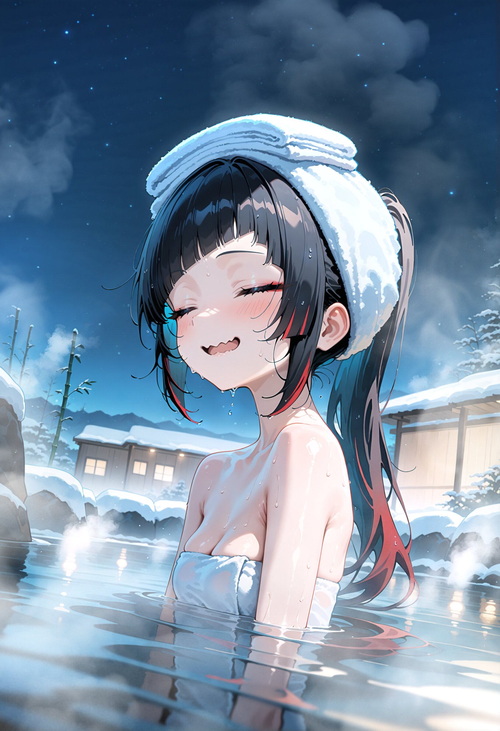 (fisheye,fisheye lens angle:1.0), aerial view, looking afar 1girl, 1girl, beautiful detailed eyes, cute face, cool, light skin, skindentation, beautiful brown eyes, , , black hair, crimson colored tips cute, shoulder length hair, high ponytail diagonal bangs , shiny hair, first-rate female body perfect body beautiful flat breasts, smart hips, perfect composition, cinematic lighting, warm lighting, perfect anatomy, detailed face, cute face, shiny hair, novel illustration, photo, watercolor, (depth of field:1.4), dimly lit, light particles sitting, (upper body:1.1), skinny, (bathing:1.2), relaxing, (from side:0.4), (Sitting in a hot spring up to the neck:1.0), (eyewear on head, rectangular eyewear:1.0), happy, (-_-:1.2), closed eyes, half-open mouth, wavy mouth, completely nude, (naked towel:1.2), hands on thighs, cleavage, beautiful detailed skin, shiny skin, cheerful skin, wet skin, , blush, (leaning back:1.2), lean on rock, partially submerged, , towel on head, detailed background, (black background:1.2), (blank background:1.2), outdoors, (onsen:1.3), night, rock, plants, bamboo, moss, reflection, wooden architecture, (steam, fog:1.4), (starry sky:1.2), snow, winter, milky way depth of field, bokeh, super fine concept art, hard surface, 8K, unreal engine, masterpiece, best quality, amazing quality, very aesthetic, absurdres, you can add tag scenery, (volumetric lighting), To make the background more distinctive. professional art lots of details, , overexposure, shiny-glistening, (watercolor style:1.0), (pastel color style:1.0) <lora:noline (1):-0.5> <lora:sdxl2-flat2-512b:0.2> <lora:facelightup_xl_v10:0.5>
