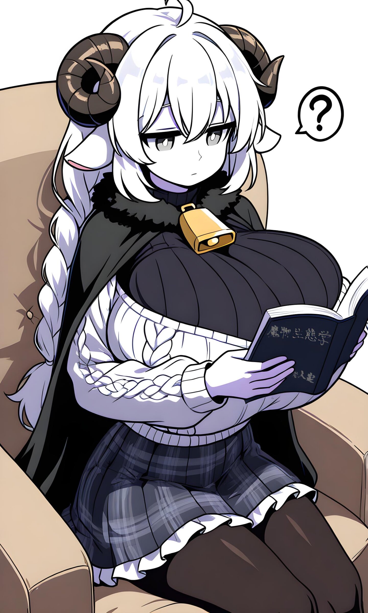 1girl,solo,flat color,((correct_anatomy)),((hands_focus, perfect_hands:1.5)),gddw,ShuzXL,tall,beautiful,(sheep girl),sheep horns,(white skin),(gigantic breasts),slim,white hair,messy hair,long hair,ahoge,braided ponytail,hair between eyes,(jitome),silver eyes,bright pupils,white eyebrows,raised eyebrows,black fluffy woolen fur collar,black cape,cowbell,bursting breasts,black turtleneck sweater,aran sweater,black frilled skirt,white plaid skirt,woolen skirt,black pantyhose,expressionless,unemotional,reading,holding book,open book,sitting on armchair,white easy chair,reclining,breast suppress with book,spoken question mark,looking book,looking down,white background,simple background,three-quarter view,from side