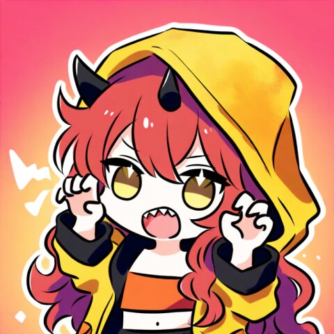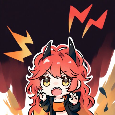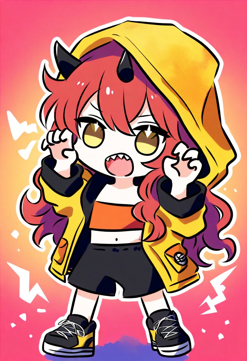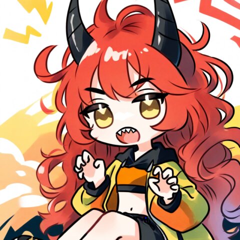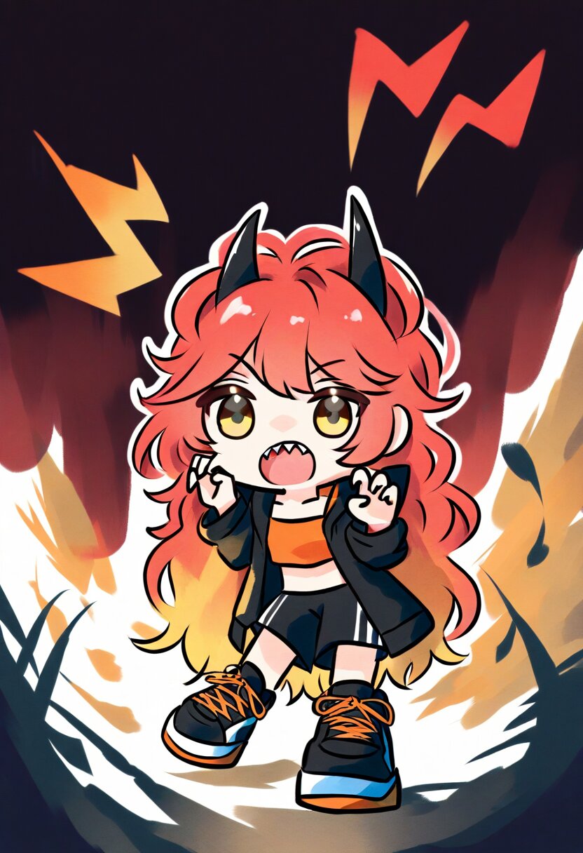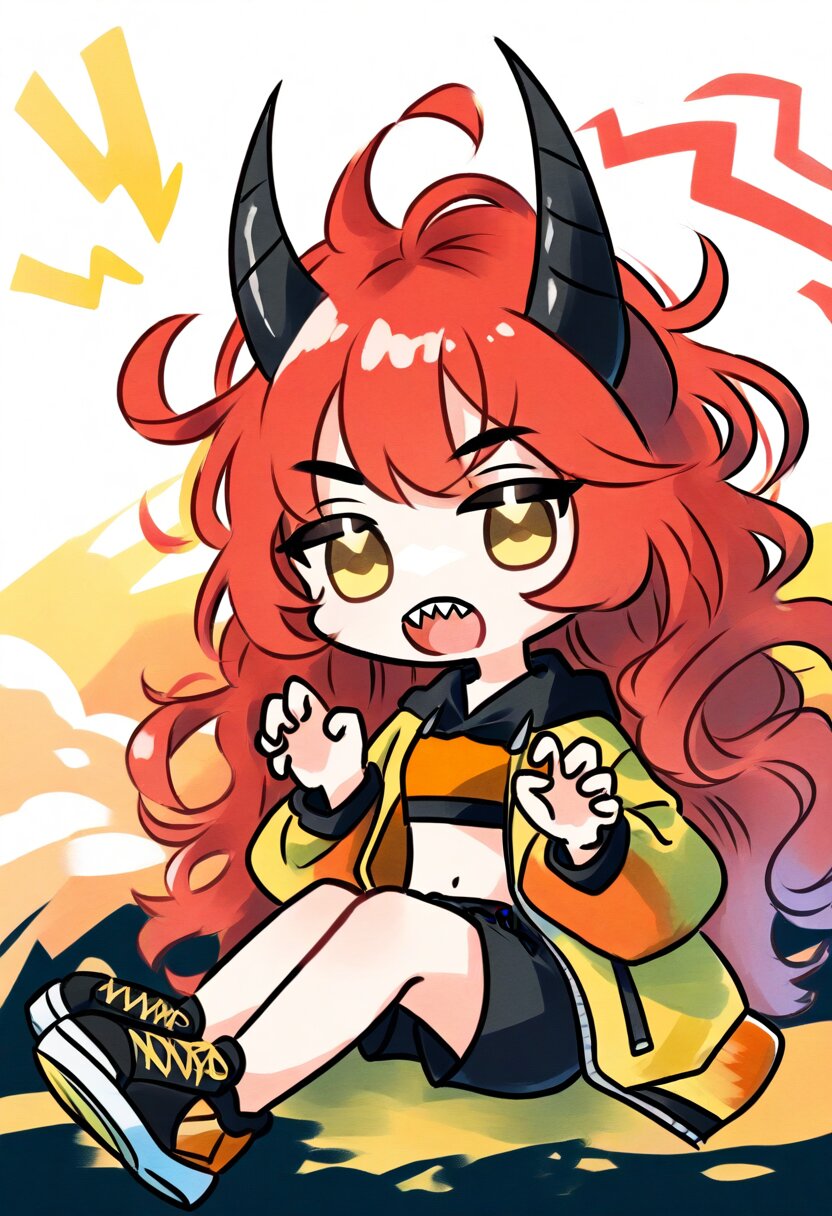 <lora:inmnsylexl4:1>best quality, masterpiece, very aesthetic, general, watercolor painting, chibi, solo, 1girl, 10 years old, hood with large twisted black horns, worn-out yellow crop top jacket, orange bandeau, black shorts, red long wavy hair, messy hair, yellow eyes, claw pose, open mouth, sharp teeth, black oversize sneaker, shout lines