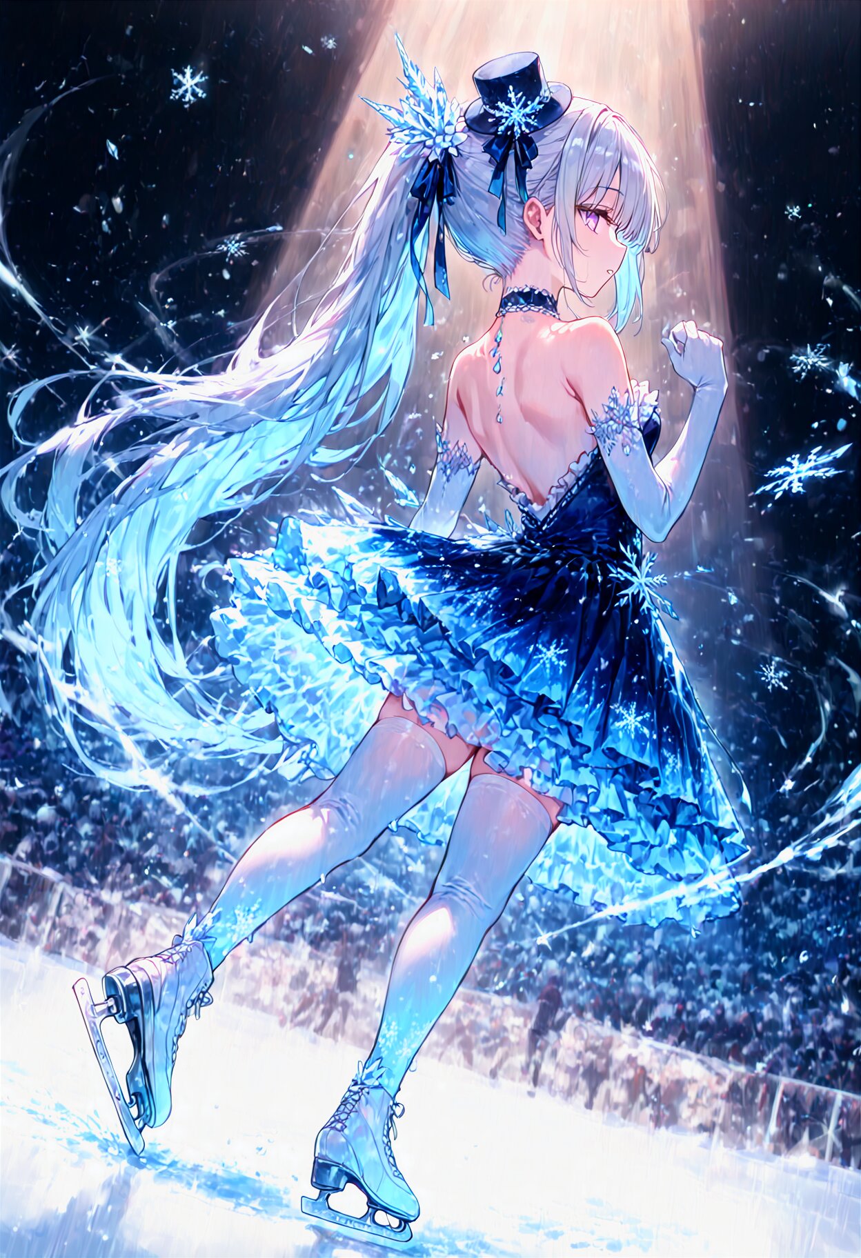 amazing quality,best quality,ultra-detailed,ultra-detailed-eyes, beautiful detailed background, motion lines, spinning, pale color, portrait, full body, ponytail, from side, profile, 1girl, solo, parted lips,(Expressionless:0.8), big eyes,(half-closed eyes:0.9), tareme, pale purple eyes, thighhighs, (silver hair:1.1), (dark blue hair colored inner hair:0.9), long hair,very long hair, eyebrows visible through hair, snowflakes,(melt:0.9), sparkle, crystal, mini hat, flower hair ornament, snowflake print, (ice wings:0.8),ice feathers, backless_outfit, dark blue dress, white two-tone dress, miniskirt, leggings, elbow gloves, looking back, blue strapping ribbon and bow, frills,choker,gem,jewelry, strapping ribbon, embroidery, spotlight, round lighting, action pose,hand up, figure skating,ice skates,ice rink, see-through, prism, musical note, dynamic angle, dynamic light,, <lora:noline-16oa:-1.5> <lora:sdxl2-flat2-512b:0.5>