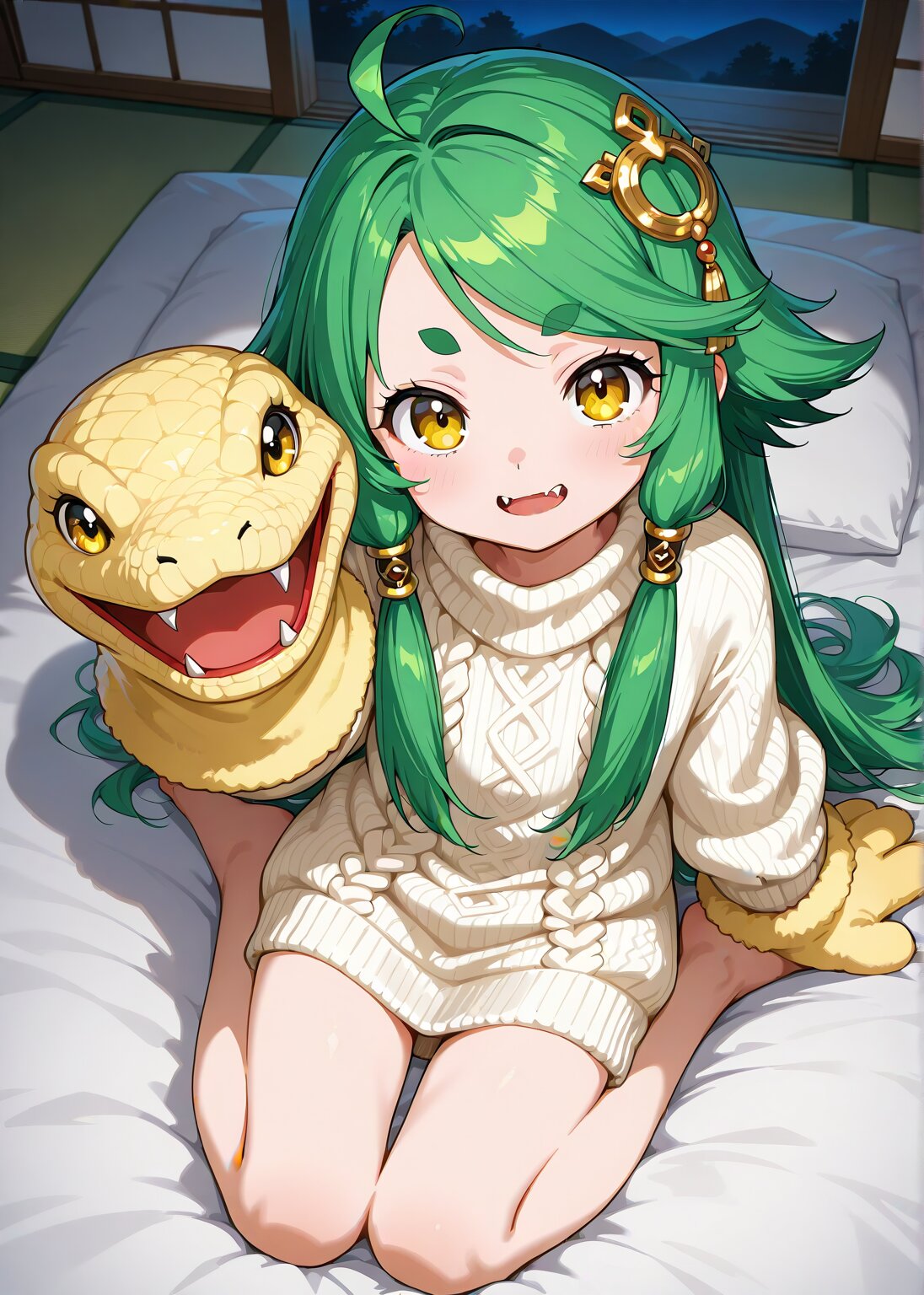 cute room, night. looking at viewer, cowboy shot, 1 girl, solo, full body, from above, Fascinating hairstyles, slightly sharp fangs, side locks or ahoge. round eyebrows. golden eyes, snake tale, Snake head ornament, nude, A hand puppet shaped like a snake's head, Fluffy gloves, hand focus, A tall, slender child with long, shimmering green hair that flows down to their waist, with side-swept bangs. fantasy-like aesthetic with a touch of Japanese culture. The character looks elegant and mysterious, with a calm but slightly intimidating expression. Detailed and vivid illustration, highly detailed textures, anime-style. pet golden snake, knit sweater, futon, wariza, knit clothes, leaning back, leaning to the back,