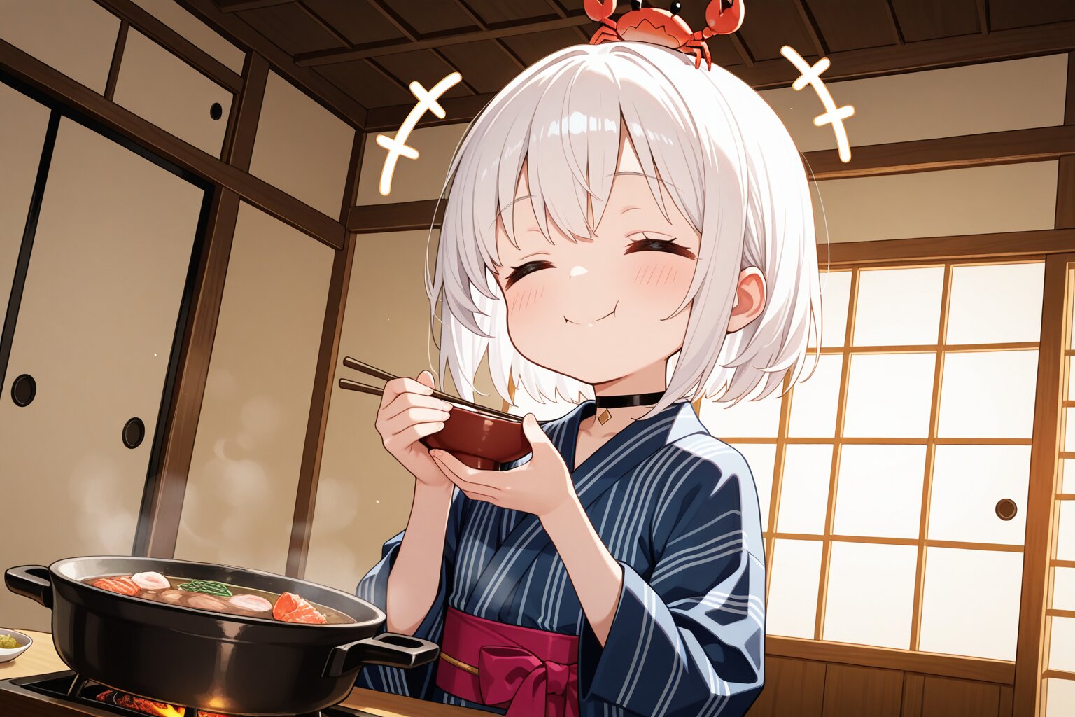 1 little girl, solo, upper body, diagonal angle, masterpiece, best quality, amazing quality, very aesthetic, white hair, short hair, closed eyes, =_=, smile, cheerful, +++, choker, yukata, crab on her head, eating a hotpot, japanese room,