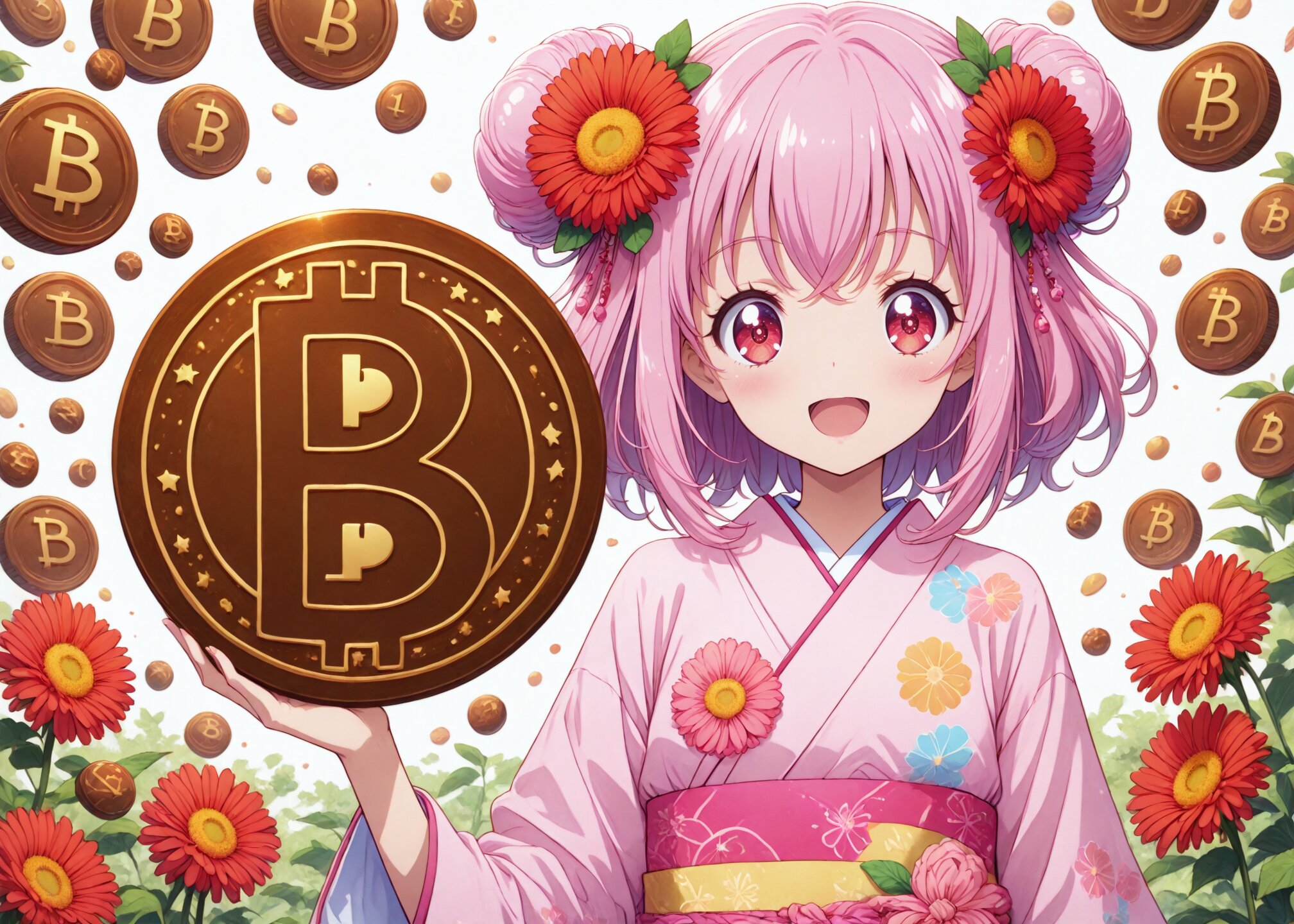 <lora:Nob10_ill_Hikari_v1:1> 1girl, teenage, masterpiece, best quality, hikarichan, red_eyes, hair flower as red gerbera, pink hair, <lora:Any_Nov_btclogo_Bara_v1:0.7> btclogo, coin, holding btclogo, large chocolate, smile, upper body, frame, open mouth,