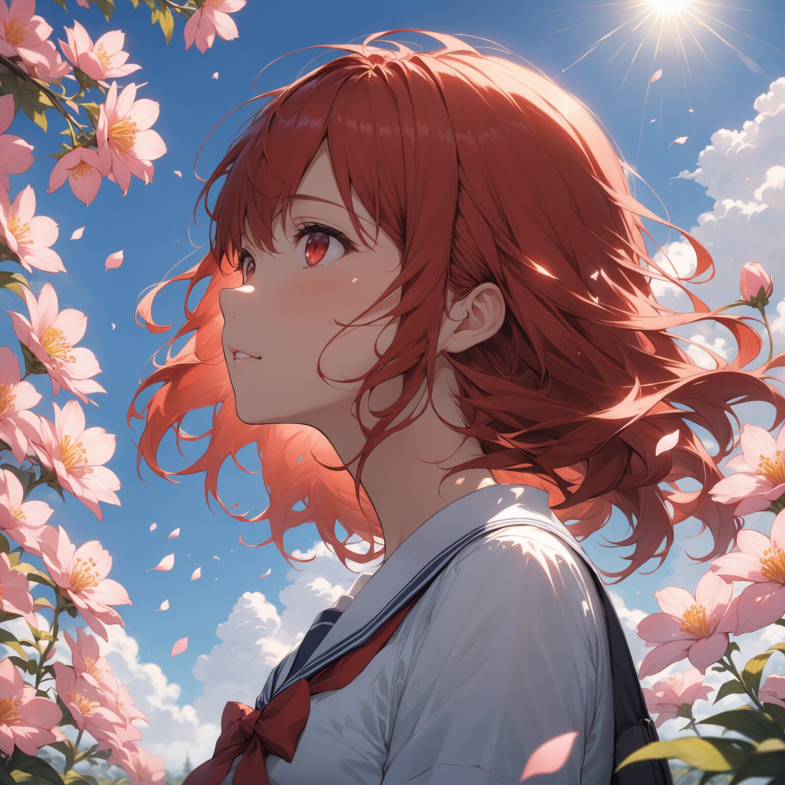 (masterpiece:1.3),(best quality:1.3),highres, BREAK 4k,8k,intricate detail,cinematic lighting,amazing quality,wallpaper,extremely detailed CG,professional quality,with sharp focus and rich contrast, BREAK 1girl,solo,red hair,red eyes,long hair,flower,outdoors,letterboxed,school uniform,day,sky,looking up,short sleeves,parted lips,shirt,cloud,sunlight,white_shirt,school_uniform,mitakihara_school_uniform,upper body,from side,pink flower,blurry,blue sky,depth of field,clavicle, BREAK <lora:aesthetic_anime_v1s:1.2>