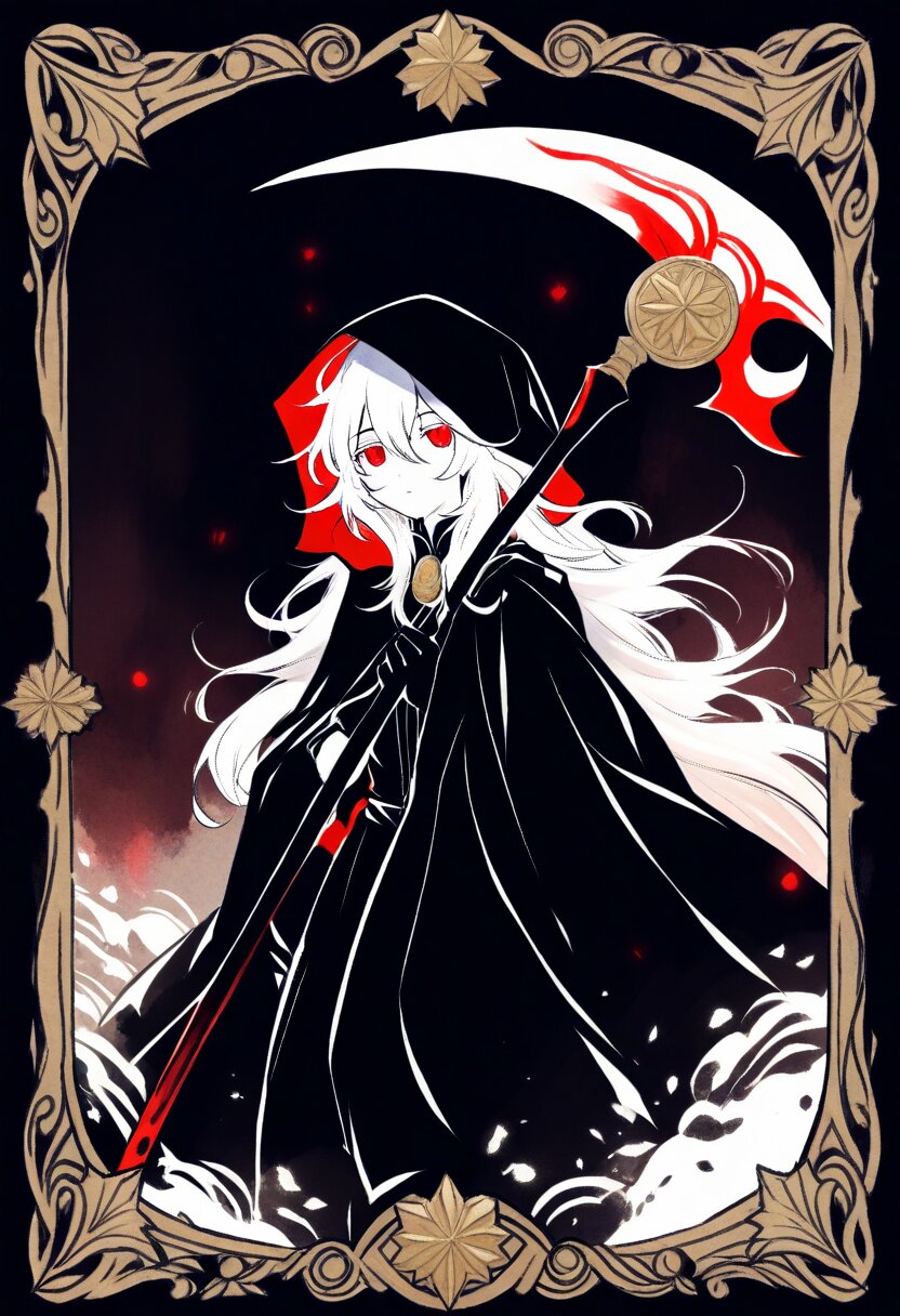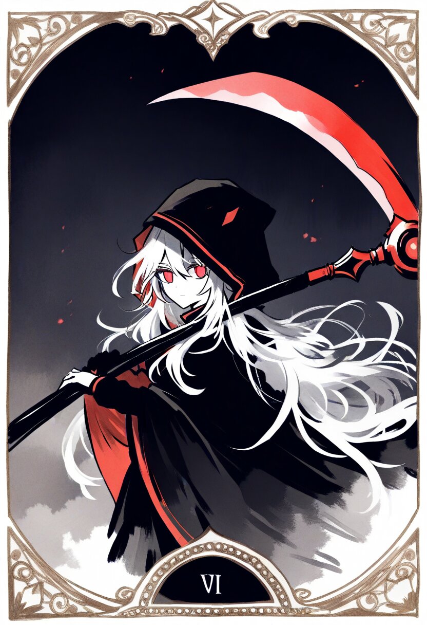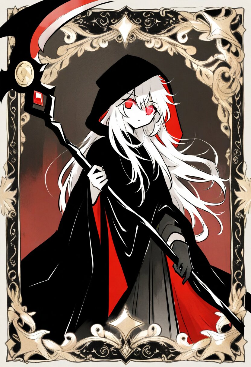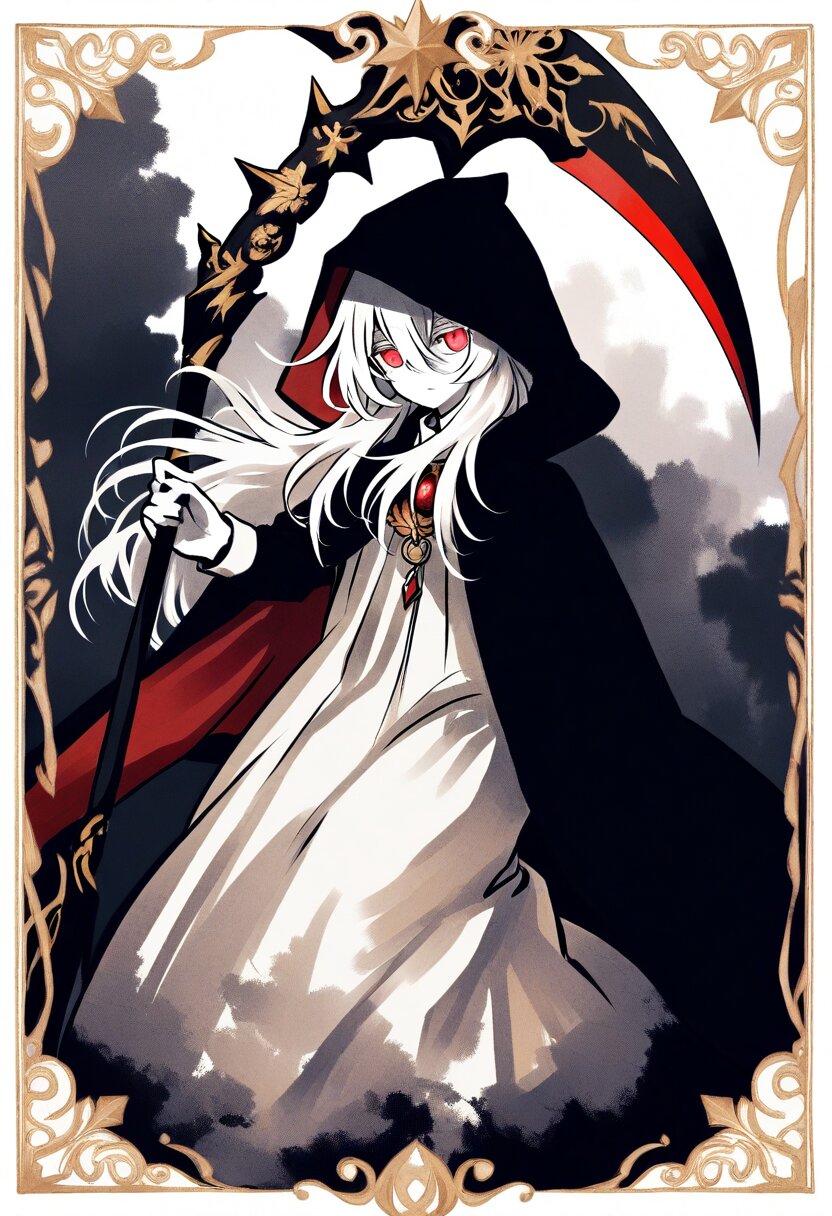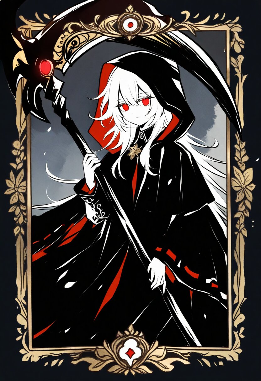 <lora:inmnsylexl4:1>best quality, masterpiece, very aesthetic, general, watercolor painting, tarot \(medium\), (decorative border:1.4), dark theme, 1girl, holding scythe, white skin, red eyes, glowing eyes, white long hair, messy hair, black long cape, hood, expressionless face