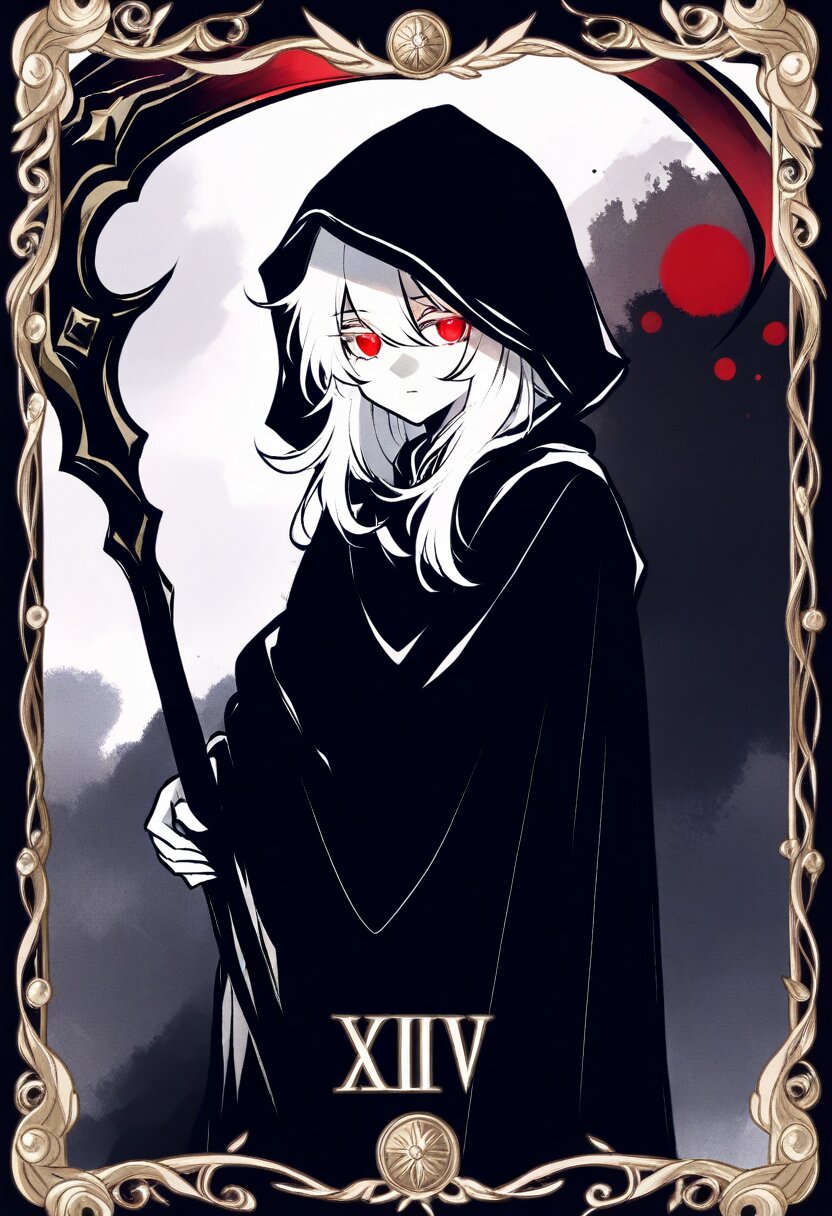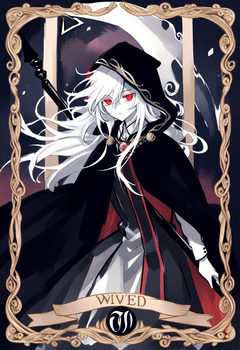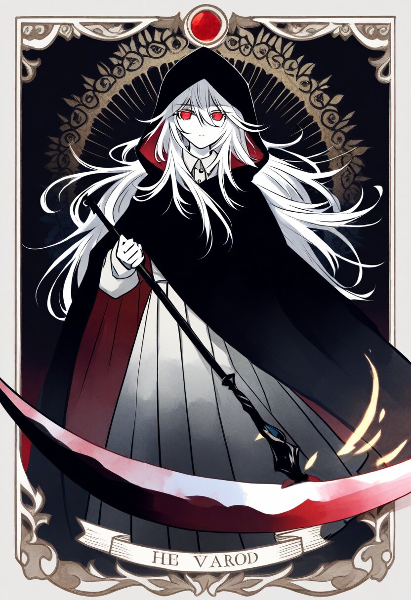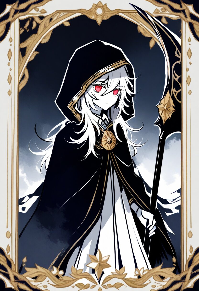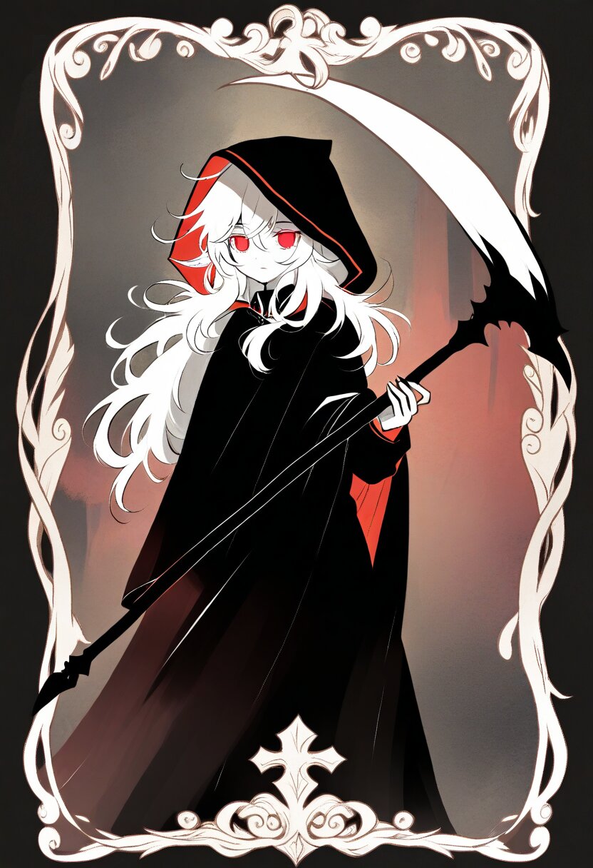<lora:inmnsylexl4:1>best quality, masterpiece, very aesthetic, general, watercolor painting, tarot \(medium\), (decorative border:1.4), dark theme, 1girl, holding scythe, white skin, red eyes, glowing eyes, white long hair, messy hair, black long cape, hood, expressionless face