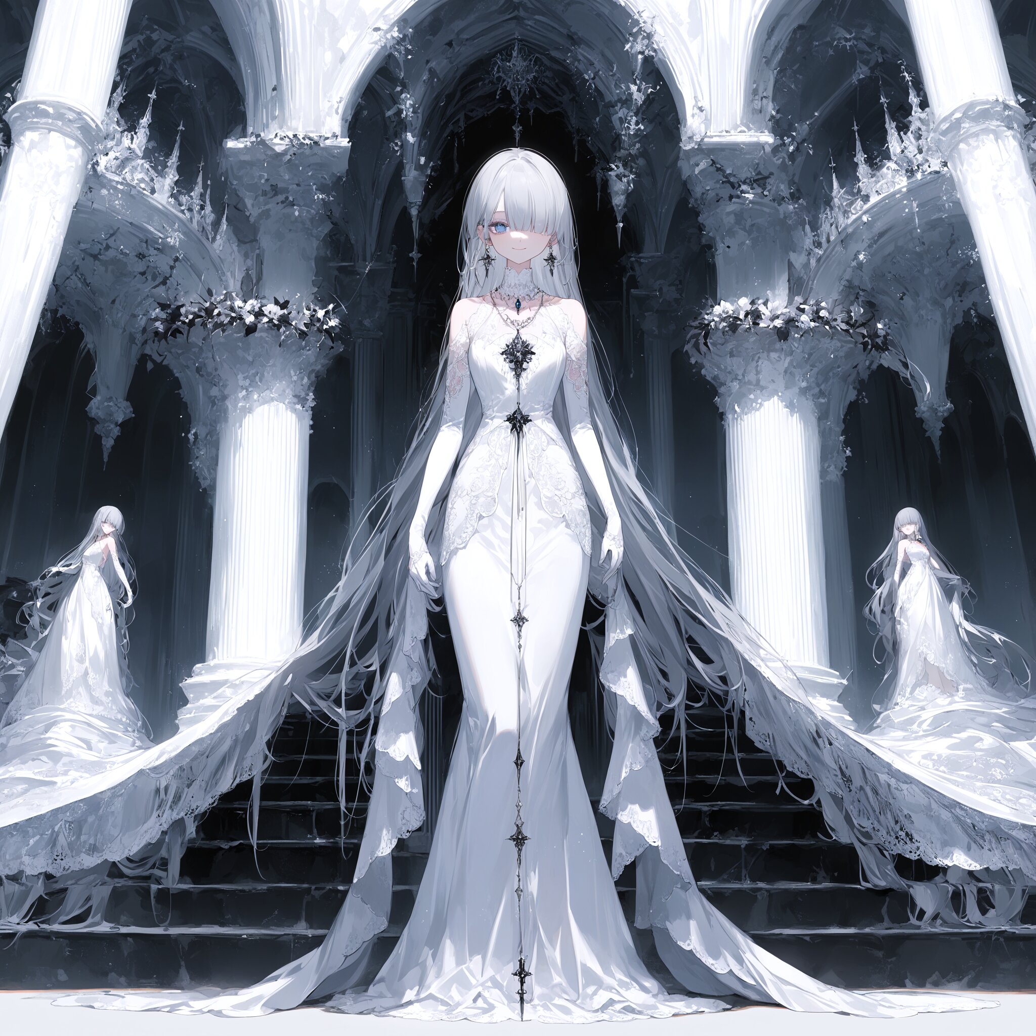 score_9, score_8_up, score_7_up, illustration, (best quality:1.2), (solo:1.2), girl, (white dress:1.4), long white gothic dress, white lace details, white embroidery, full body shot, blunt bangs, blunt cut back hair, straight long hair, (standing:1.2), palaces, deep blue eyes, eyes like jewels, hair over one eye, white_Elbow-length gloves, white stockings, smile, False Eyelashes, earrings, necklace, (pale skin:0.8), black lily, black bow,