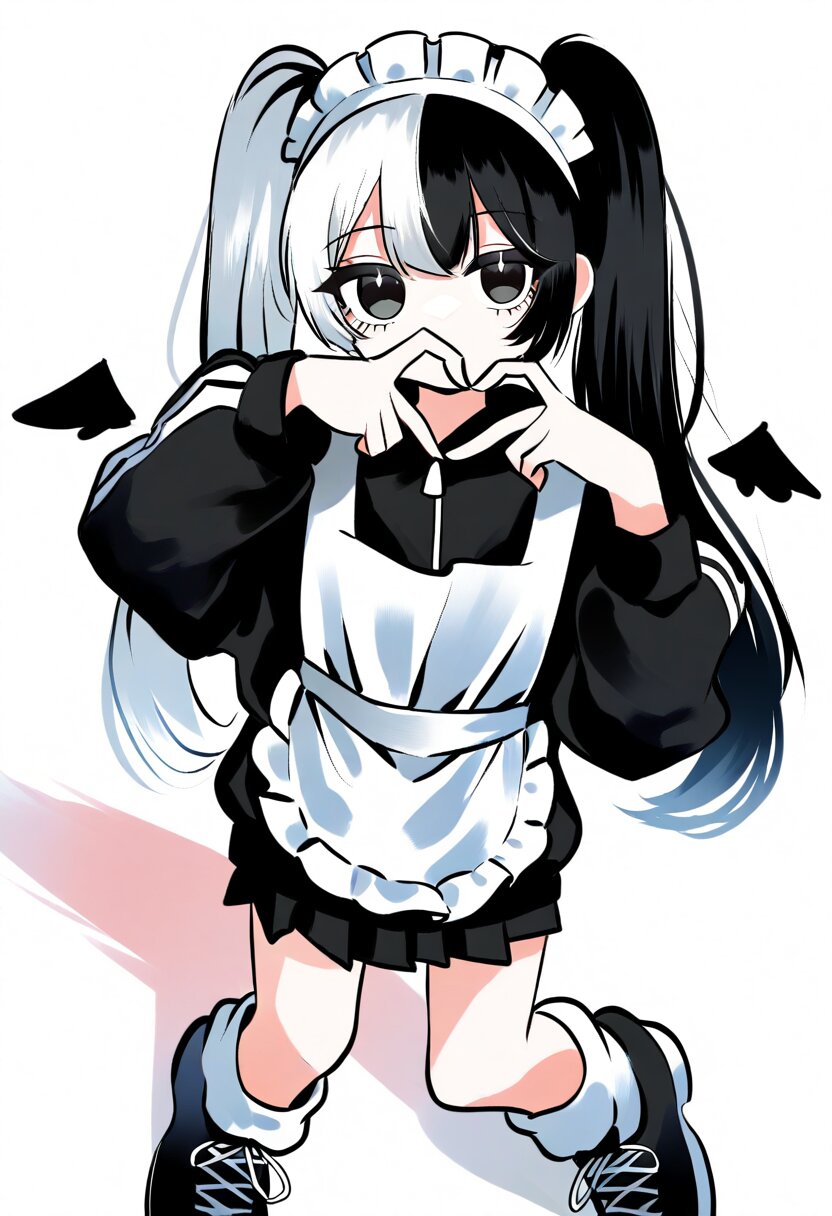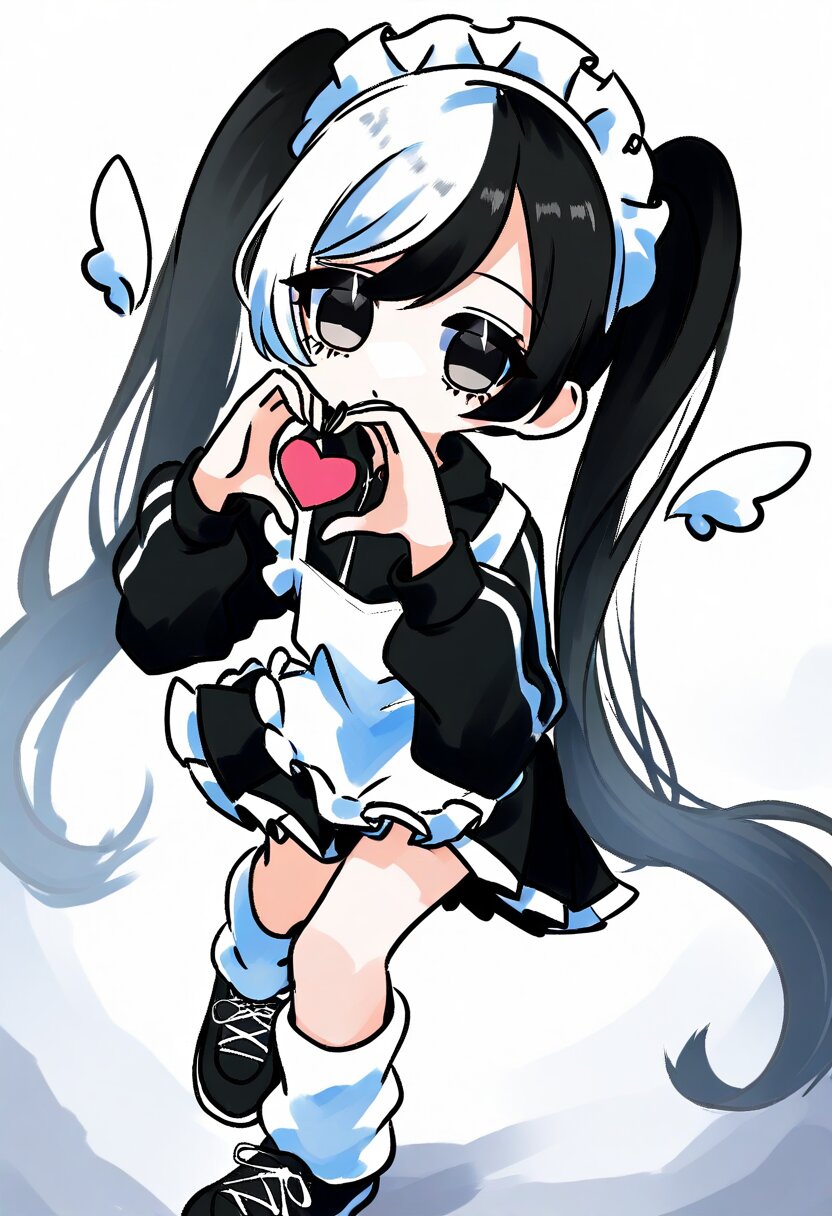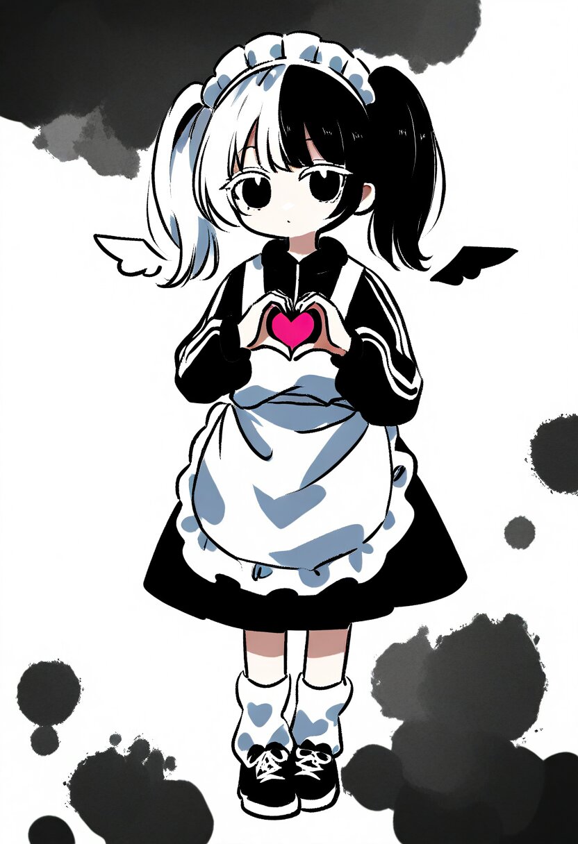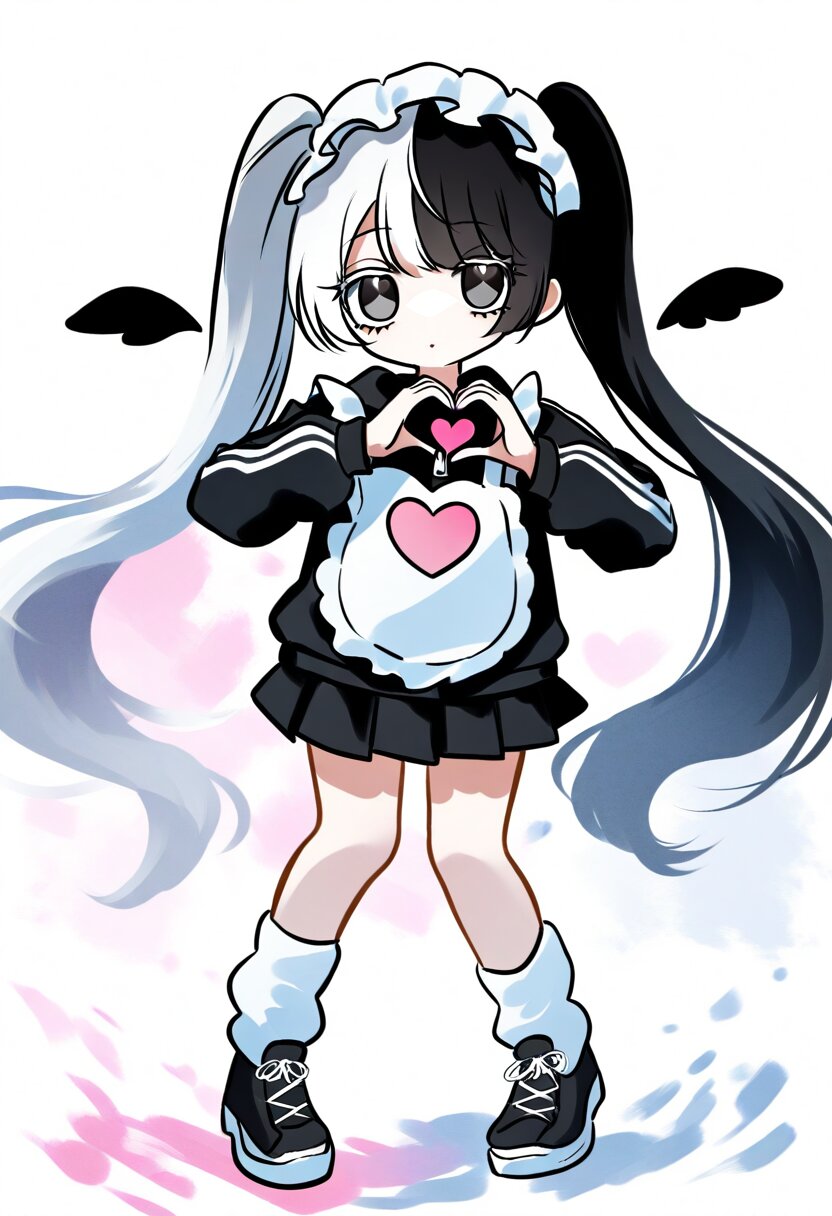 <lora:inmnsylexl4:1>best quality, masterpiece, very aesthetic, general, watercolor painting, 1girl, solo, black and white split-color hair, twintails, black eyes, large eyes, black tracksuit, black skirt, white apron, head dress, heart hands, detached wings, white loose socks, black sneaker, white background
