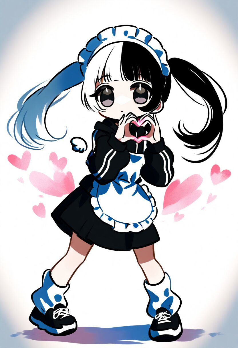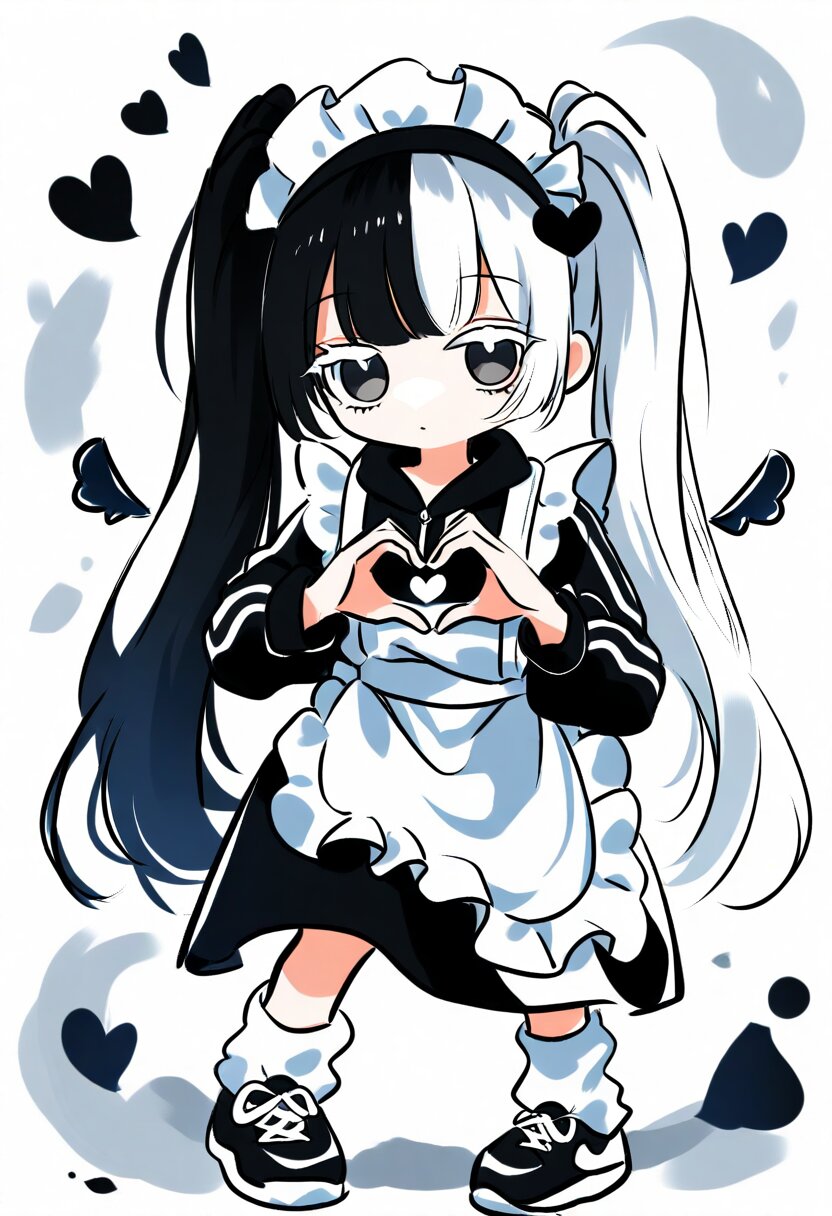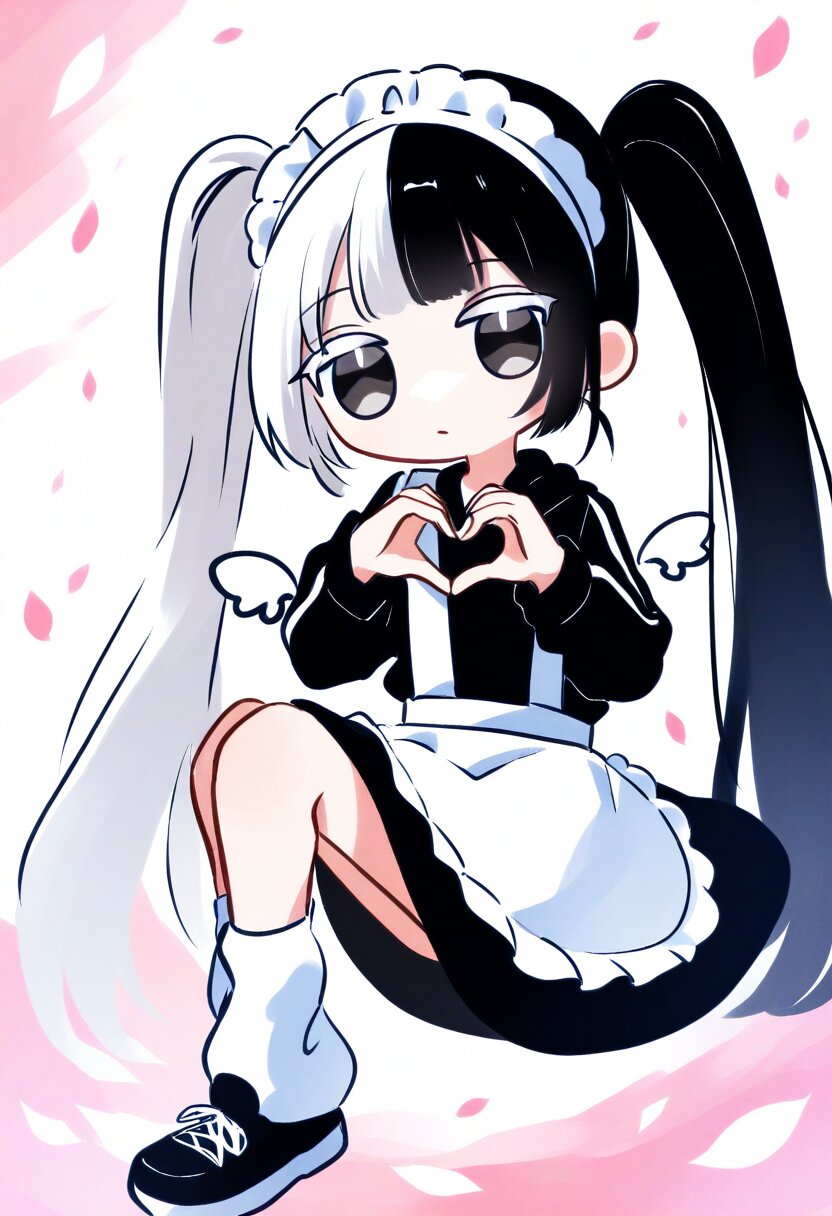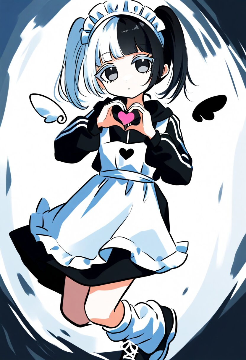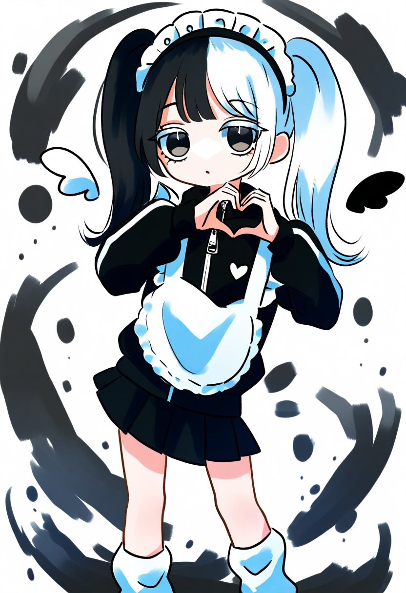 <lora:inmnsylexl4:1>best quality, masterpiece, very aesthetic, general, watercolor painting, 1girl, solo, black and white split-color hair, twintails, black eyes, large eyes, black tracksuit, black skirt, white apron, head dress, heart hands, detached wings, white loose socks, black sneaker, white background