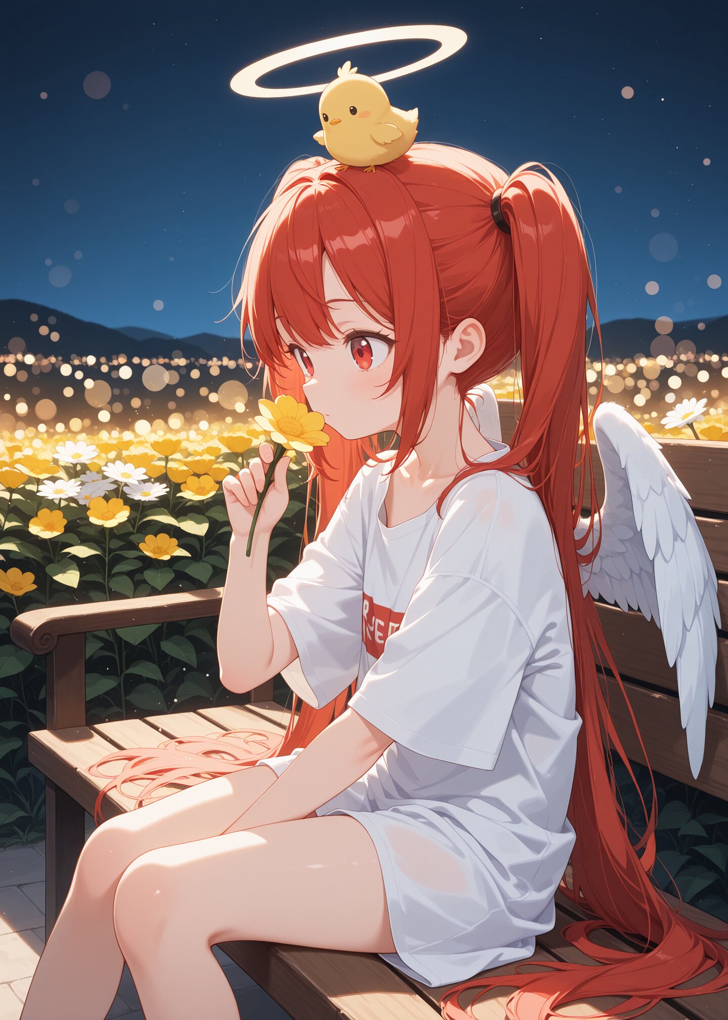 masterpiece,best quality,very aesthetic,absurdres,(flat color:0.6), BREAK 1girl,solo,red hair,twintails,red eyes,, BREAK newest,halo,1girl,wings,solo,(flower),long hair,angel,sitting,holding,holding flower,angel wings,very long hair,white shirt,sky,night,depth of field,bokeh,light particles, BREAK wooden bench,chest shot,from side, BREAK (Put a chick on your head,head on chick,small yellow chick,fluffy chick,cute chick:1.3), BREAK (sharp focus,depth of field,blurred background,soft bokeh,Cinematic Composition), BREAK <lora:boldline:1.3>,<lora:Yarnworld-000017:1.3>,yrnwrld,<lora:vividColorXL:0.5>,<lora:BokehLoRA:0.3>,<lora:GoodHandsXL:0.6>,<lora:SoftAnimeShading:0.5>,