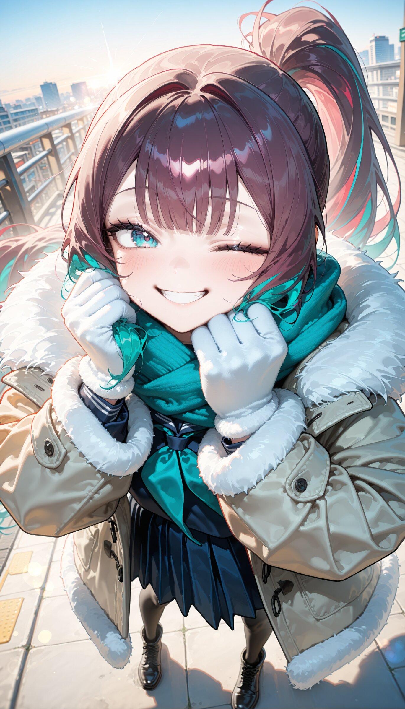 (close up:1.0) (from above,looking up:1.2) looking at viewer, 1girl, beautiful detailed eyes, cute face, cool, redness skin, skindentation, beautiful steelblue eyes, , , maroon hair, turquoise green colored inner hair cute, very long hair, drill ponytail center-flap bangs , , first-rate female body perfect body beautiful framed breasts, smart hips,, warm comfy (seductive smile:1.0) happy and (shiny smile:1.4) and one eye closed and thinking, seductive smile (wearing winter clothes, winter scarf, , white fur gloves, over coat:1.1), , serafuku in fur coat, long sleeves, neckerchief short plated skirt, long sleeves, pantyhose, ankle boots (smile absently:1.0), depth of field, bokeh, morning street, cityscape, Station front district Crowded with commuters, lined with convenience stores and caf�s., winter sunlight, morning, sunshine, direct lighting, face palm, (simple background:1.0) super fine concept art, hard surface, 8K, unreal engine, transparent, (semi realistic:0.5), masterpiece, best quality, amazing quality, very aesthetic, absurdres, you can add scenery, (volumetric lighting), To make the background more distinctive. professional art lots of details, , overexposure, shiny-glistening, (watercolor style:0.0), (pastel color style:1.0) <lora:noline (1):-0.5> <lora:sdxl2-flat2-512b:-0.5> <lora:facelightup_xl_v10:0.5>
