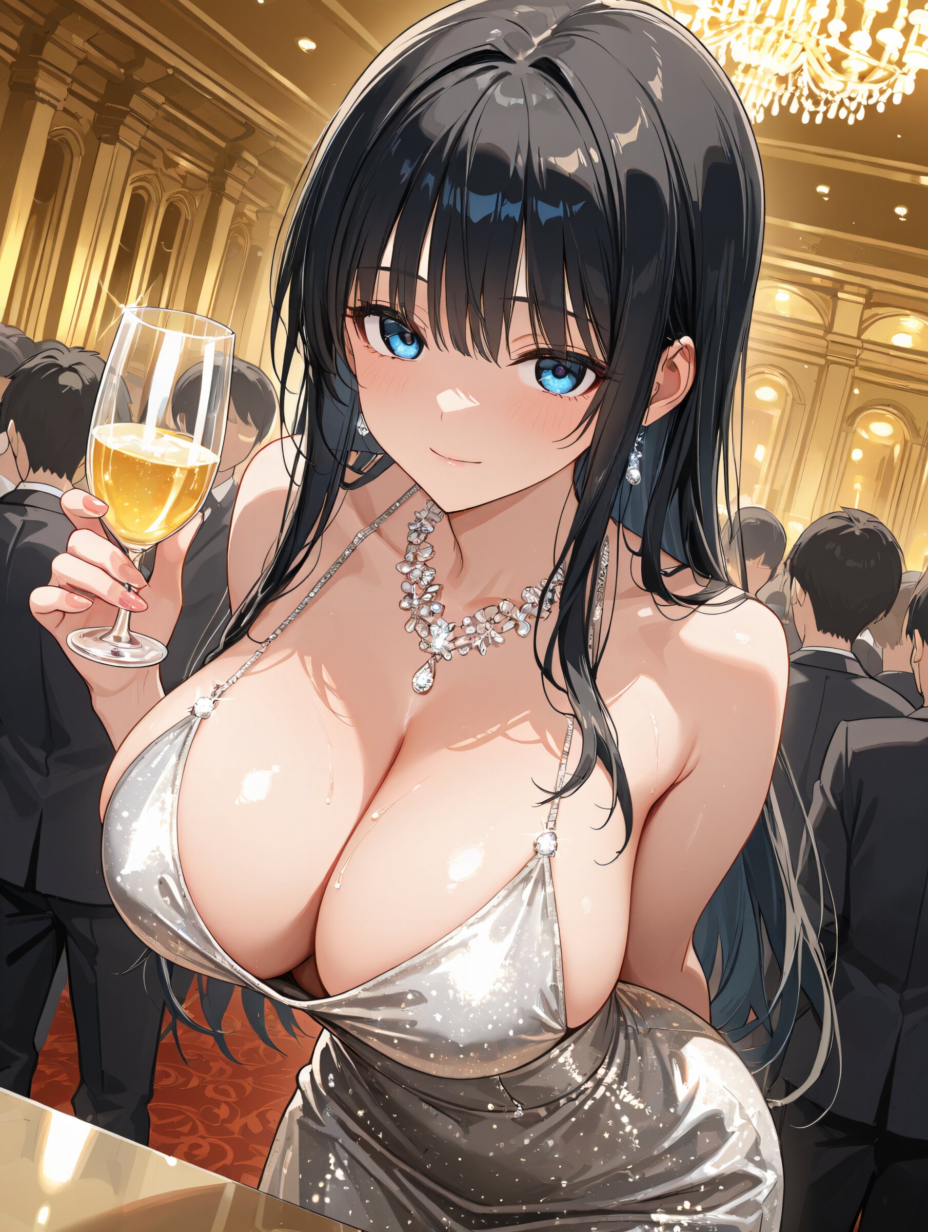 rating explicit,masterpiece,best quality,amazing quality,very aesthetic,high detailed skin,alluring high resolution,intricate detail,8k,digital cel-shaded, BREAK luxurious party room,crowd,face focus,dynamic scene,dynamic angle, holding glass,arm behind back,leaning forward,light smile, luxurious dress,