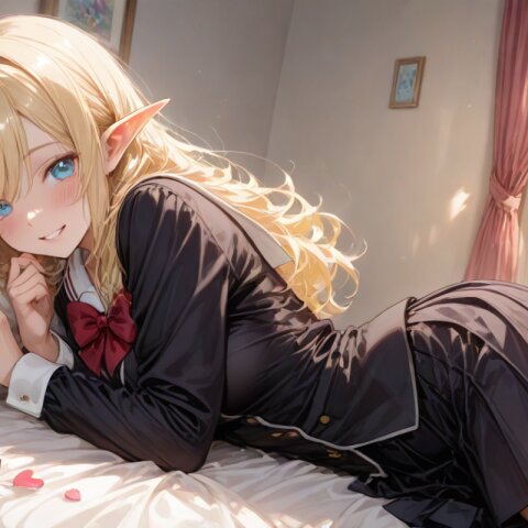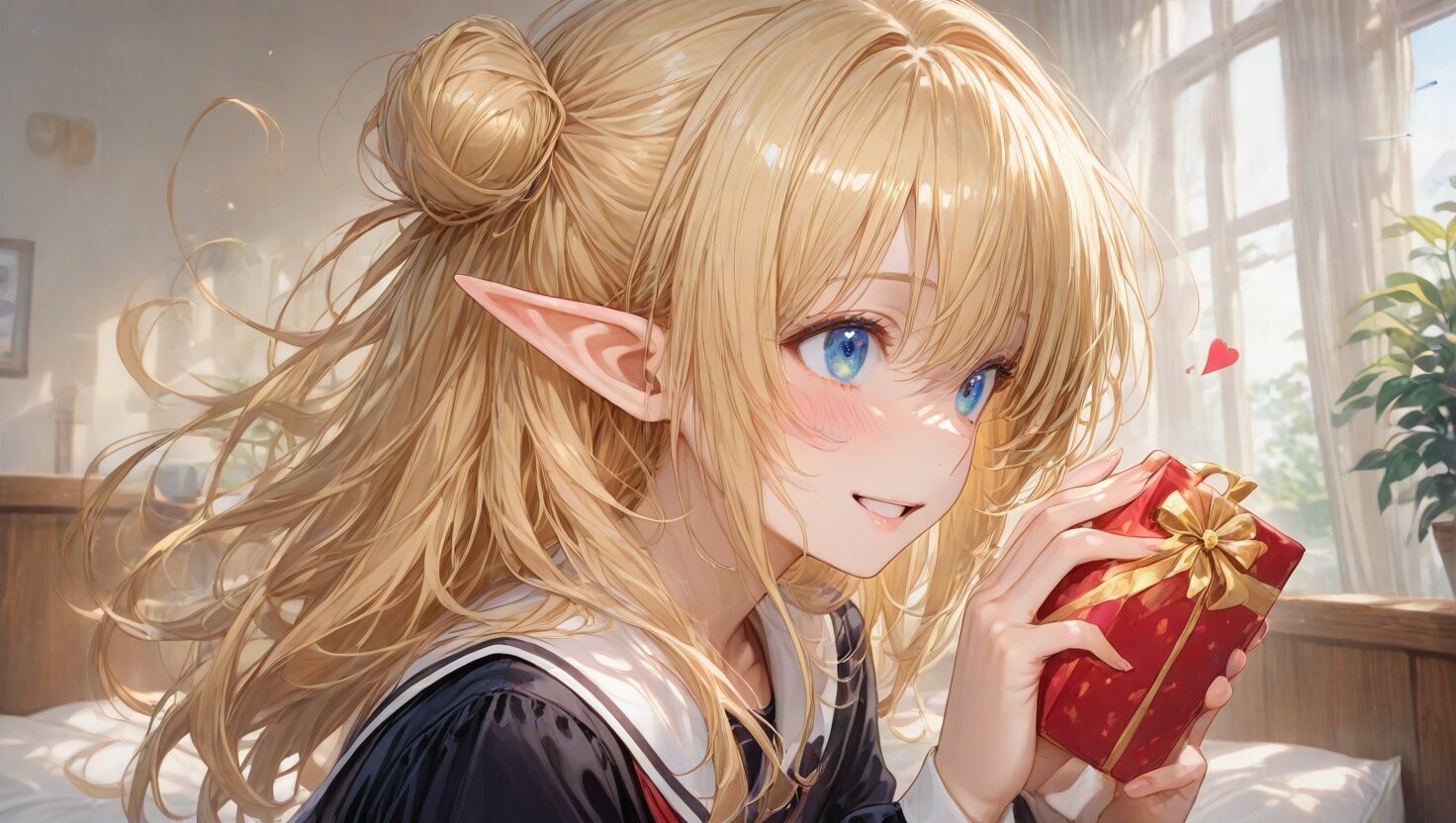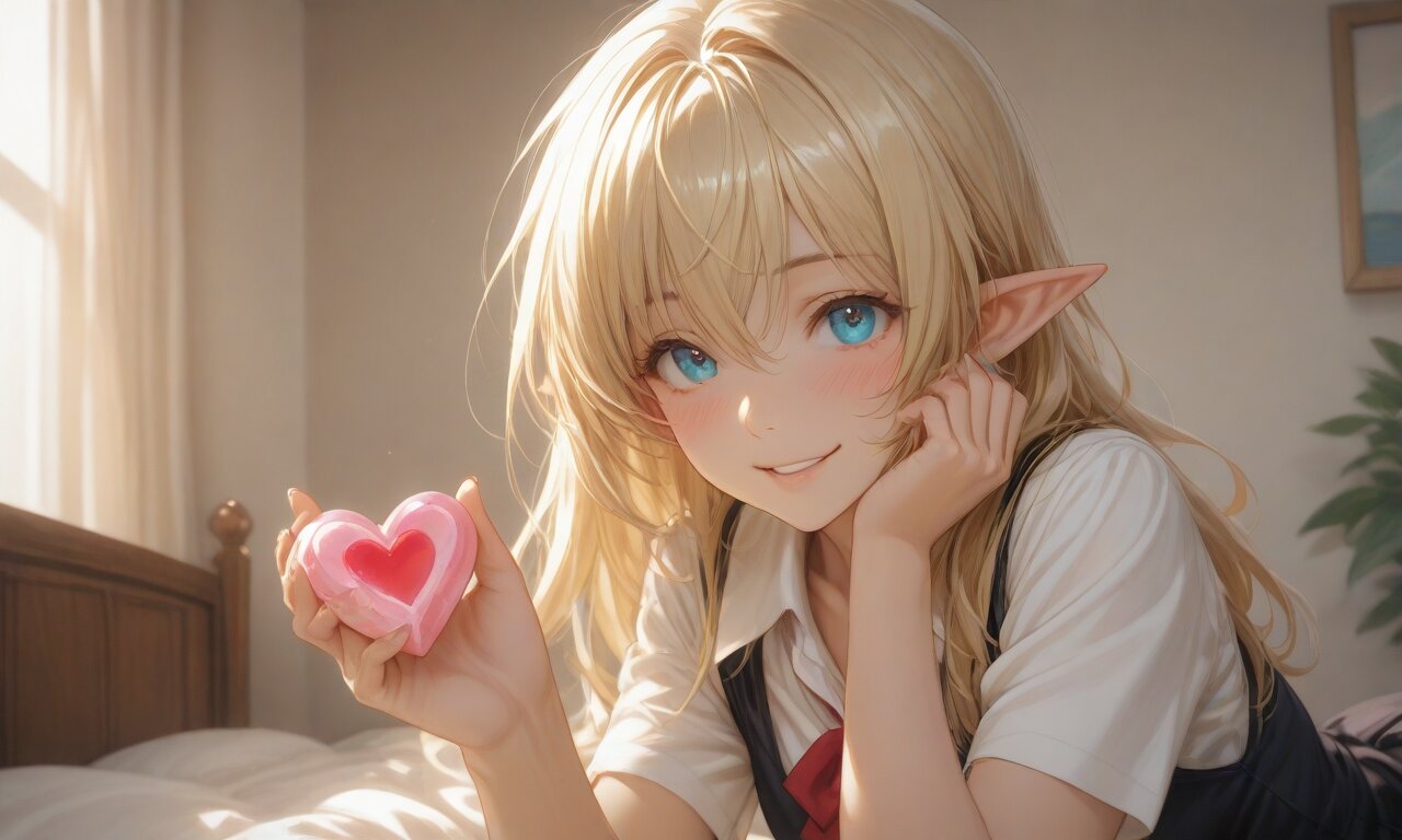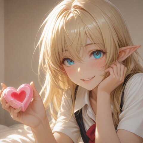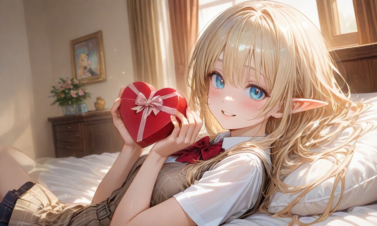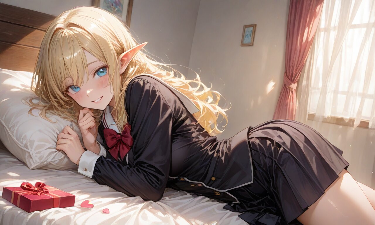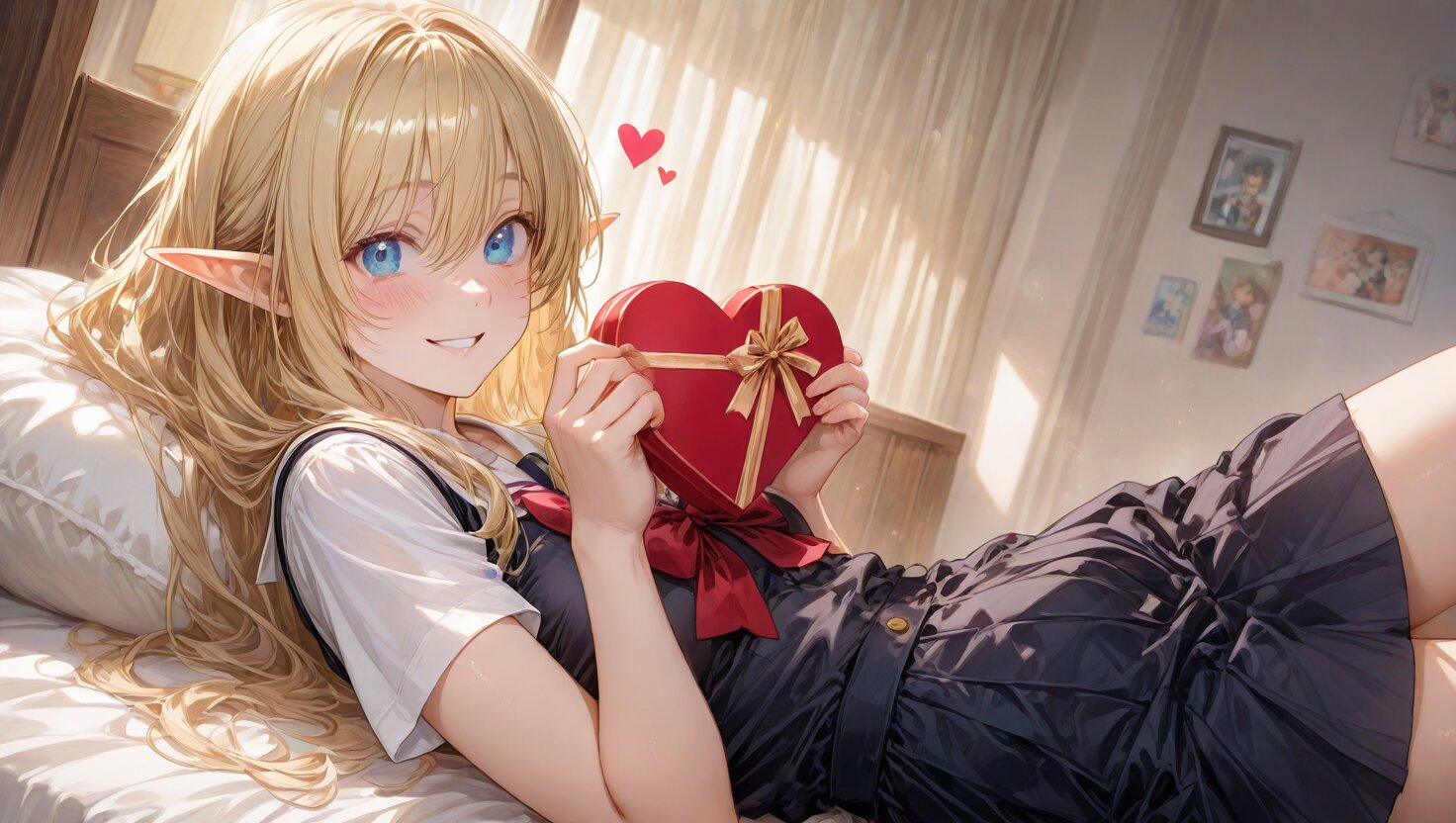 high score, great score, absurdres, source_anime, masterpiece, best quality, very aesthetic, detailed background, 2d, sharp focus, nice hands, perfect hands, perfect anatomy, perfect structure, indoors, 1girl, solo, cowboy shot, from side, low angle, (theme is school days), (The background is a girls cute my room), indoors BREAK (An illustration like a movie poster. A dynamic composition and scenery like the last scene of a movie. Official art. A semi-realistic moe heroine in the style of Japanese anime. She is wearing her high school uniform. She gaze at me with a happy smile.), she is lying on back on the bed. She is holding a beautifully wrapped heart-shaped present in on her mouth. BREAK ultra detailed lips, ultra detailed face and hair, kawaii, adorable, cute, blush, Estrus season, Moist eyes. A passionate gaze. elf girl, (apatite eyes with CGI effect), (deep blonde hair:1.2), k1ss3s, flying heart, <3,