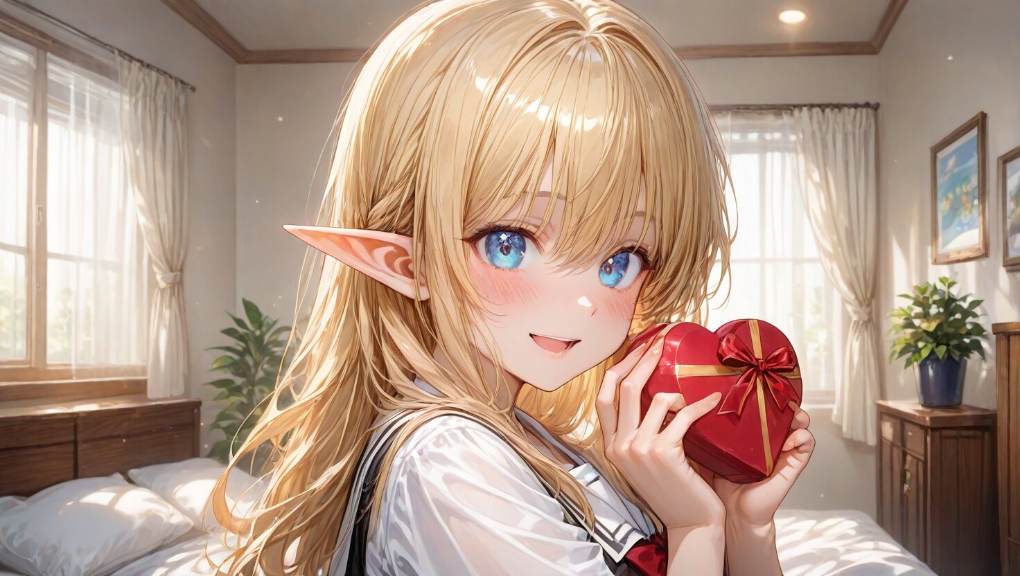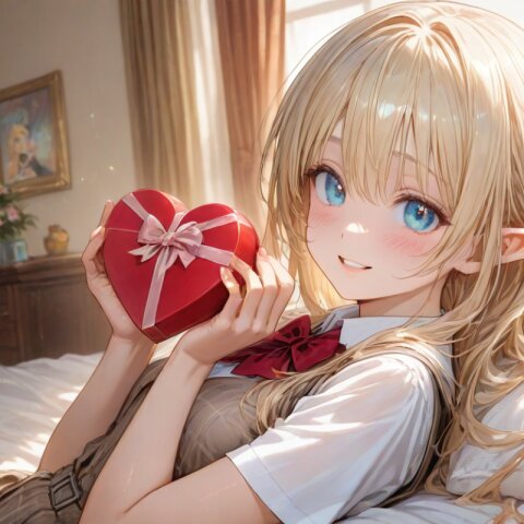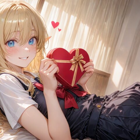 用意したチョコを持って想いをはせながら自室のベッドで佇むエルフさん