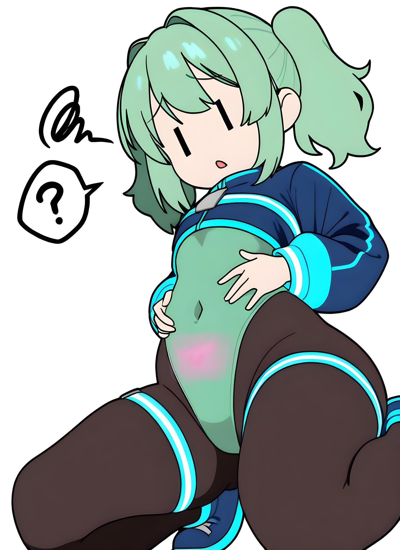 loli,solo,chibi,(flat breast),slim,thick thighs,light-green hair,twintails,vertical slit eyes,raised eyebrows,layering,cyber clothes,cybernetic blue jacket,separating green leotard and bodystocking,plain green leotard over bodystocking,covered navel,(white puffy shorts over stockings),black pantyhose,no shoes,light open mouth,kneeling,pubic tattoo,hands on own stomach,squiggle,spoken question mark,sitting,wariza,w legs,looking down,invisible floor,white background,simple background,from below,(stylized),(kawaii),(anime coloring),(cute),Bodystocking, black_bodystocking, skin_tight, see-through_waist, covered_navel,gddw,flat color,((correct_anatomy)),2DSD, SVG_ART, KIRAKIRA_BACKGROUND, |_|, 0_0