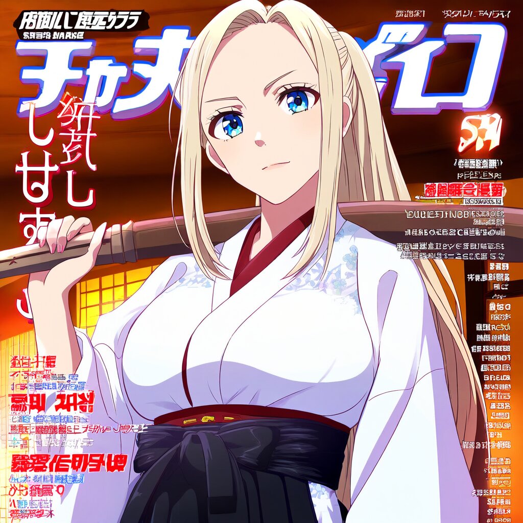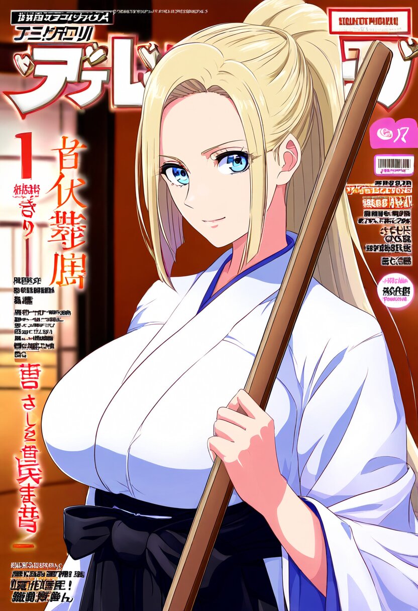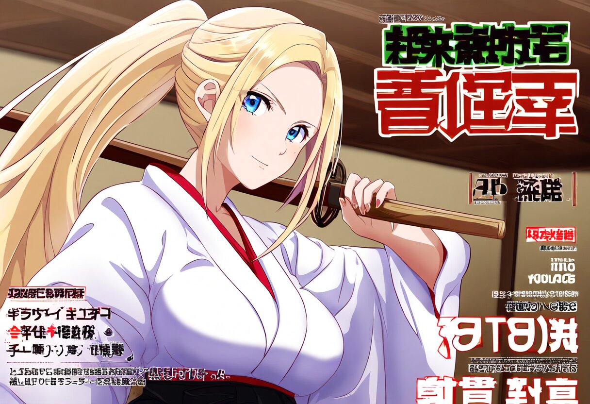 {{{highly detailed}}}, {{official style}}, {{game cg}}, {{intricate}}, {{adult woman}}, {{tenka hyakken}}, {{{{{fashion magazine cover, cover page}}}}}, 1girl, solo, ponytail, very long hair, blonde hair, blue eyes, forehead, large breasts, {{light smile, serious}}, {{{upper body}}}, {{{white kimono, black hakama}}}, {{{holding a wooden sword}}}, indoor, {{{masterpiece}}}, {{{best quality}}}, {{{very aesthetic}}}, {{{ultra-detailed}}}, {illustration}, {{{extremely detailed}}}, {{{an extremely delicate and beautiful}}}