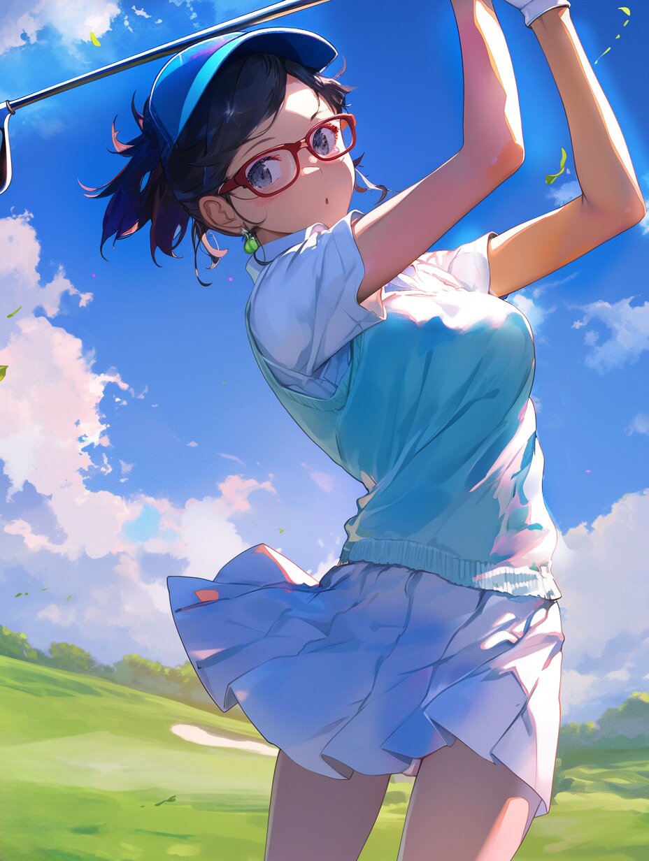 anime style,A young woman, around 20 years old, with black hair tied in a ponytail, wearing red-framed glasses. She is dressed in a stylish golf outfit, including a light pastel polo shirt and a matching skirt, paired with white sneakers. The scene is set at a golf practice range with a sunny sky in the background. She is mid-swing, focusing intensely, with a bucket of golf balls beside her and a lush green field extending into the distance