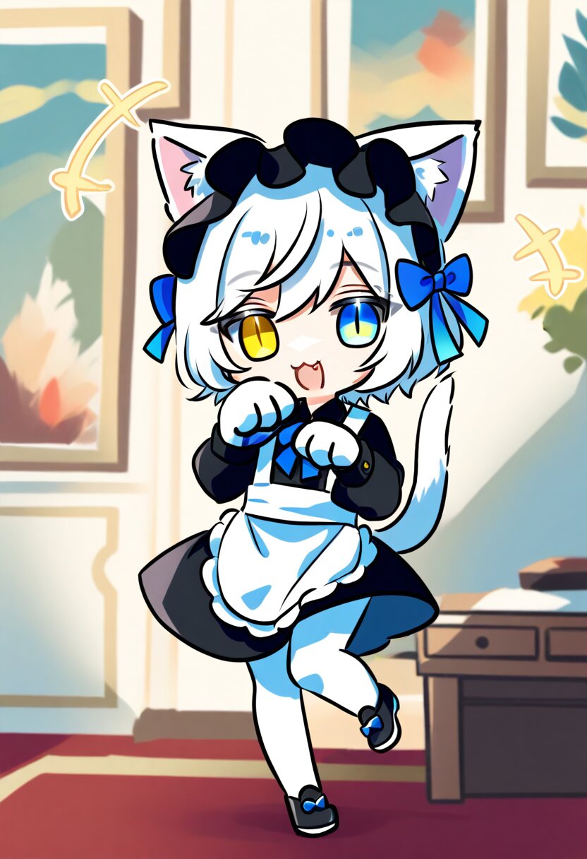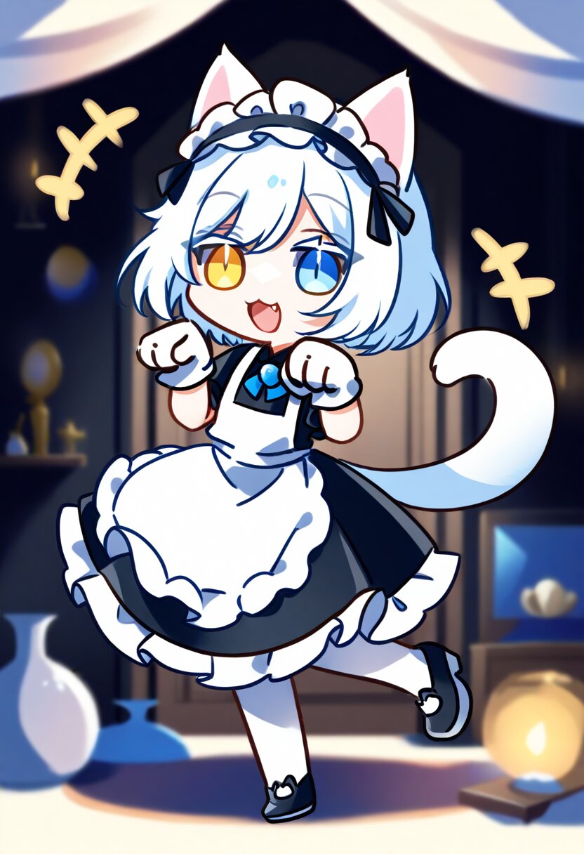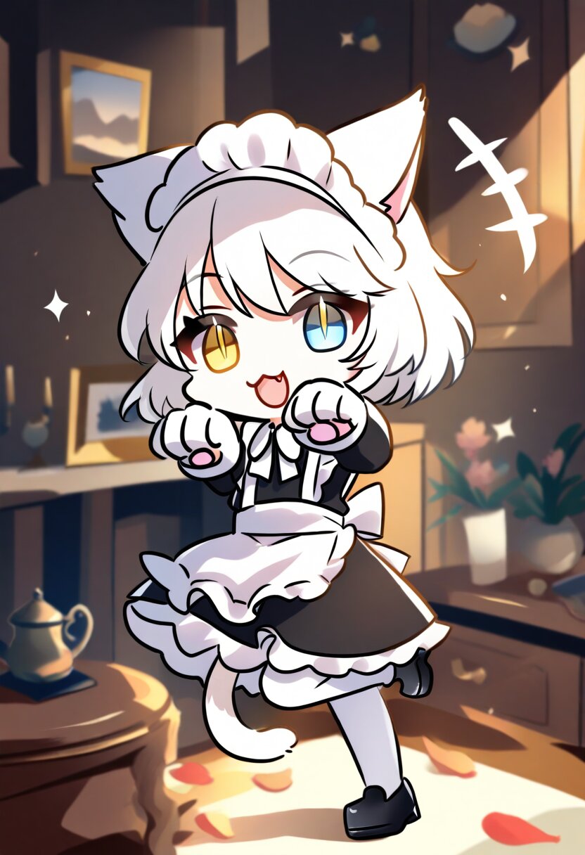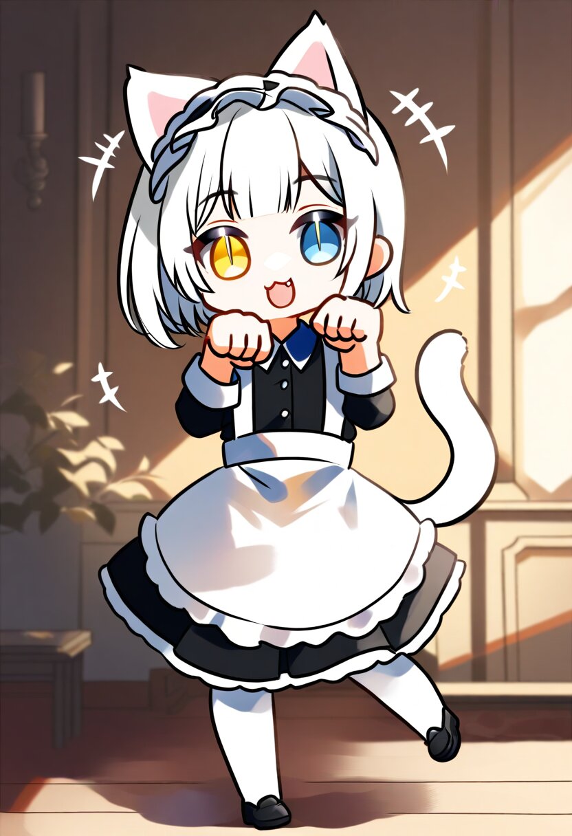 <lora:inmnsylexl4:1>best quality, masterpiece, very aesthetic, general, watercolor painting,, chibi, 1girl, solo, white hair, short hair, cat ears, cat tail, yellow and blue heterochromia, slit pupils, white apron, black dress, head dress, :3, smile, +++, open mouth, fang, paw pose, leg up, white tights, black shoes, antique room
