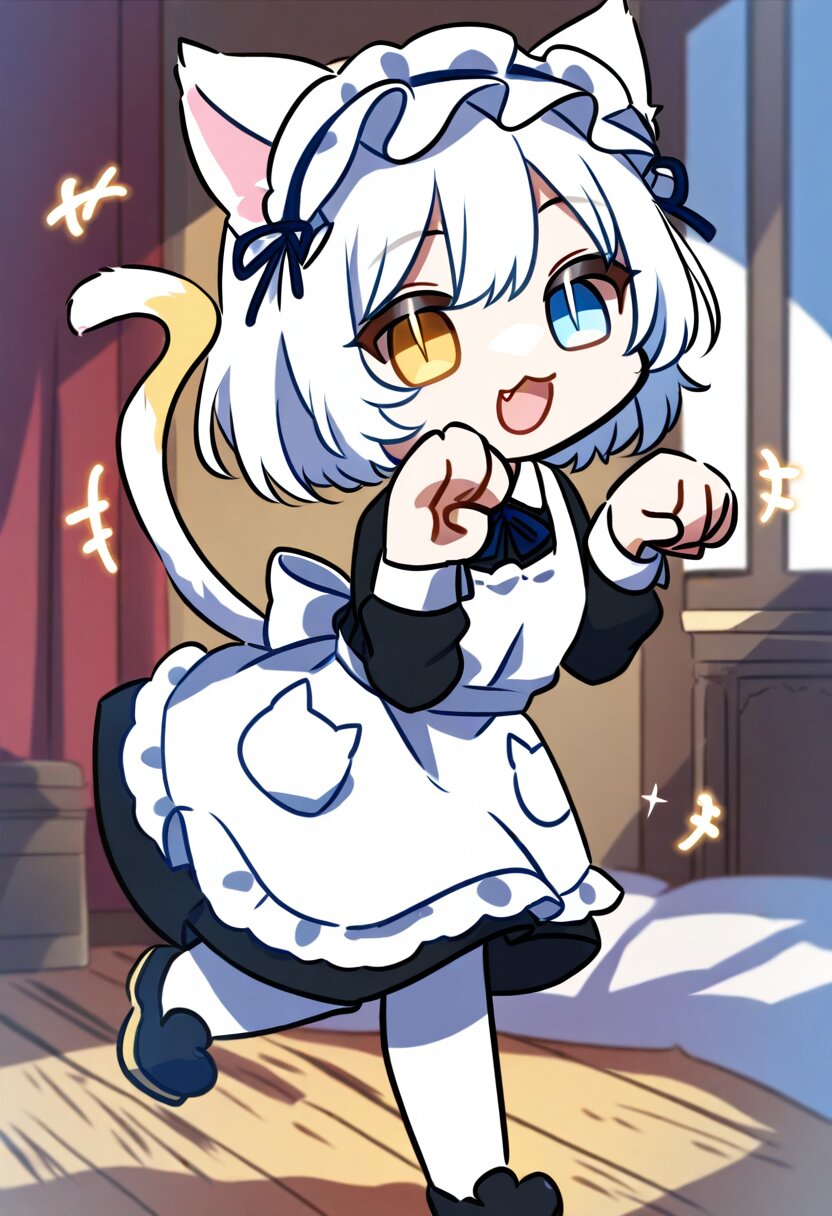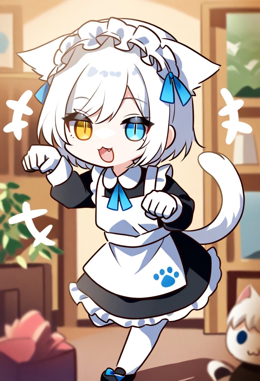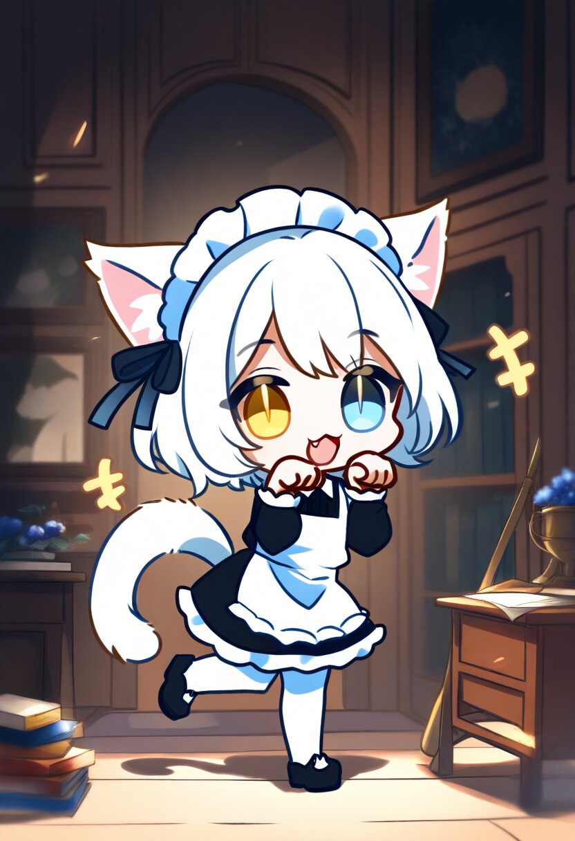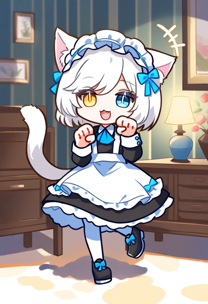 <lora:inmnsylexl4:1>best quality, masterpiece, very aesthetic, general, watercolor painting,, chibi, 1girl, solo, white hair, short hair, cat ears, cat tail, yellow and blue heterochromia, slit pupils, white apron, black dress, head dress, :3, smile, +++, open mouth, fang, paw pose, leg up, white tights, black shoes, antique room