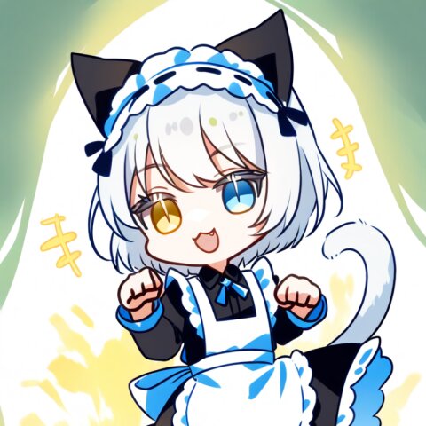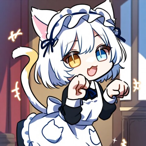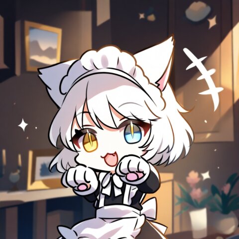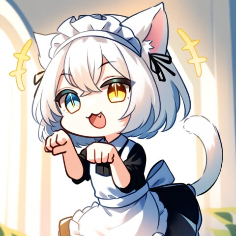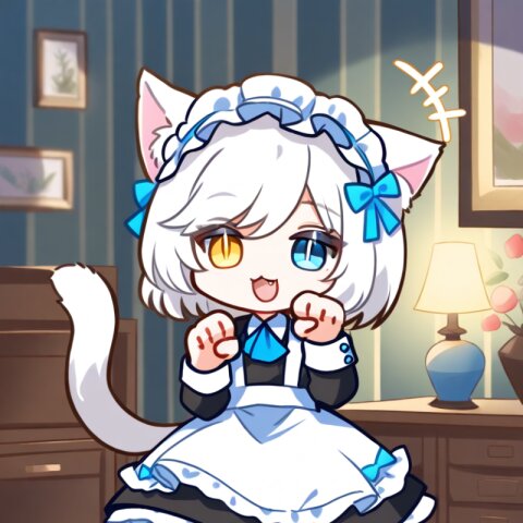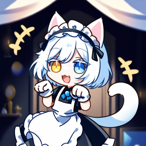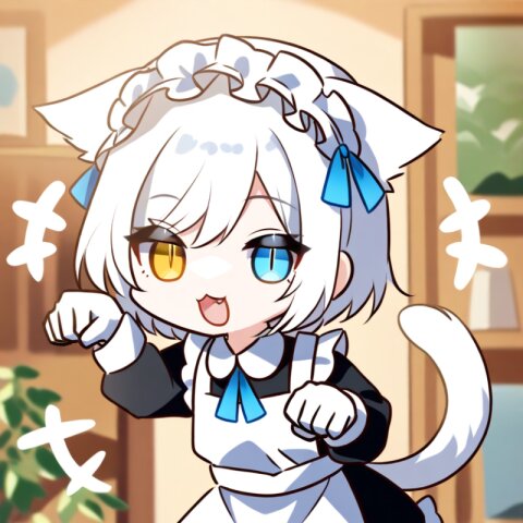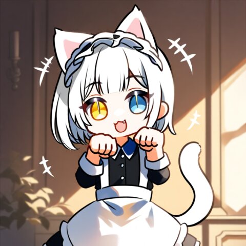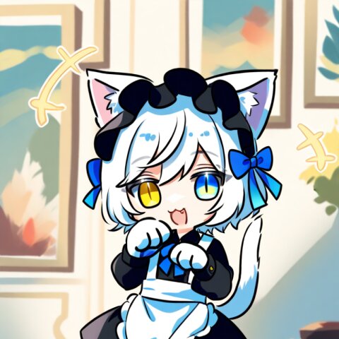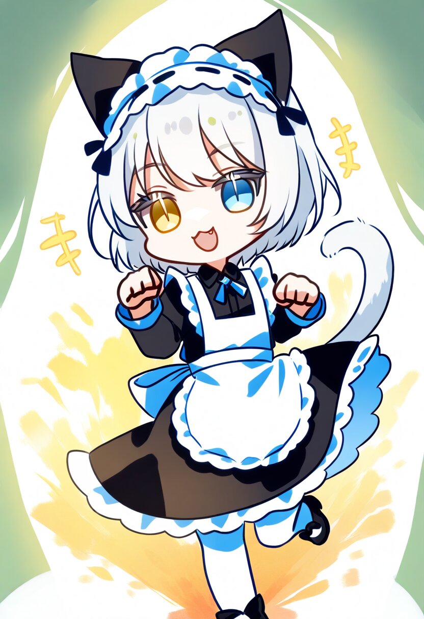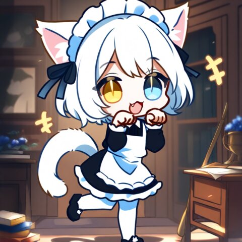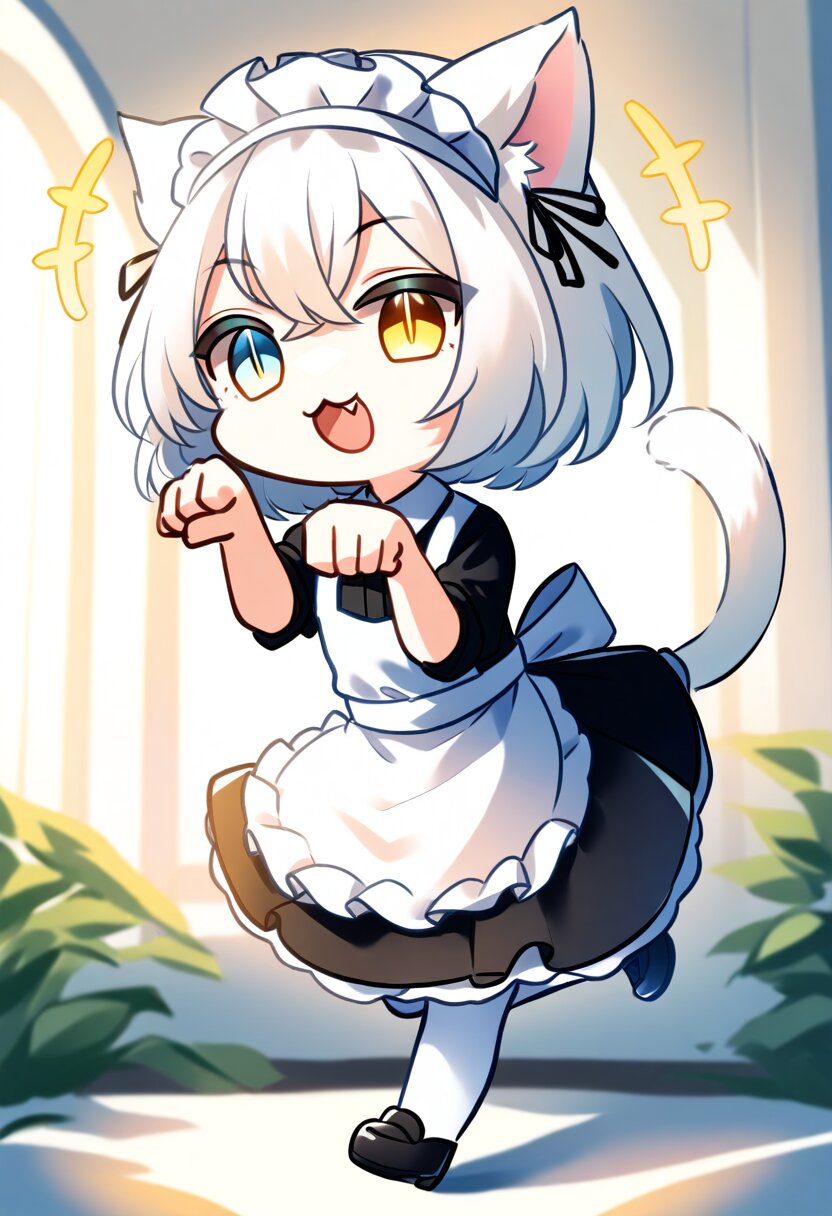 <lora:inmnsylexl4:1>best quality, masterpiece, very aesthetic, general, watercolor painting,, chibi, 1girl, solo, white hair, short hair, cat ears, cat tail, yellow and blue heterochromia, slit pupils, white apron, black dress, head dress, :3, smile, +++, open mouth, fang, paw pose, leg up, white tights, black shoes, antique room