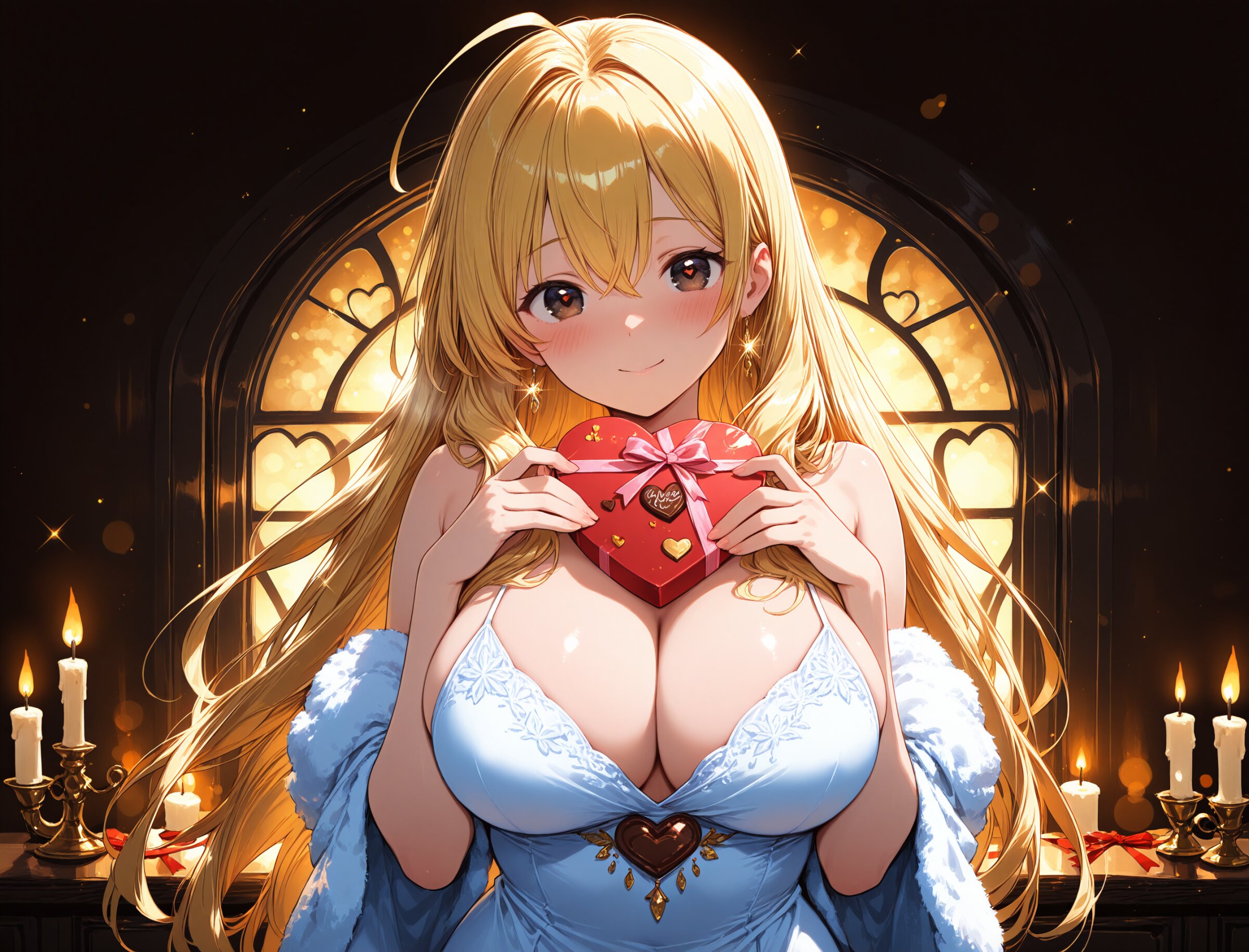 (upper body:1.8), long flowing hair, (blond hair), (dark copper eyes), ahoge:1.3, (large breast and hips:1.3), (elegant winter dress:1.3), (romantic valentine setting:1.5), (chocolate gift:1.3), (soft blush), (gentle smile), (warm and inviting atmosphere), (candle-lit background:1.3), (soft lighting), (heart-shaped decorations), (subtle sparkles in the air), (delicate and intricate details), (warm colors and cozy atmosphere), masterpiece, best quality, ultra-detailed, 8k resolution, cinematic lighting, very aesthetic, visually stunning, <lora:noobai_ep11_stabilizer_v0.11_fp16:0.7> <lora:StS-Illustrious-Detail-Slider-v1.0:2.> <lora:sdxl-hairdetailer_02:2> <lora:xl_more_art-full_v1:1.4> <lora:spo_sdxl_10ep_4k-data_lora_webui:0.7>