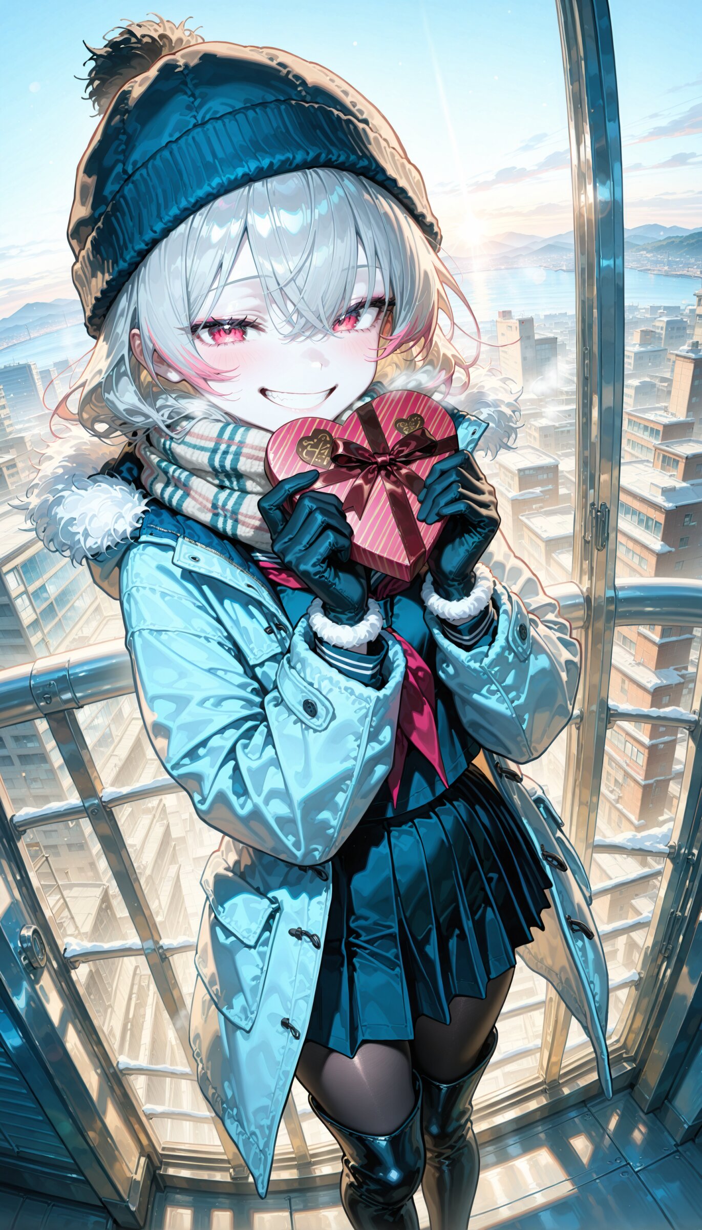 (fisheye,fisheye lens angle:1.0), aerial view, looking afar looking at viewer, 1girl, beautiful detailed eyes, cute face, cool, pale skin, skindentation, beautiful crimson eyes, , , platinum blonde hair, pink colored tips cute, medium hair, wavy hair long bangs ruffling hair shiny hair, first-rate female body perfect body beautiful small breasts, wide hips,, warm comfy naughty face and (shiny smile:1.3) and grin and :p, seductive smile (wearing winter clothes, winter scarf, enpera, white fur gloves, long coat:1.1), winter hat, serafuku in hooded coat, long sleeves, neckerchief short plated skirt, long sleeves, pantyhose, thigh boots (smile absently:1.0), depth of field, bokeh, morning street, cityscape, Factory or warehouse area Industrial buildings with trucks starting up., winter sunlight, morning, sunshine, direct lighting, valentine , holding chocolate, box of chocolates, gift box, ribbon (simple watercolor background:1.0) super fine concept art, hard surface, 8K, unreal engine, masterpiece, best quality, amazing quality, very aesthetic, absurdres, you can add scenery, (volumetric lighting), To make the background more distinctive. professional art lots of details, , overexposure, shiny-glistening, (watercolor style:0.0), (pastel color style:1.0) <lora:noline (1):-0.5> <lora:sdxl2-flat2-512b:-1.0> <lora:facelightup_xl_v10:0.5>