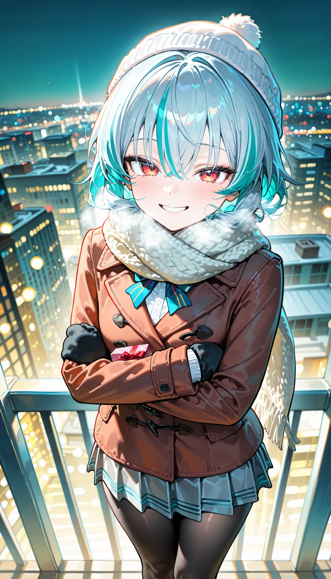 (portrait:1.2) (from above,looking up:1.2) looking at viewer, 1girl, beautiful detailed eyes, cute face, cool, dark skin, skindentation, beautiful red eyes, , , pale blue hair, white streaked hair, highlights hair cute, shoulder length hair, front ponytail husky hair , hair tubes, first-rate female body perfect body beautiful small breasts, medium hips,, warm comfy (kind smile:1.3) and gently smile and thinking, seductive smile (wearing winter clothes, winter scarf, , black mittens, pea coat:1.1), winter hat, school blazer in pea coat, shirt bowtie long plated skirt , long sleeves, black pantyhose, (smile absently:1.0), depth of field, bokeh, morning street, cityscape, Apartment complex area Tall buildings with students walking between them., winter sunlight, morning, sunshine, direct lighting, valentine crossed arms, holding chocolate, gift box, ribbon (simple light turquoise green background:1.0) super fine concept art, hard surface, 8K, unreal engine, masterpiece, best quality, amazing quality, very aesthetic, absurdres, you can add scenery, (volumetric lighting), To make the background more distinctive. professional art lots of details, , overexposure, shiny-glistening, (watercolor style:1.0), (pastel color style:0.0) <lora:noline (1):-0.5> <lora:sdxl2-flat2-512b:-0.5> <lora:facelightup_xl_v10:0.5>
