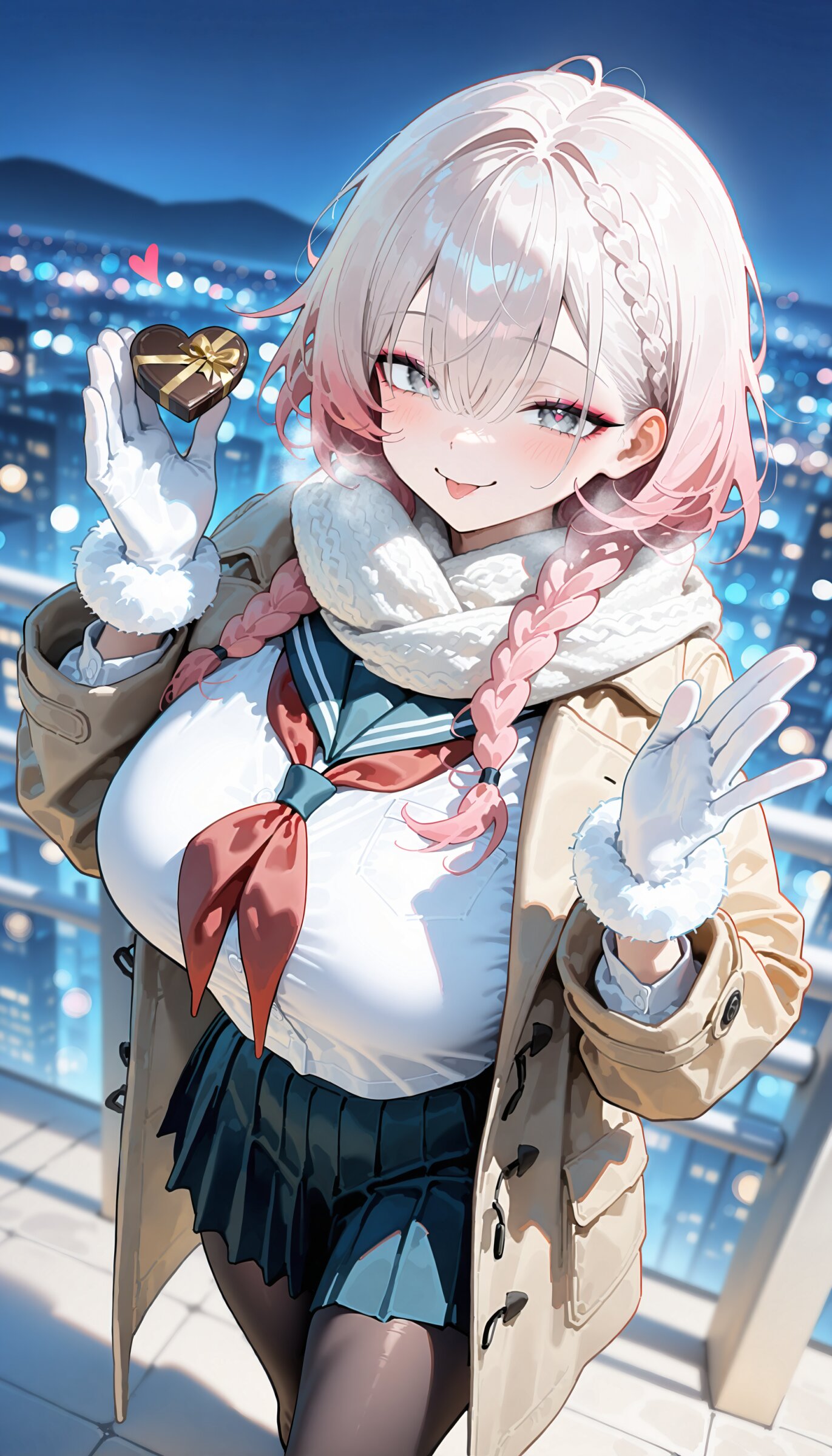 (face:1.2) (from above,looking up:1.2) looking at viewer, 1gyaru, beautiful detailed eyes, cute face, cool, dark skin, skindentation, beautiful lightgray eyes, , , pink hair, darkorange colored tips cute, chest length hair, braid long bangs , messy hair, first-rate female body perfect body beautiful huge breasts, medium hips, eyeshadow, , warm comfy affectionate expression, loving, tender, caring action and (kind smile:1.3) and :p, seductive smile (wearing winter clothes, winter scarf, , white fur gloves, over coat:1.1), , serafuku in trench coat, long sleeves, neckerchief short plated skirt, long sleeves, brown pantyhose, (smile absently:1.0), depth of field, bokeh, morning street, cityscape, Quiet residential area Rows of houses with small gardens and blooming flowers., winter sunlight, morning, sunshine, direct lighting, valentine clapping, holding chocolate, heart-shaped chocolate, gift box, ribbon (simple light gentian blue background:1.0) super fine concept art, hard surface, 8K, unreal engine, masterpiece, best quality, amazing quality, very aesthetic, absurdres, you can add scenery, (volumetric lighting), To make the background more distinctive. professional art lots of details, , overexposure, shiny-glistening, (watercolor style:1.0), (pastel color style:1.0) <lora:noline (1):-0.5> <lora:sdxl2-flat2-512b:0.2> <lora:facelightup_xl_v10:0.5>