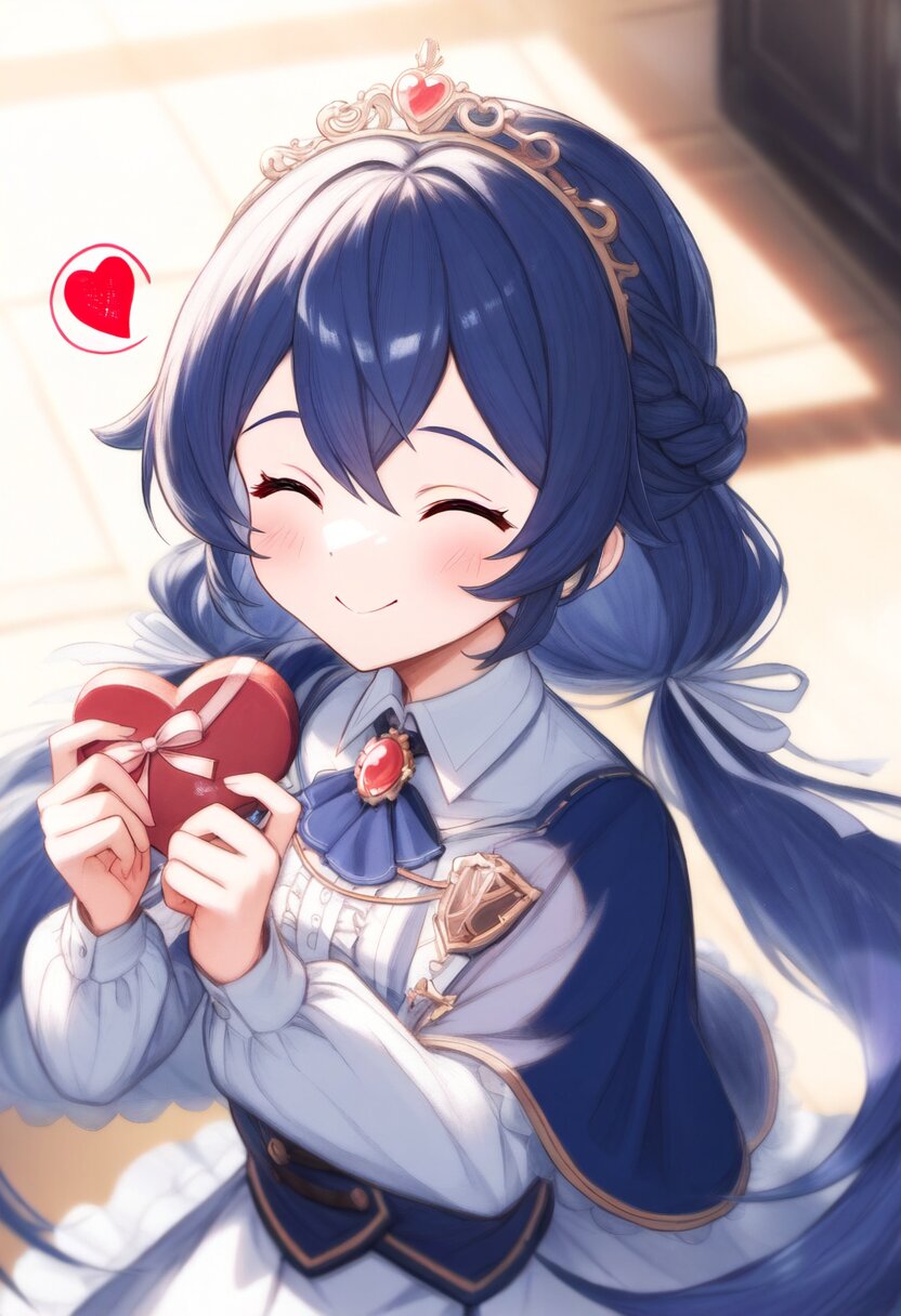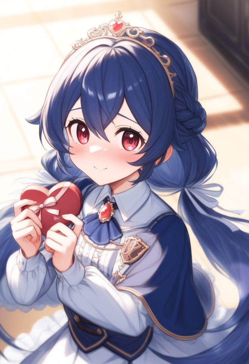 rating:general, best quality, amazing quality, great quality, very aesthetic, aesthetic, absurdres,girl,short stature,flat chest,red eyes,{{cobalt Blue hair}},{pigtails},very long hair,long half updo,{{low twintails}},{{{extra long sideburns}}},{{Paladin}},Knight,brooch ribbon,Short Cape,White tiara,embarrassed,light smile, blushing,Holding a Valentine's Chocolate,(nice hands, perfect hands: 1.0),upper body,from above, best quality, amazing quality, very aesthetic, absurdres