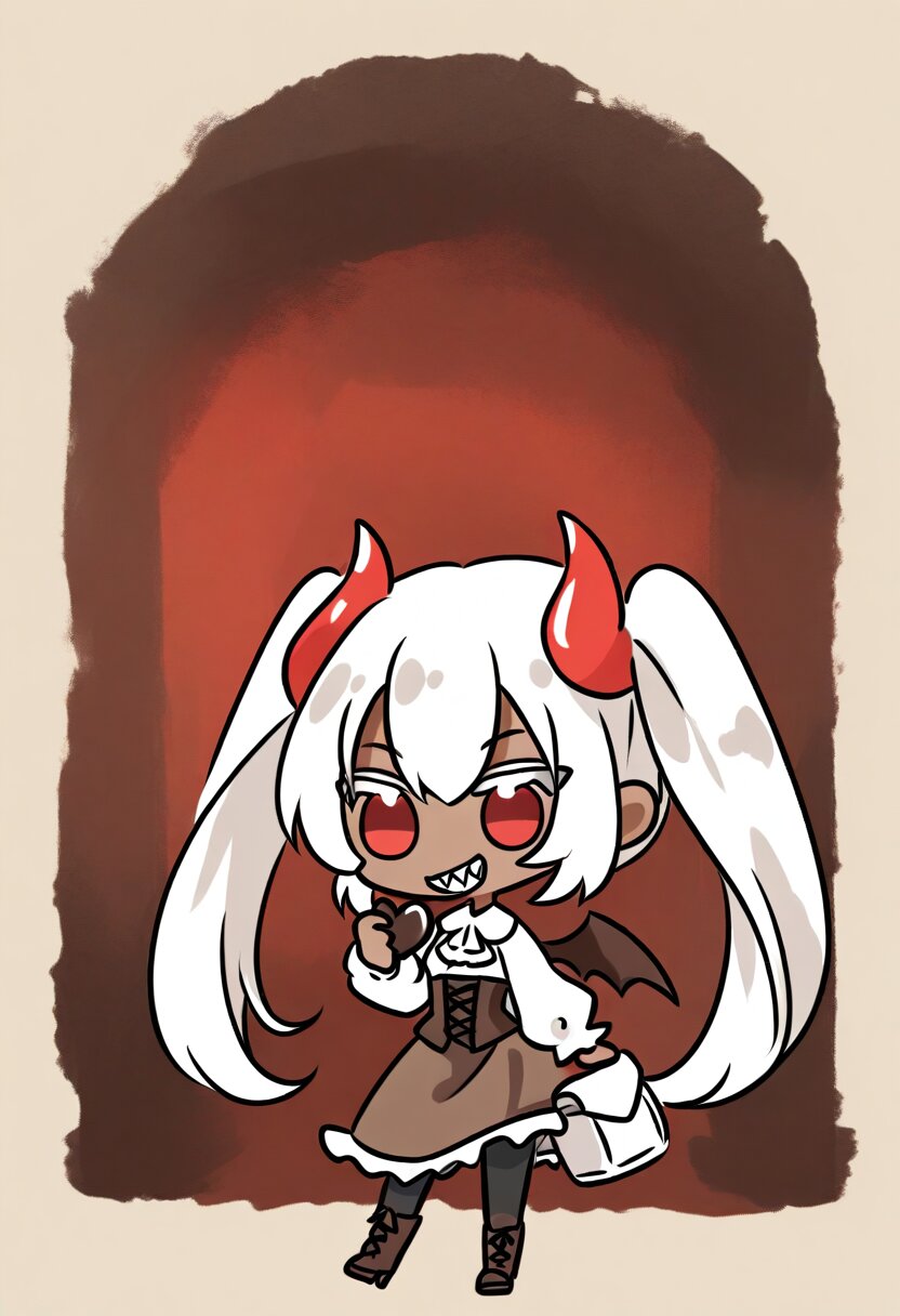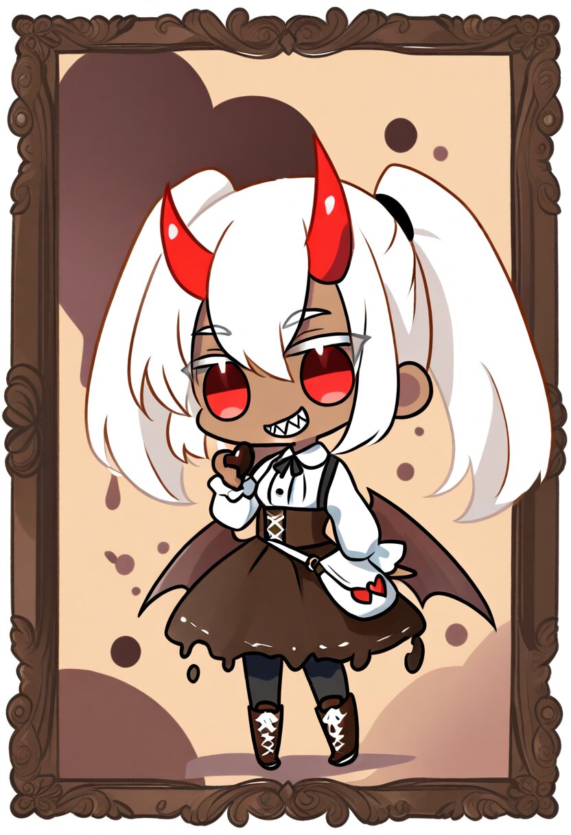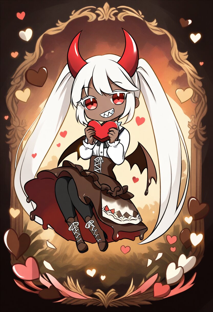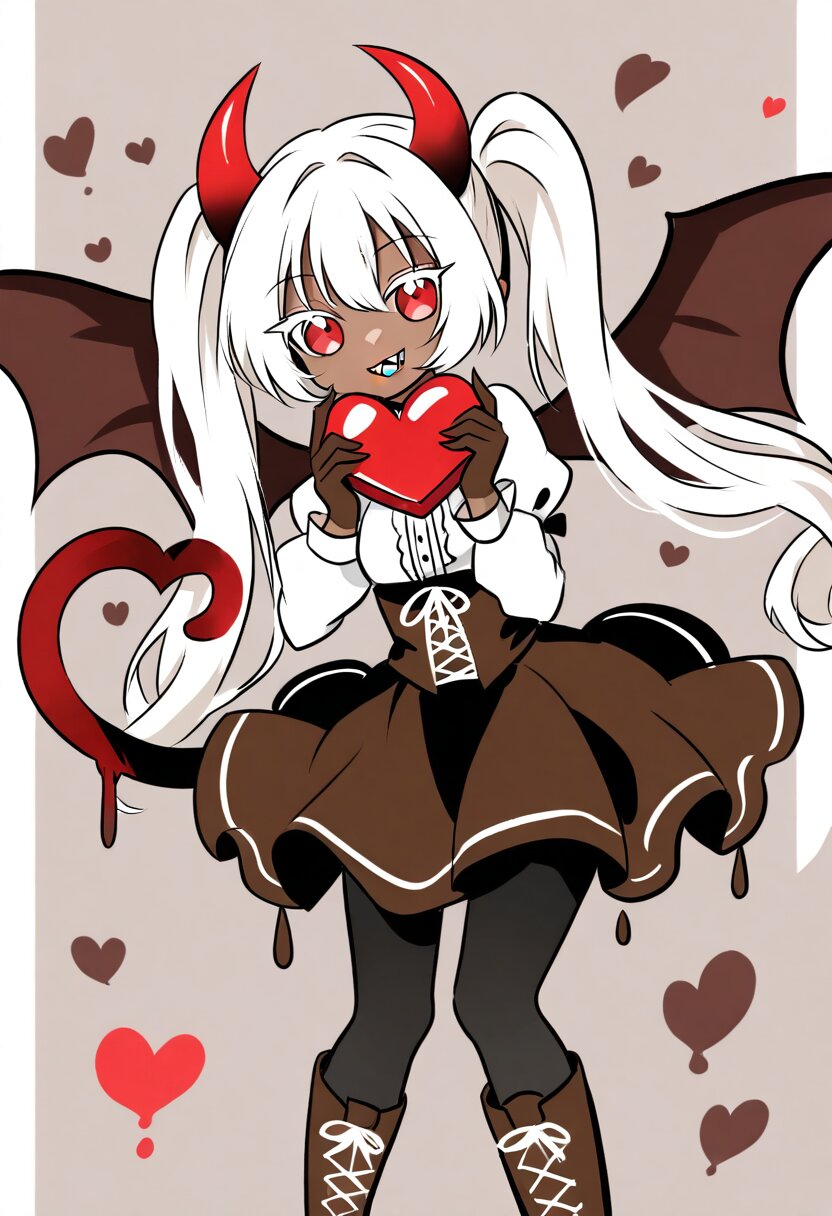 <lora:inmnsylexl4:1>best quality, masterpiece, very aesthetic, watercolor painting, general, 1girl, brown skin, grin, sharp teeth, red eyes, large eyes, white hair, twin tails, red devil horns, heart tail, brown devil wings, white blouse, brown lace-up corset, brown skirt, melting skirt, white pannier, black tights, brown lace-up boots, holding heart-shaped chocolate, flying heart, Valentine motif background