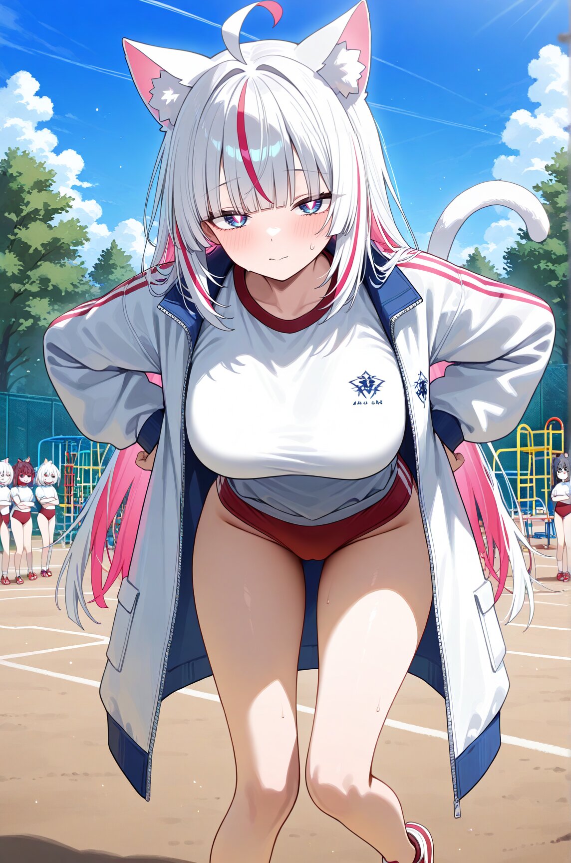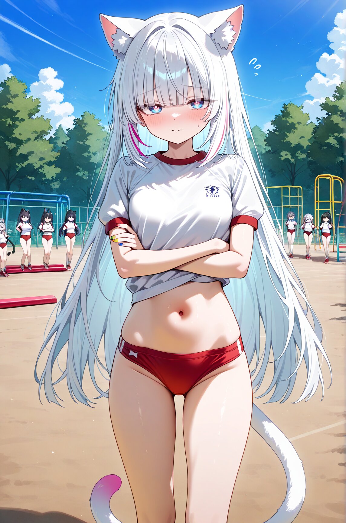 visible panties, for an adolescent girl, exposed right down to the groin, her body shape is completely visible, practically underwear, visible panties, anime girl in white gym clothes, alone, solo, cat ears, white gym clothes, red visible panties, shy, cat tail, cat girl, white hair, looking at the viewer, trying to hide the visible panties by pulling them out with a long jacket, the visible panties are so long they can't be seen, red sneakers, hime cut, long bangs, straight, openly closed mouth, ahoge, neon hair, all neon line drawings, attractive girl with a good figure, erotic breasts, erotic body, erotic in every way, large breasts, beautiful breasts, blue eyes, red pupils, large eyes, narrow eyes, slanted eyes, multiple highlights, wide open, being watched by everyone, high school playground, standing pose leaning forward with arms crossed, masterpiece, best quality, newest, very awa