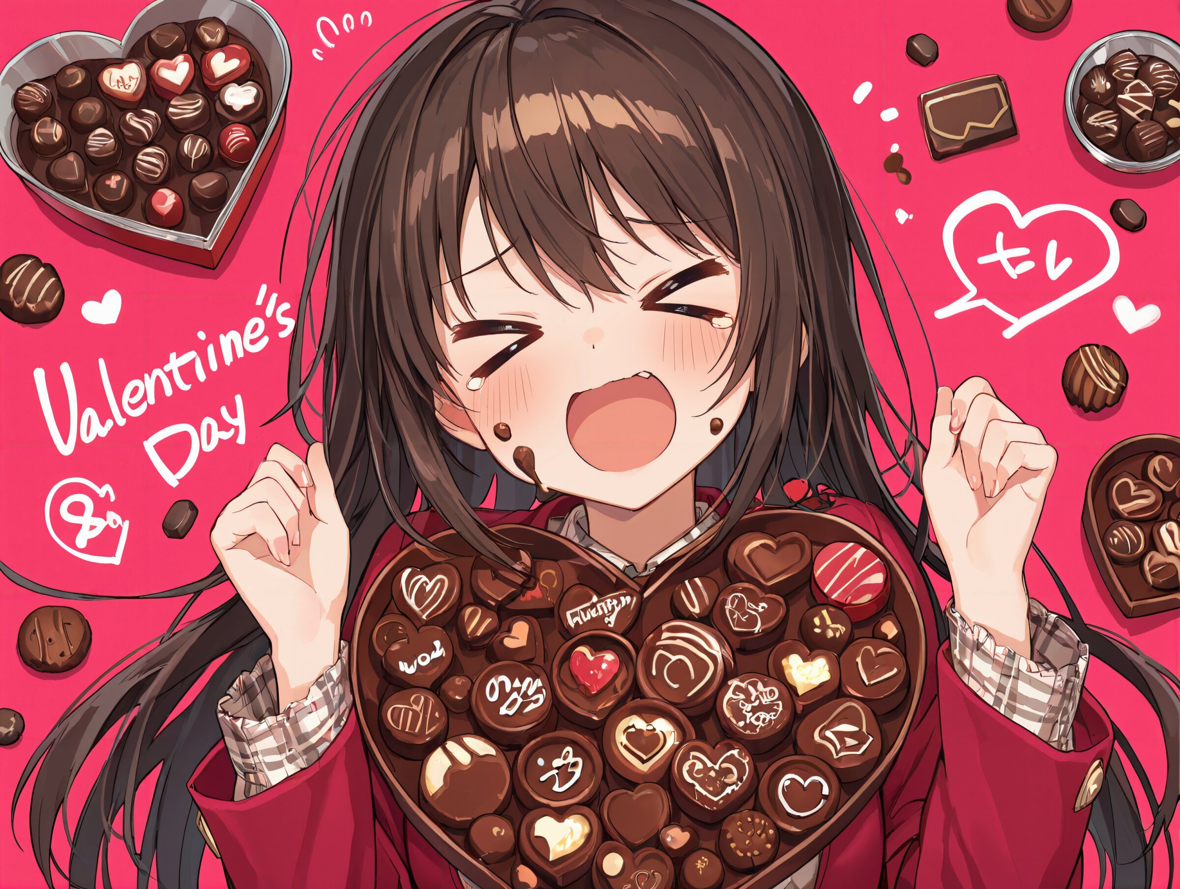 rating safe,masterpiece,best quality,amazing quality,very aesthetic,high detailed skin,alluring high resolution,intricate detail,8k, BREAK valentine,chocolate,many chocolate, 1girl,w arms,> <,,