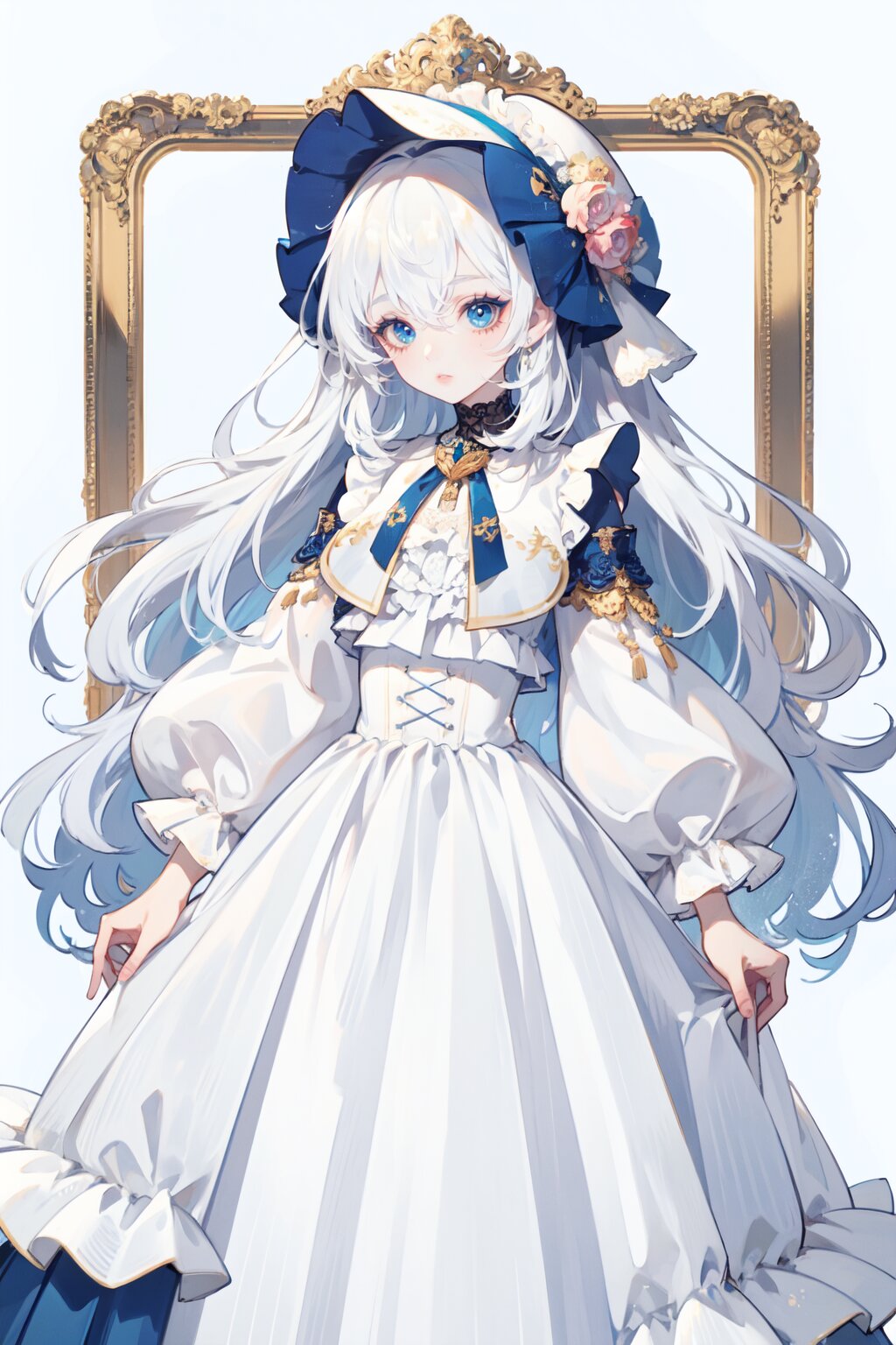 absurdres,detailed and intricate, (best quality),1 girl,happy,super beautiful,extremely detailed, BREAK,(white hair:1.3),Elegant hair,long hair,drill hair, BREAK,(blue eye:1.2) ,beautifu eyes,vibrant eye,beautiful and delicate eyes, BREAK,loliita,lolita fashion,white lolita,pannier,classical lolita,innocent world brand,(long Skirt:1.5),long sleeve,bonnet hairband,(white Clothes:1.8),(frills:1.5),flowy,ruffle,