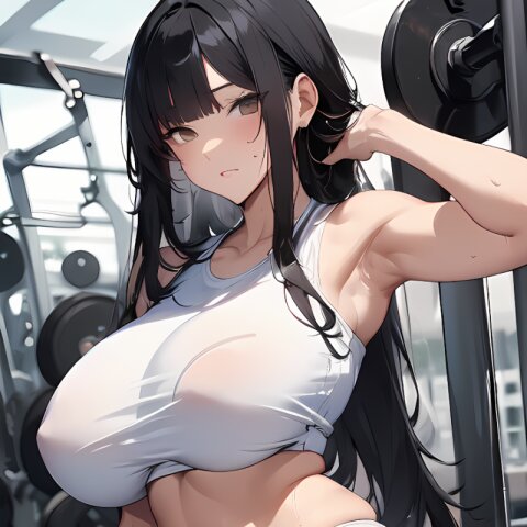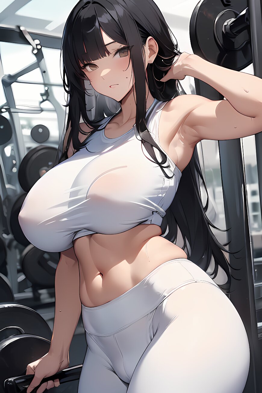 (best quality),(masterpiece),(ultra detailed),1 lady, long hair, black hair, blunt bangs, cool, white sportswear, breasts, gym, sweat, leggings