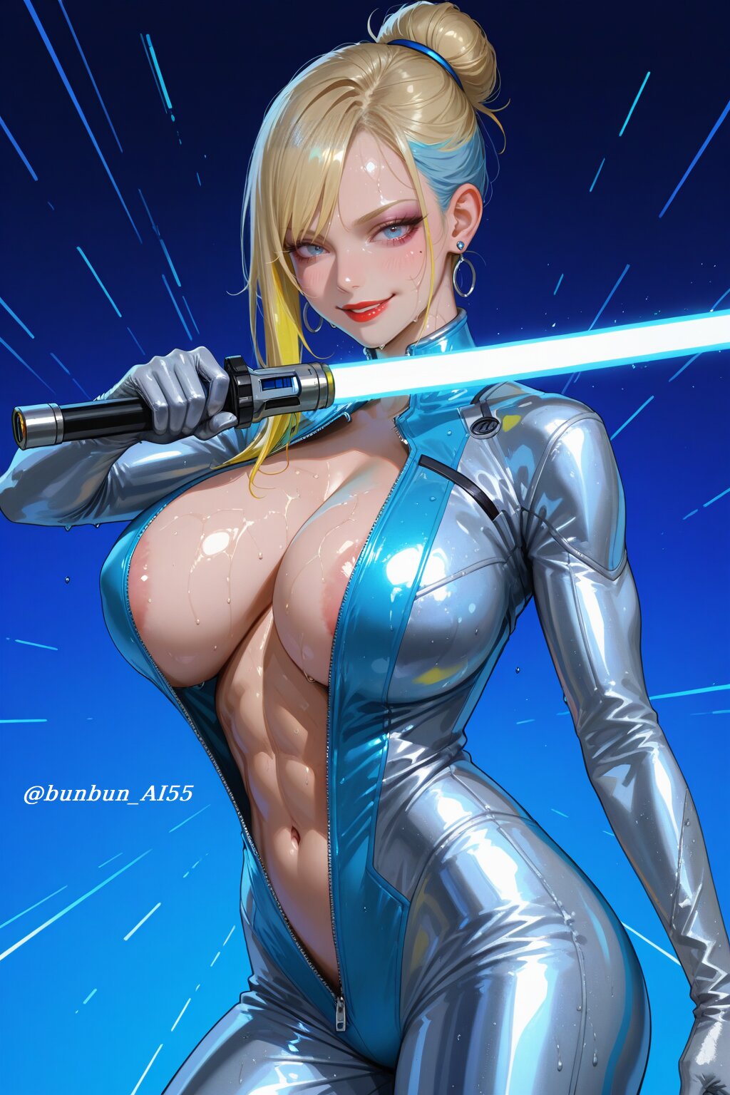 best quality, amazing quality, absurdres, amazing quality, ultra-detailed,8K,(hyperrealistic:1.2), (photorealistic:1.2), zPDXL3, BREAK (photo of a beautiful model 18 years old tall ([russian:japanese:0.4]) girl), perfect lighting, forward lighting, detailed face, beautiful girl's face, perfect eyes, perfect hands, perfect fingers, realistic eyes, BREAK (cyberpunk art style), ([russian:japanese:0.4]), (huge breasts, breasts apart, pointy breasts, huge areolae), (Wear a multicolored bodysuit in silver and blue:1.5), (sci-fi suit, spandex, catsuit), ((navel:1.2, cleavage, cleavage cutout, plunging, center opening, unzipped)), (silver latex gloves:1.2), ((emphasize body line)), (light reflections), (shiny, glossy, luster, vibrant, glaze, brilliance, latex), nsfw, BREAK (long hair, single hair bun, multicolored hair in brown and blonde), (adult), cute face, small face, make up, (seductive smile, blush), (Muscles:1.1, abs), (shiny skin, wet skin), (jewelry, piercing, earrings), (red lips), BREAK (standing:1.2), (fighting action, holding large lightsaber, slashing with a lightsaber:1.5, aiming at viewer:1.5, aiming:1.2, slashing effect), BREAK (looking at viewer:1.2, bust-up shot, medium shot, breasts focus), (from side:1.5), (cyberpunk background),