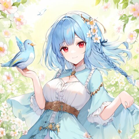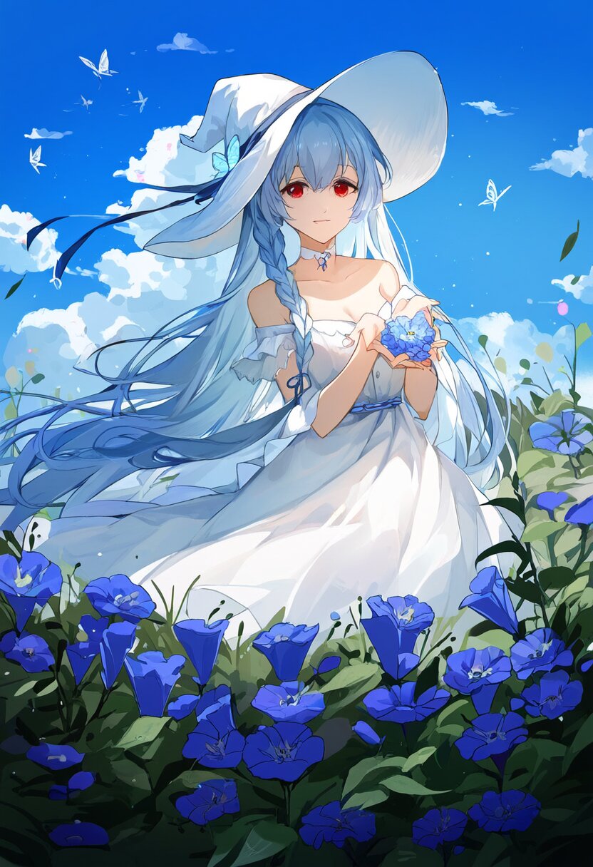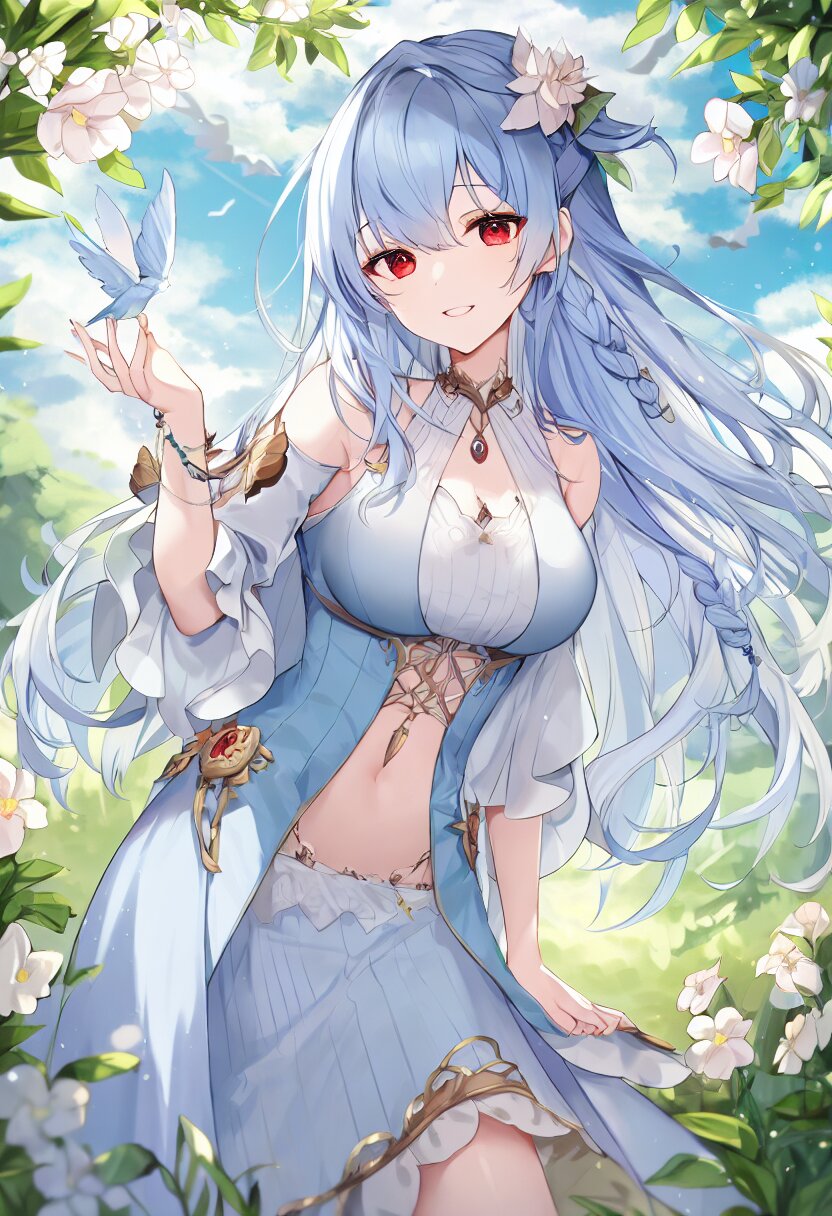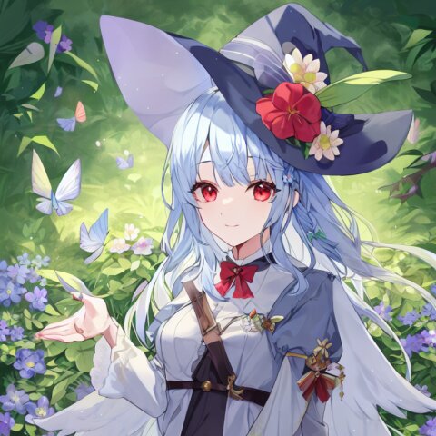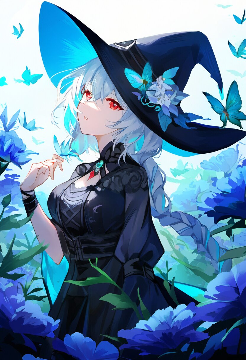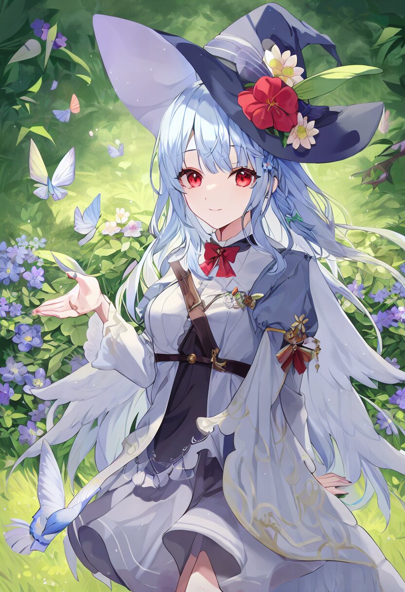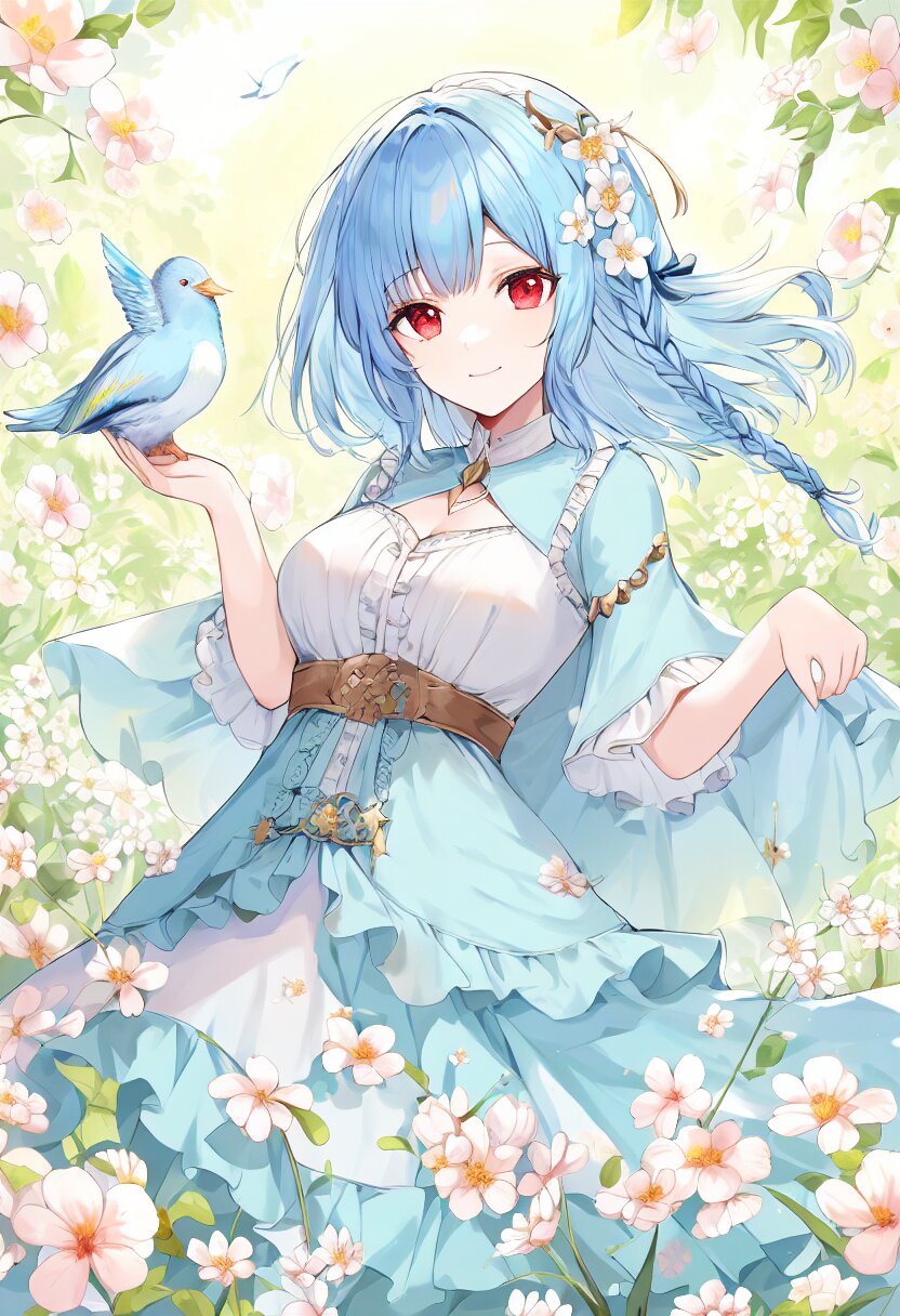 very aesthetic, best quality, absurdres, In a salvia field, a witch with light blue hair and a side braid stands amidst blooming flowers. Her red eyes shimmer as birds and butterflies surround her, and her presence shifts the bright, cheerful atmosphere into one of magical intrigue.