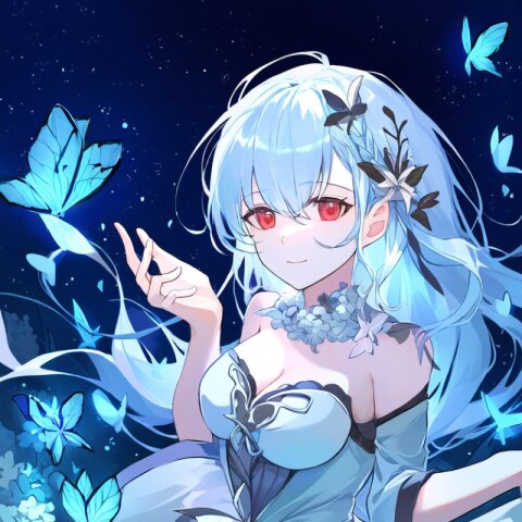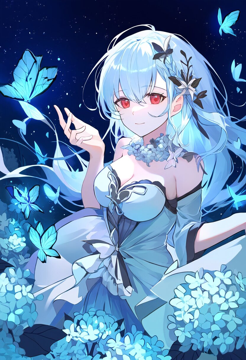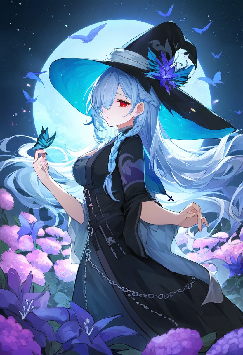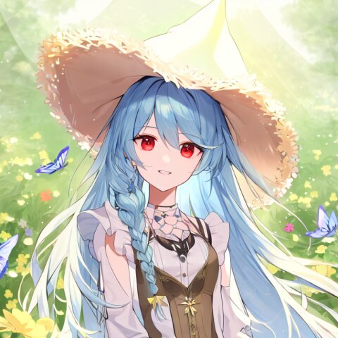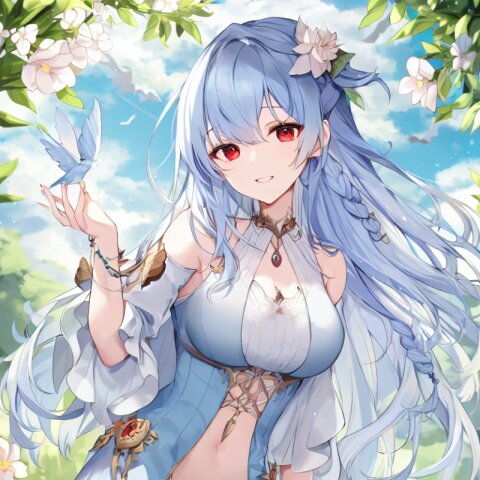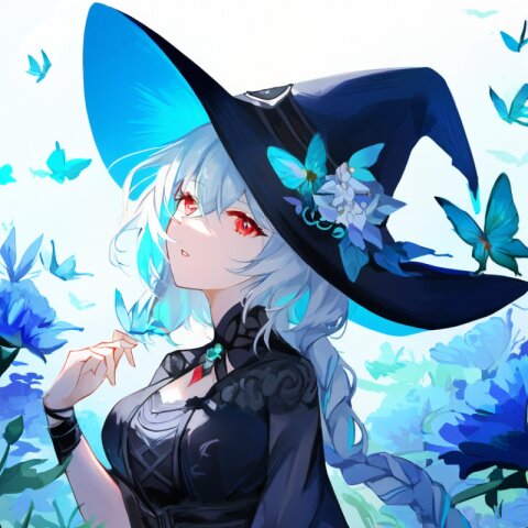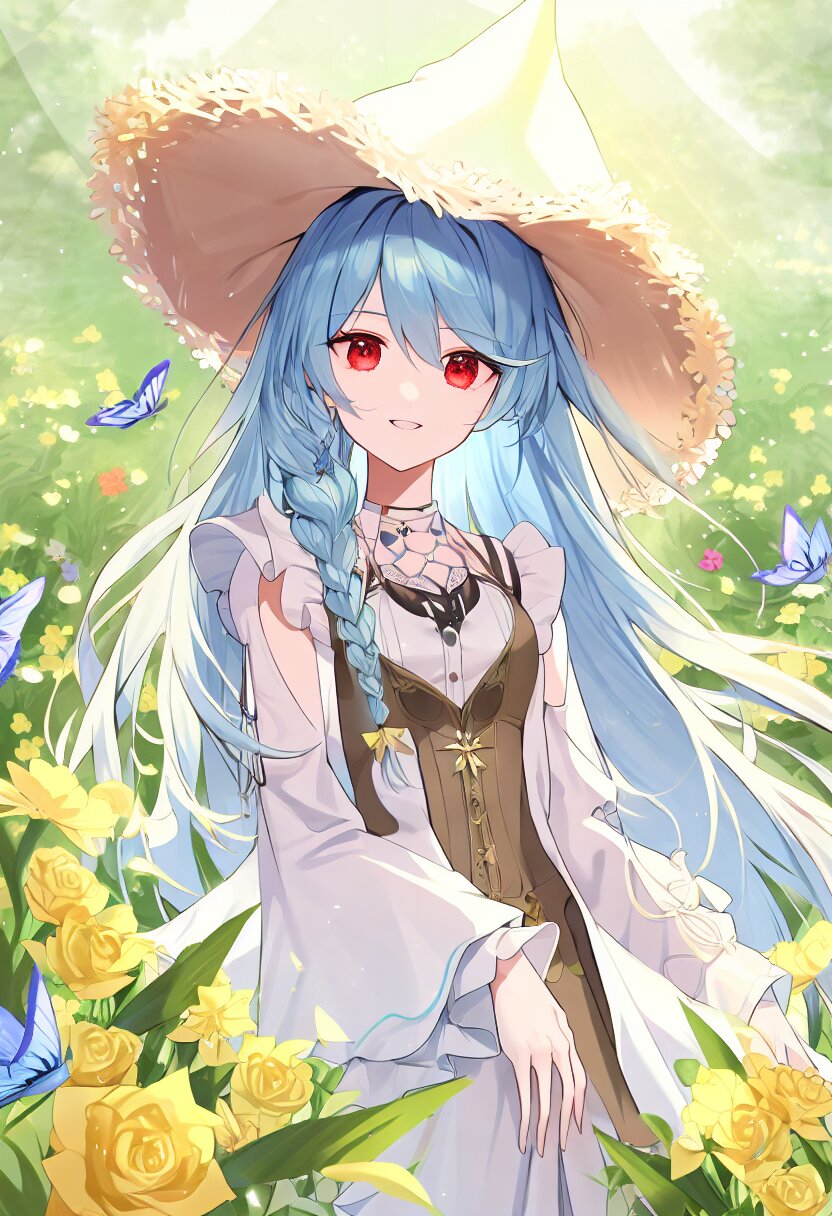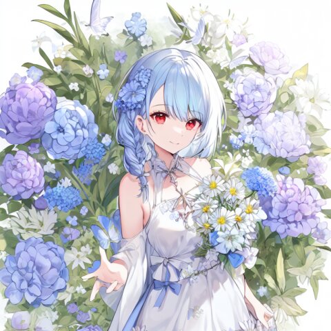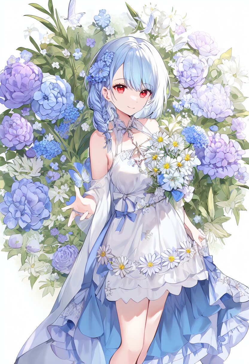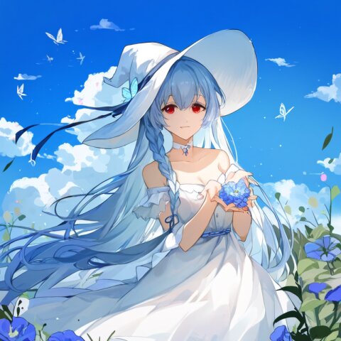 very aesthetic, best quality, absurdres, In a salvia field, a witch with light blue hair and a side braid stands amidst blooming flowers. Her red eyes shimmer as birds and butterflies surround her, and her presence shifts the bright, cheerful atmosphere into one of magical intrigue.