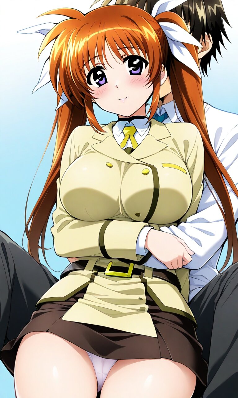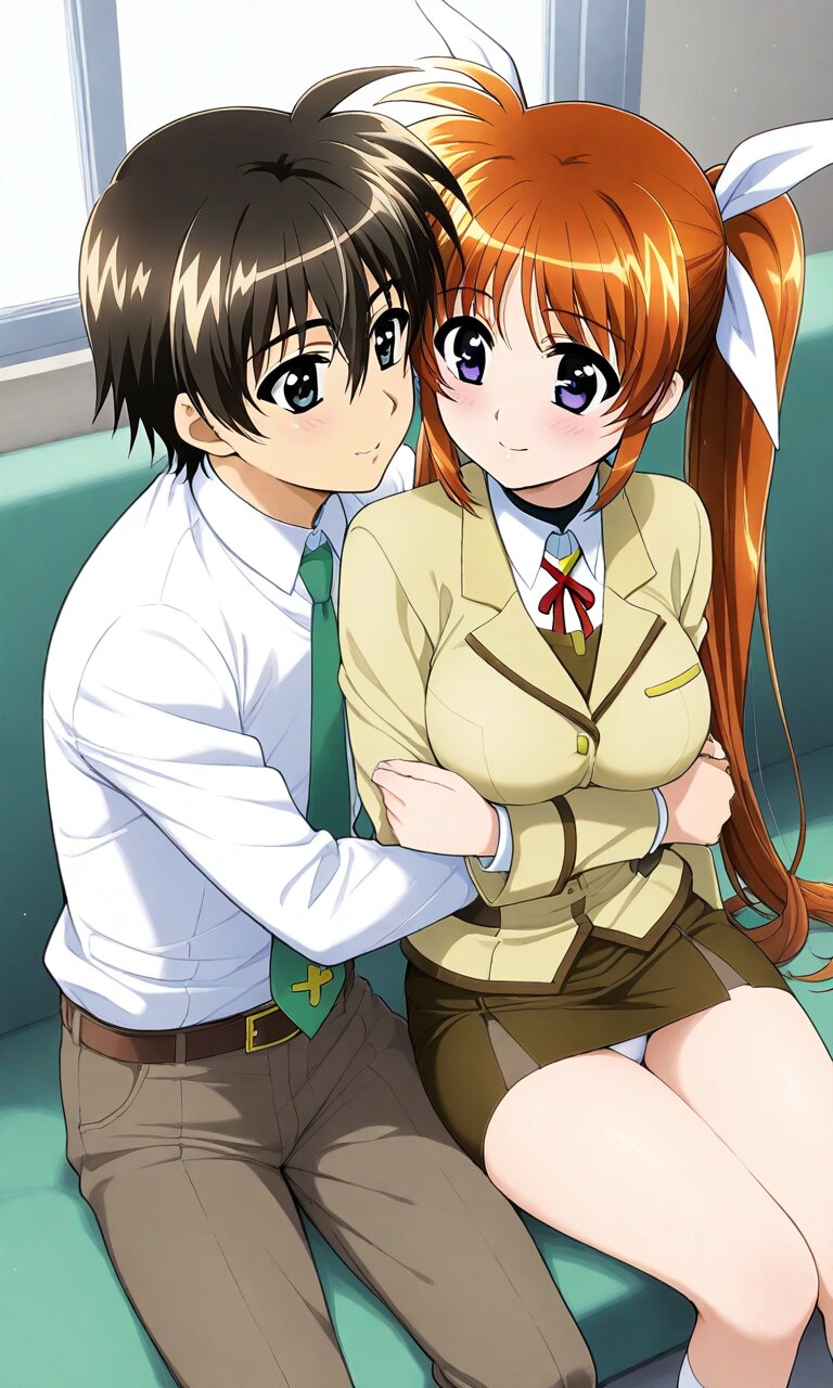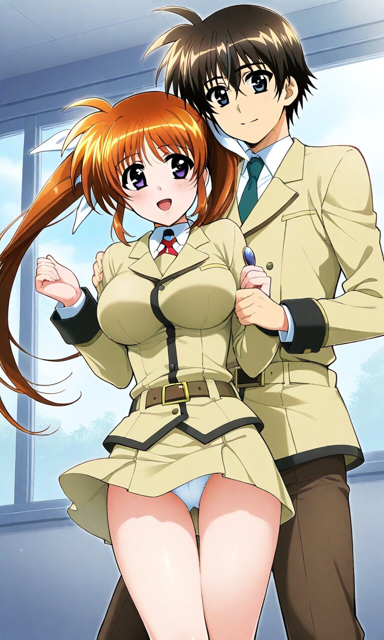 Couple, boy and girl, two people only,absurdres, ultra-detailed, master piece, high resolution, 8k, Boy, girl, couple, a person in anime costume hugging another person , 1girl, 1boy, ashford academy school uniform, underwear, panties, pantyshot, school uniform BREAK the boy(original boy, black hair, black eyes, short hair) BREAK the girl(takamachi_nanoha, 1girl, solo, brown hair, twintails, long hair, purple eyes, large breasts, ),