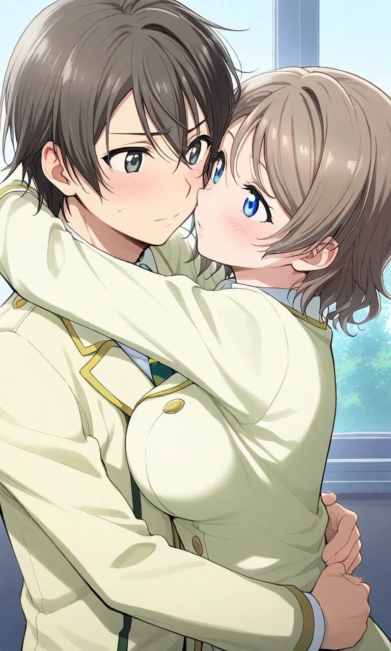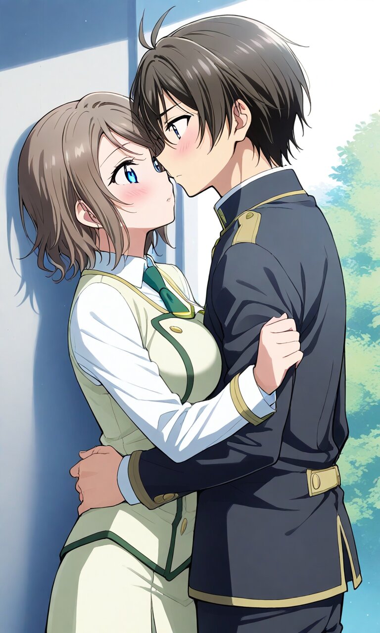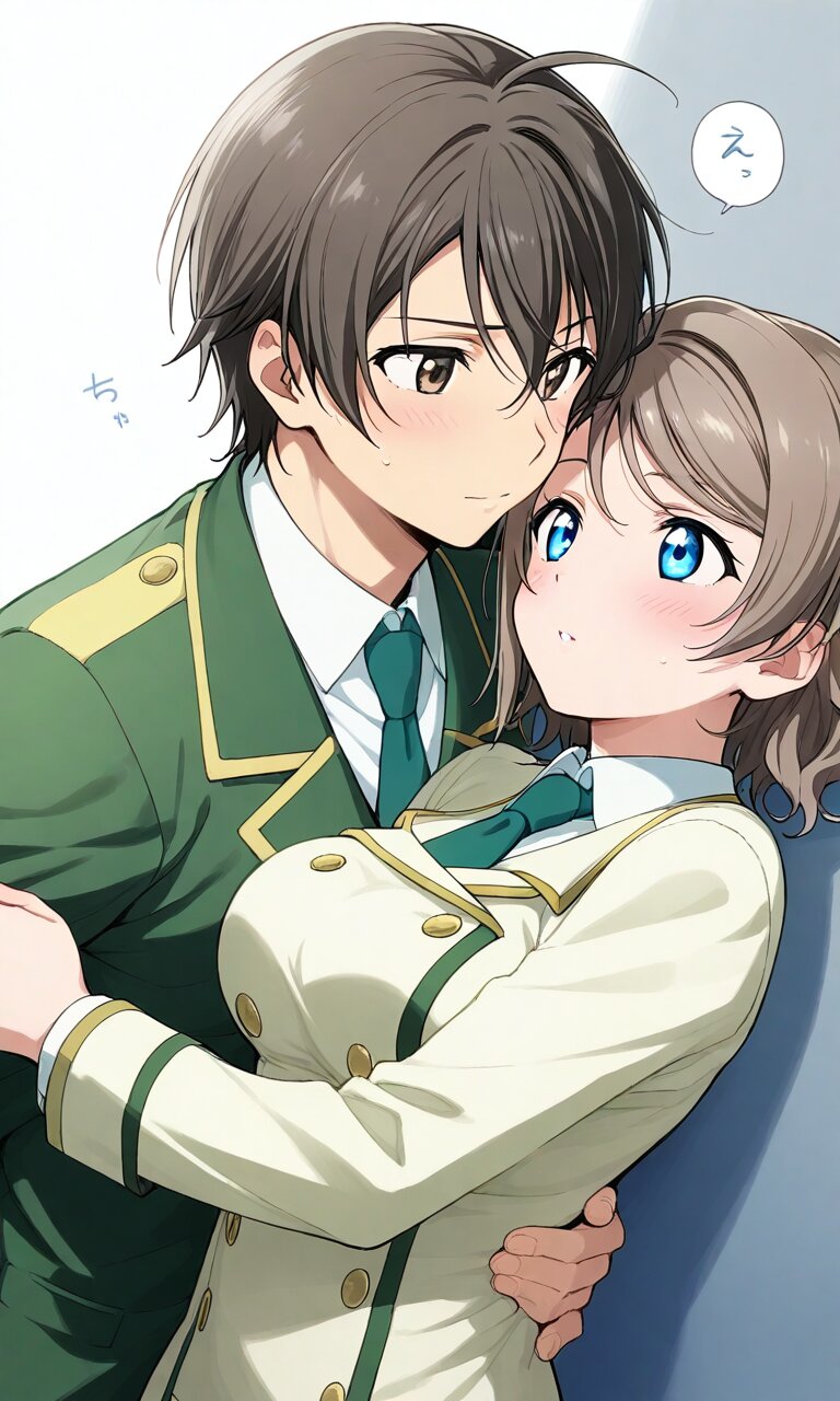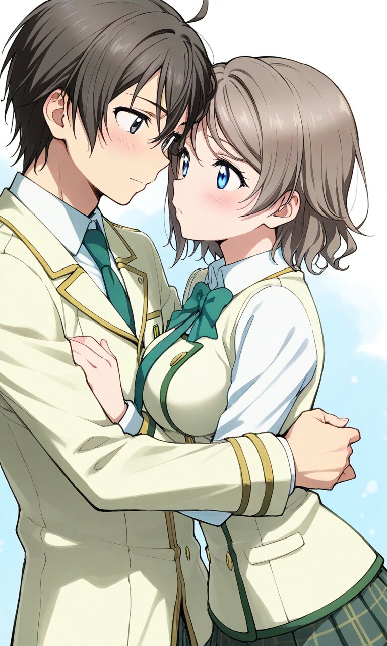 Couple, boy and girl, two people only,absurdres, ultra-detailed, master piece, high resolution, 8k, Boy, girl, couple, a cute couple embracing with japanese text around them, 1girl, 1boy, ashford academy school uniform, school uniform, blush, hetero BREAK the boy(original boy,black hair,short hair, black eyes) BREAK the girl(,you watanabe, blue eyes, brown hair, short hair, swept bangs, large breasts,),