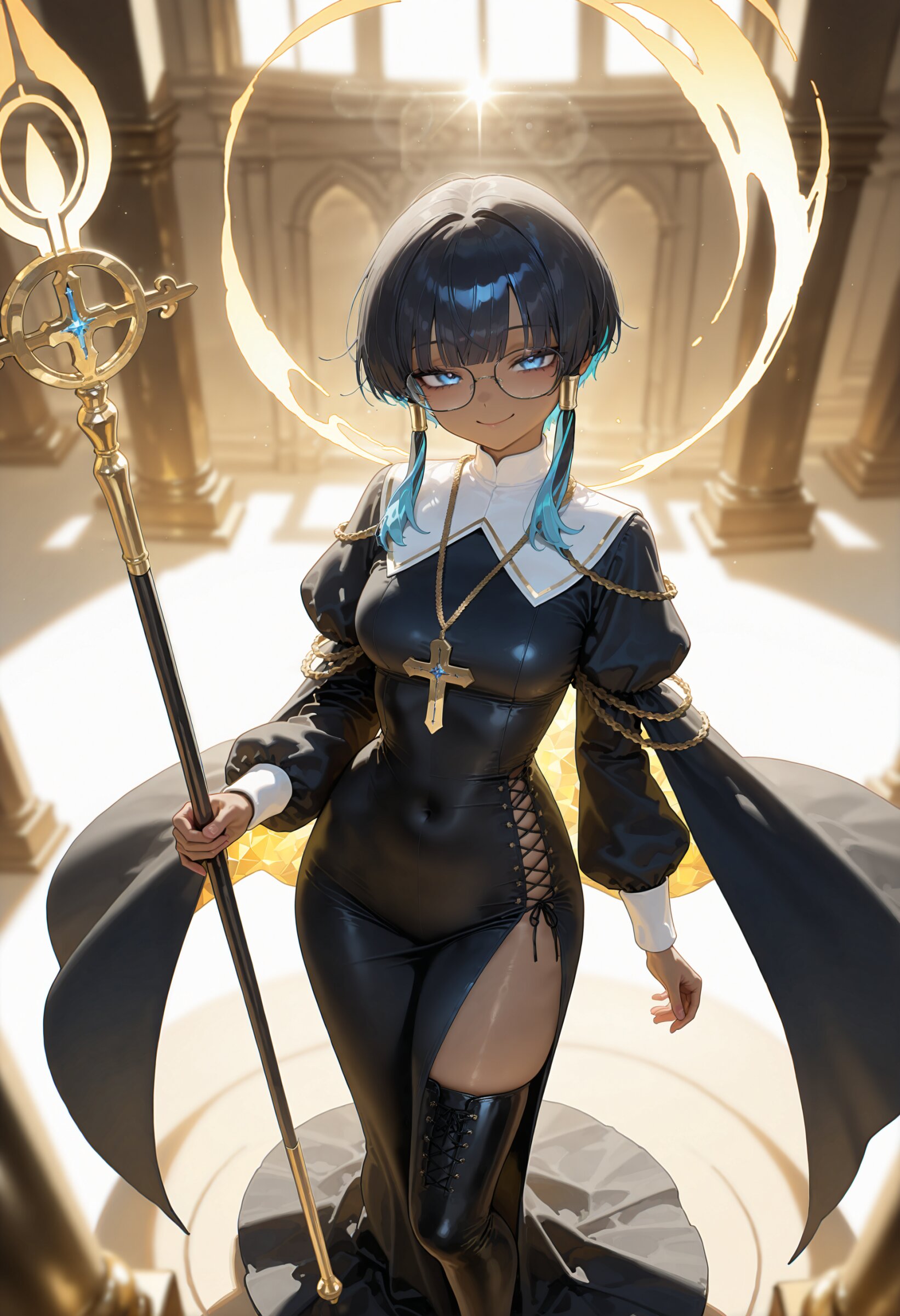 (fisheye,fisheye lens angle:1.0), focus head, looking at viewer, 1girl, nun, beautiful detailed eyes, holy face, cool Elegant and sophisticated demeanor, (dark skin:1.0), skindentation, beautiful cobalt blue eyes, half-closed eyes , two-tone hair, olive and pale blue hair, short hair, spiked hair,Bowl cut , hair tubes, first-rate female bodies perfect body beautiful medium breasts medium hips, (divine,Holy,goddess:1.0),, nun,Gold hair ornaments, laced cape, cloak, majestic Pulpit gown, puffy sleeves, , , , , , ,, high-waist skirt, long skirt, thigh boots, curious expression, inquisitive, intrigued, interested, (mischievous smile:1.0), God Light, (intricate), opulent, lustrous, holy outfit, A solemn atmosphere of piety, ascetic manner, indoor, abbey of Mont Saint-Michel, altar, , mage staff, holy light, beautiful morning, divine energy aura, healing atmosphere, akanbe depth of field, bokeh, super fine concept art, hard surface, 8K, unreal engine, glasses, masterpiece, best quality, amazing quality, very aesthetic, absurdres, you can add tag scenery, (volumetric lighting), To make the background more distinctive. professional art lots of details, , overexposure, shiny-glistening, (watercolor style:1.0), (pastel color style:1.0) <lora:noline (1):-0.5> <lora:sdxl2-flat2-512b:0.2> <lora:facelightup_xl_v10:0.5>
